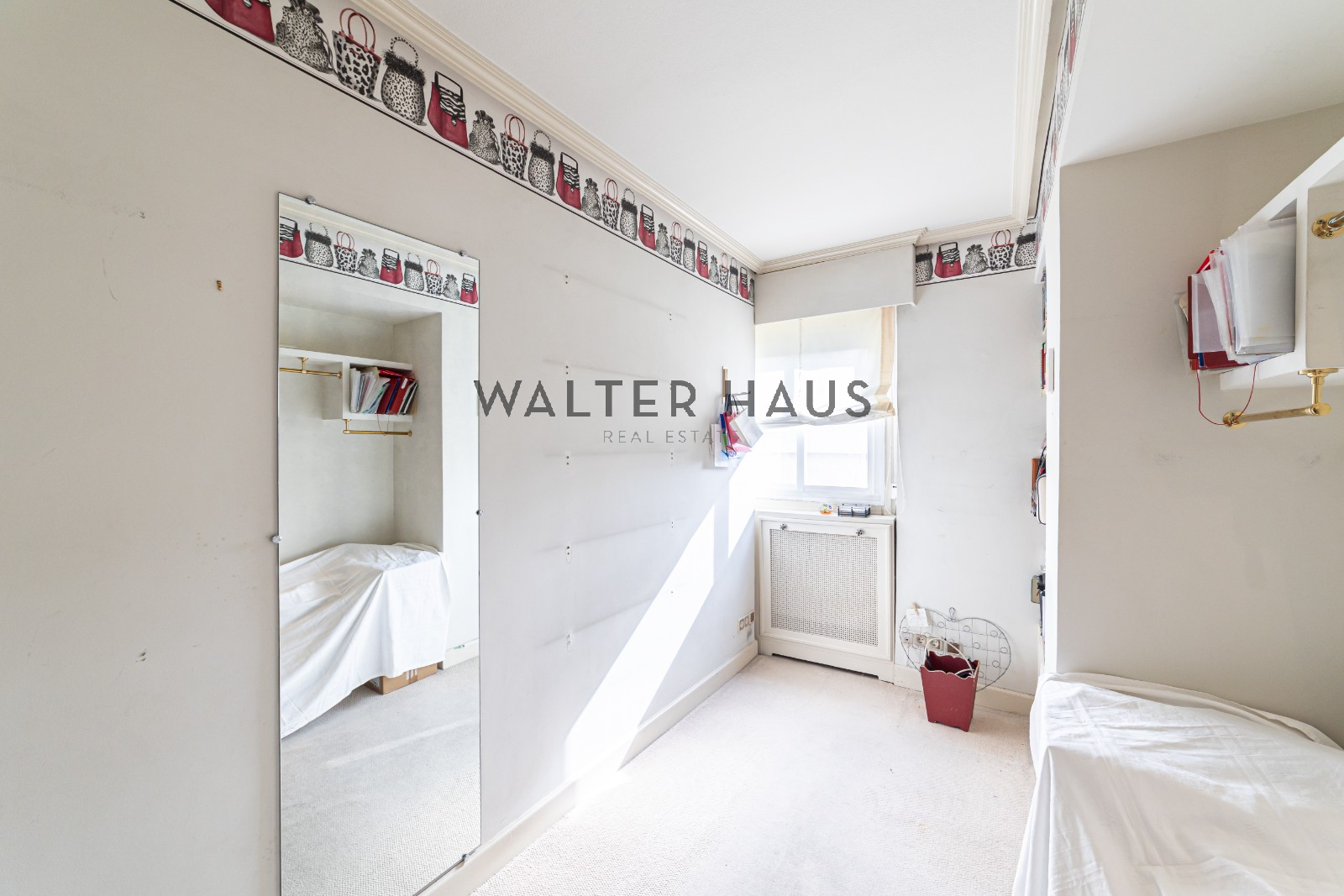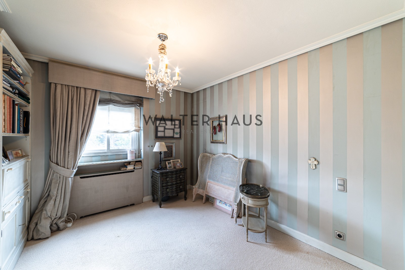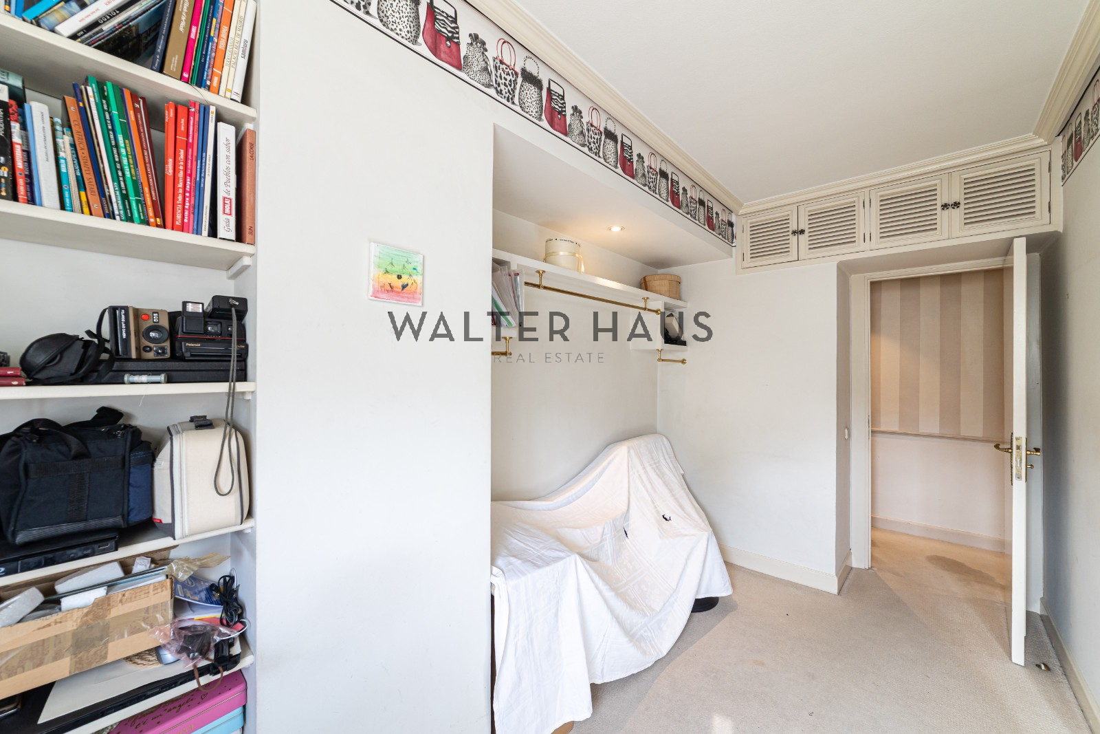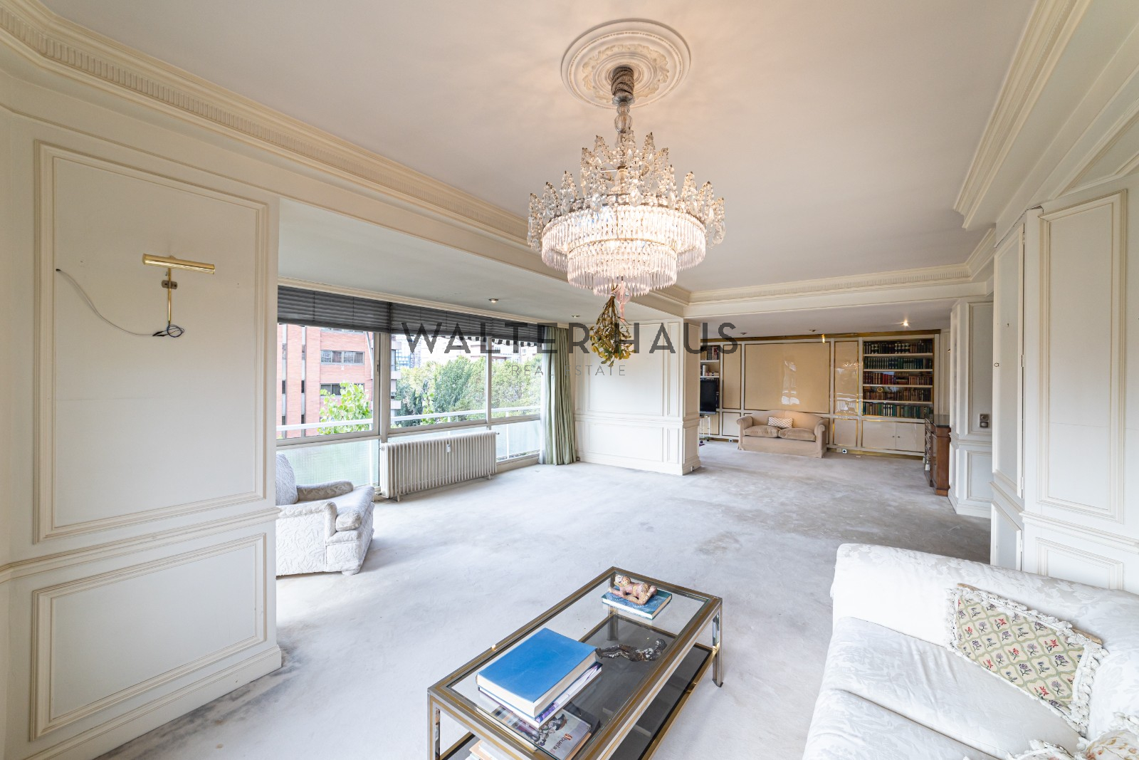 L’aménagement intérieur soigné débute par un élégant hall de réception, équipé d’un dressing pratique. Le spacieux séjour, divisé en trois espaces, constitue le cœur de la maison, remarquable par ses grandes fenêtres offrant une vue imprenable sur le Paseo de la Habana. L’espace nuit comprend quatre chambres au total : une suite parentale donnant sur l’extérieur avec salle de bains privative et grands placards intégrés, et deux autres chambres, également extérieures, partageant une seconde salle de bains. La cuisine séparée comprend un petit bureau et dispose d’une porte de service, ainsi que d’une buanderie. La propriété dispose également d’un débarras et d’un service de conciergerie.