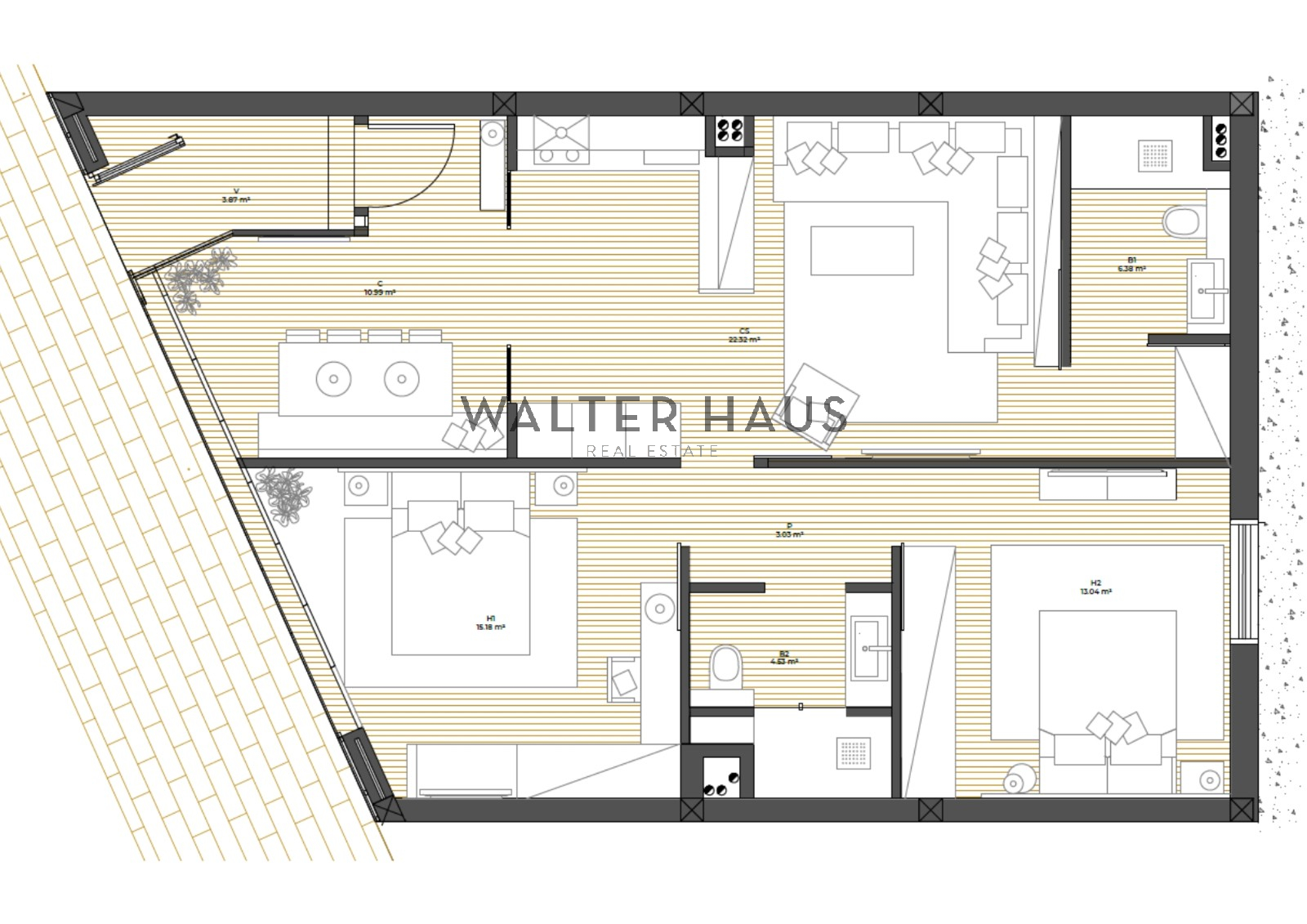 Le certificat d’occupation est en cours de traitement. Cet appartement de 91 m² au rez-de-chaussée, comprenant 2 chambres et 2 salles de bain, est situé dans un projet innovant du quartier de Can Baró, dans un quartier résidentiel calme, à proximité immédiate d’espaces verts, de parcs et de commerces.