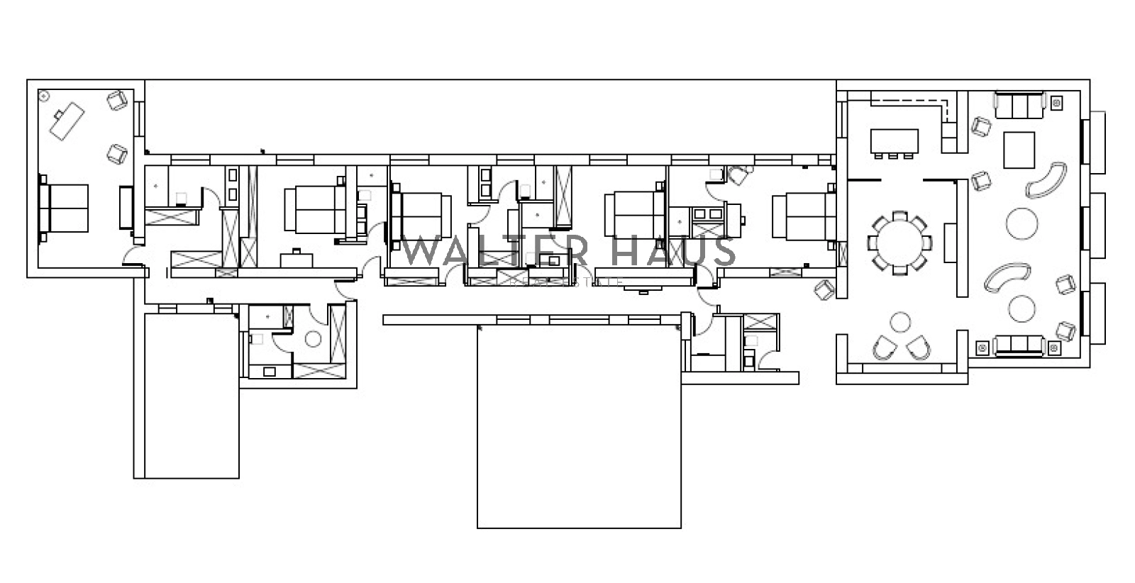 Le projet de rénovation permet la création d’un vaste séjour ouvert, divisé en deux espaces distincts, et d’une salle familiale. Une cuisine semi-intégrée, équipée d’électroménagers intégrés et d’un bar pour trois personnes, peut être aménagée et communiquer avec une salle à manger pouvant accueillir huit convives, ainsi qu’avec des toilettes invités et une buanderie. L’espace plus intime peut accueillir cinq chambres doubles, chacune avec sa propre salle de bains et des placards du sol au plafond. La suite parentale dispose d’un grand dressing.