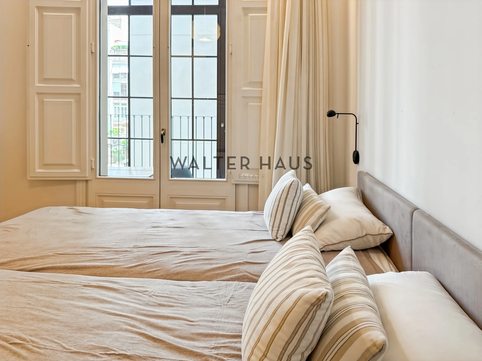 L’espace de vie comprend un vaste séjour, une cuisine américaine moderne entièrement équipée d’électroménager haut de gamme et de finitions blanches, ainsi qu’un coin repas. De là, deux balcons accueillants donnent sur la rue Girona. L’espace nuit se compose de trois chambres doubles extérieures, dont une suite parentale avec dressing. Les deux autres chambres donnent accès à une galerie vitrée lumineuse. Cet espace comprend également une salle de bain complète et des toilettes invités.