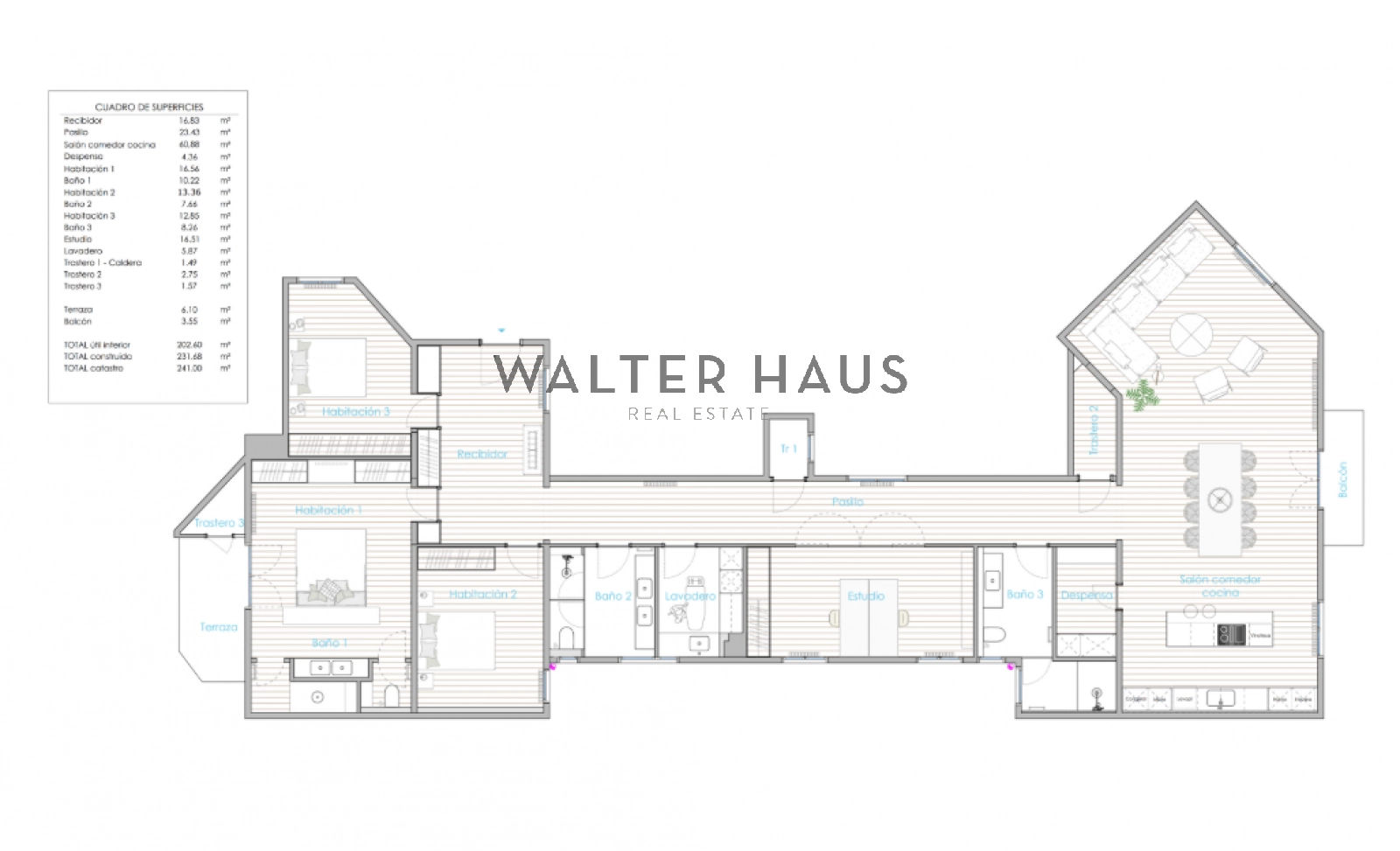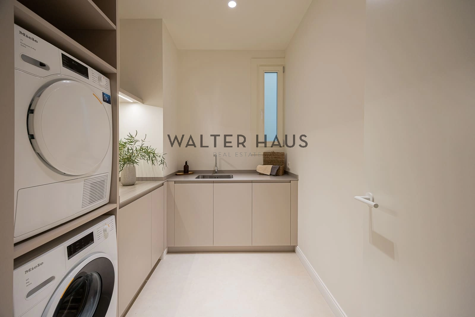 L’appartement comprend un vaste séjour/salle à manger avec cuisine ouverte, parfaitement intégré à l’espace et donnant sur un balcon extérieur, créant ainsi une atmosphère chaleureuse et aérée. L’espace nuit se compose de trois grandes chambres, dont une avec salle de bains privative, ainsi que d’un espace supplémentaire pouvant servir de bureau, d’espace de travail ou de chambre d’amis. Deux salles de bains supplémentaires complètent cet espace. Le bien comprend également un cellier fonctionnel, trois pièces de rangement et de nombreux espaces de rangement pour optimiser l’espace. Il bénéficie en outre d’une terrasse privative et de balcons à la française, qui ajoutent une valeur esthétique et fonctionnelle.
