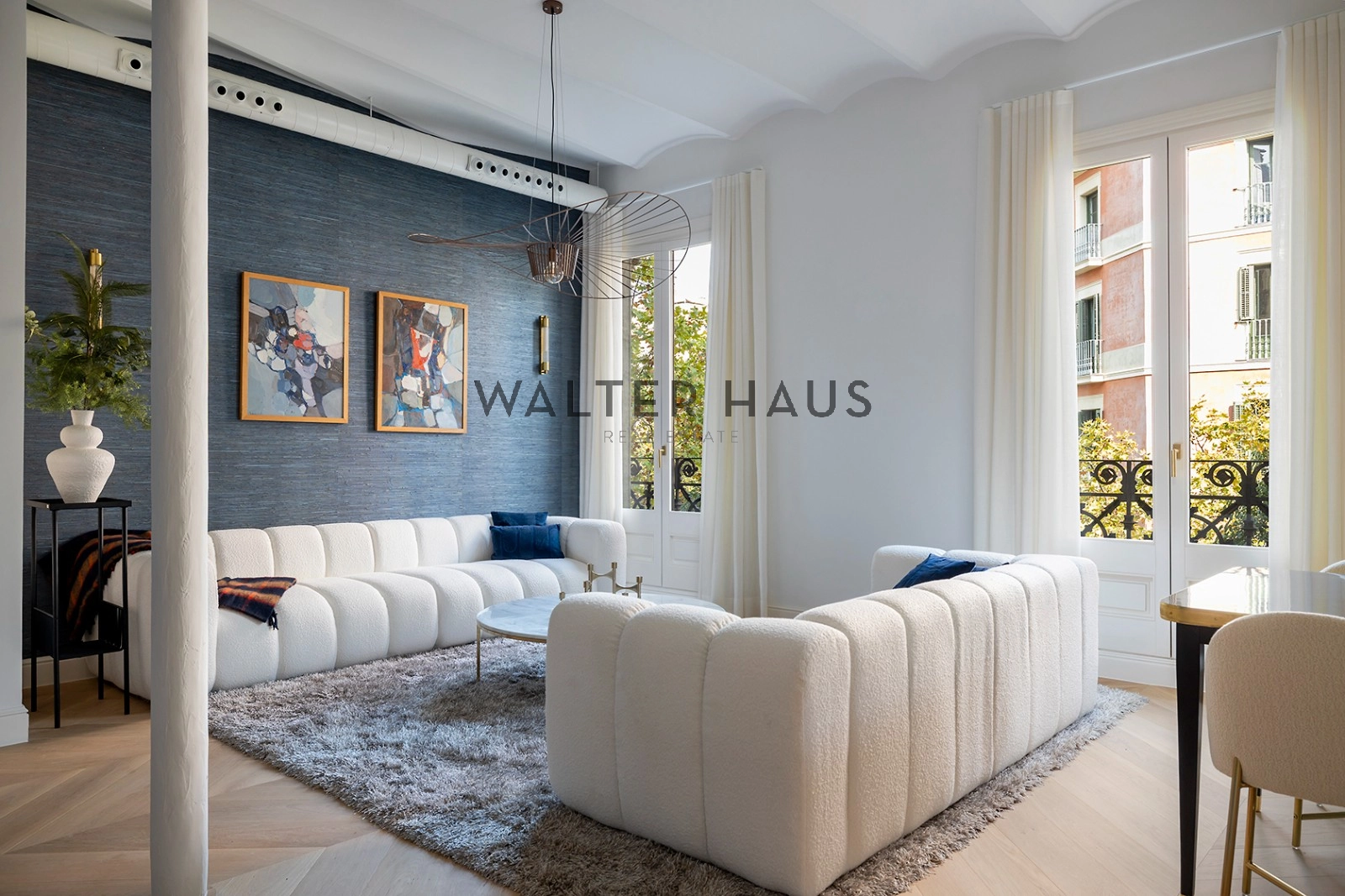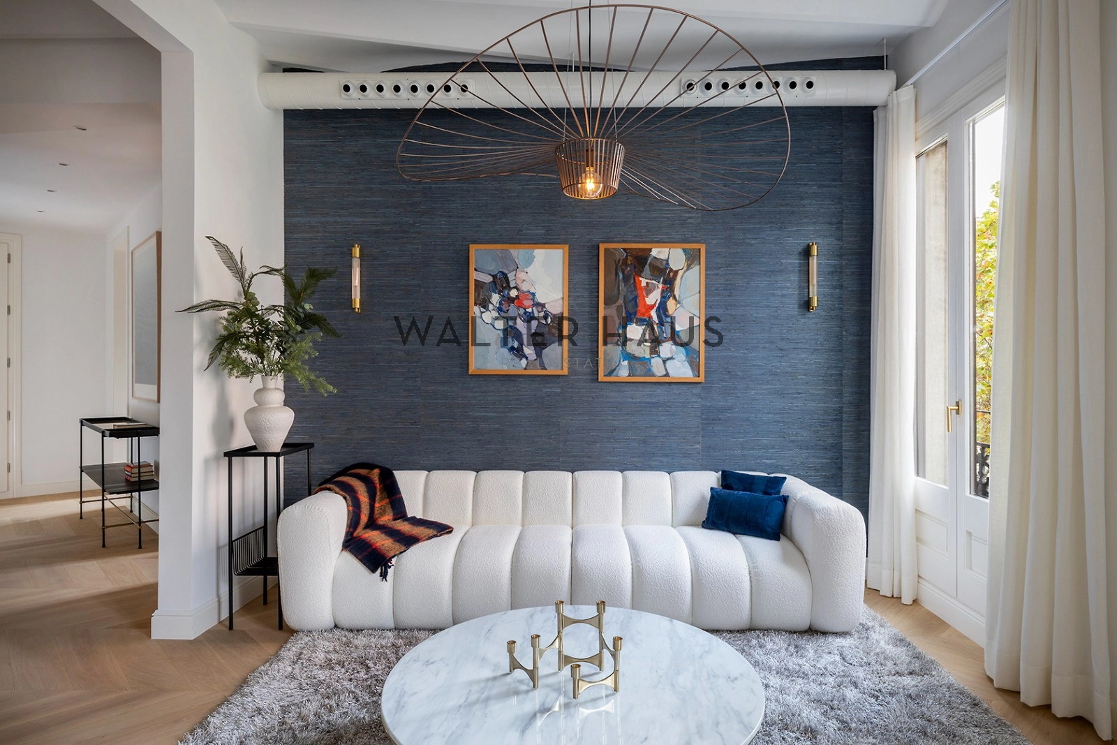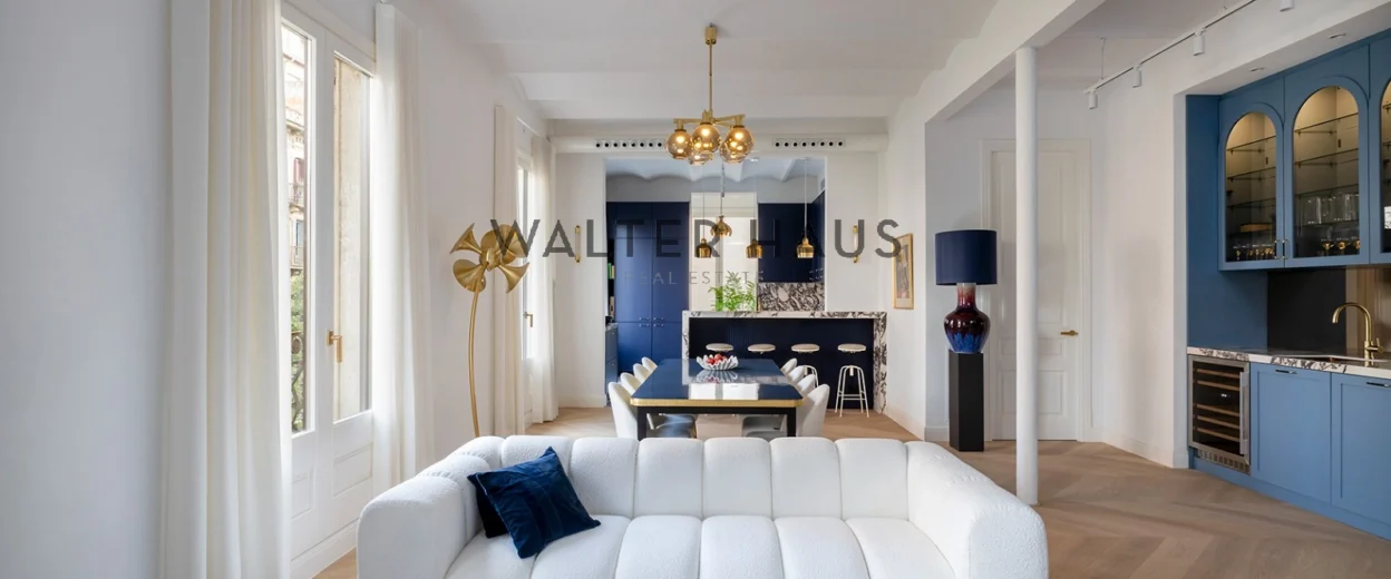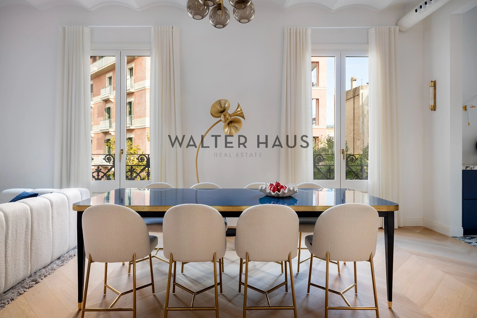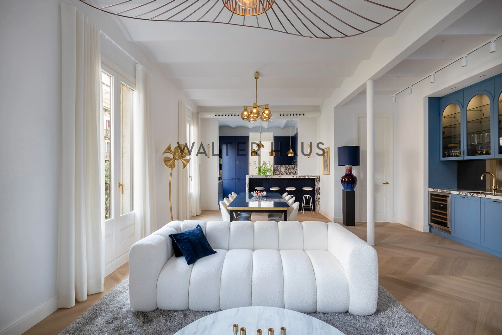 Appartement exclusif de 183 m² entièrement rénové, situé au troisième étage d’un immeuble classique de la rue Girona, dans le quartier très prisé de l’Eixample à Barcelone. Actuellement en rénovation et dont la livraison est prévue dans cinq mois, cet appartement offre des volumes exceptionnels, une luminosité naturelle abondante et un design contemporain. Cinq fenêtres de type balcon donnant sur la rue inondent l’espace de lumière naturelle et mettent en valeur chaque détail architectural.