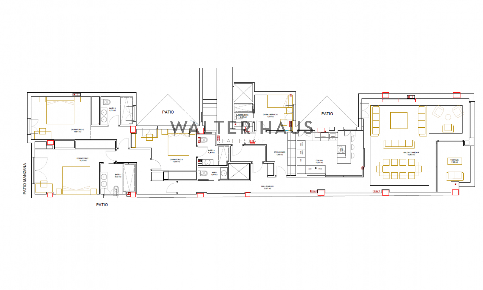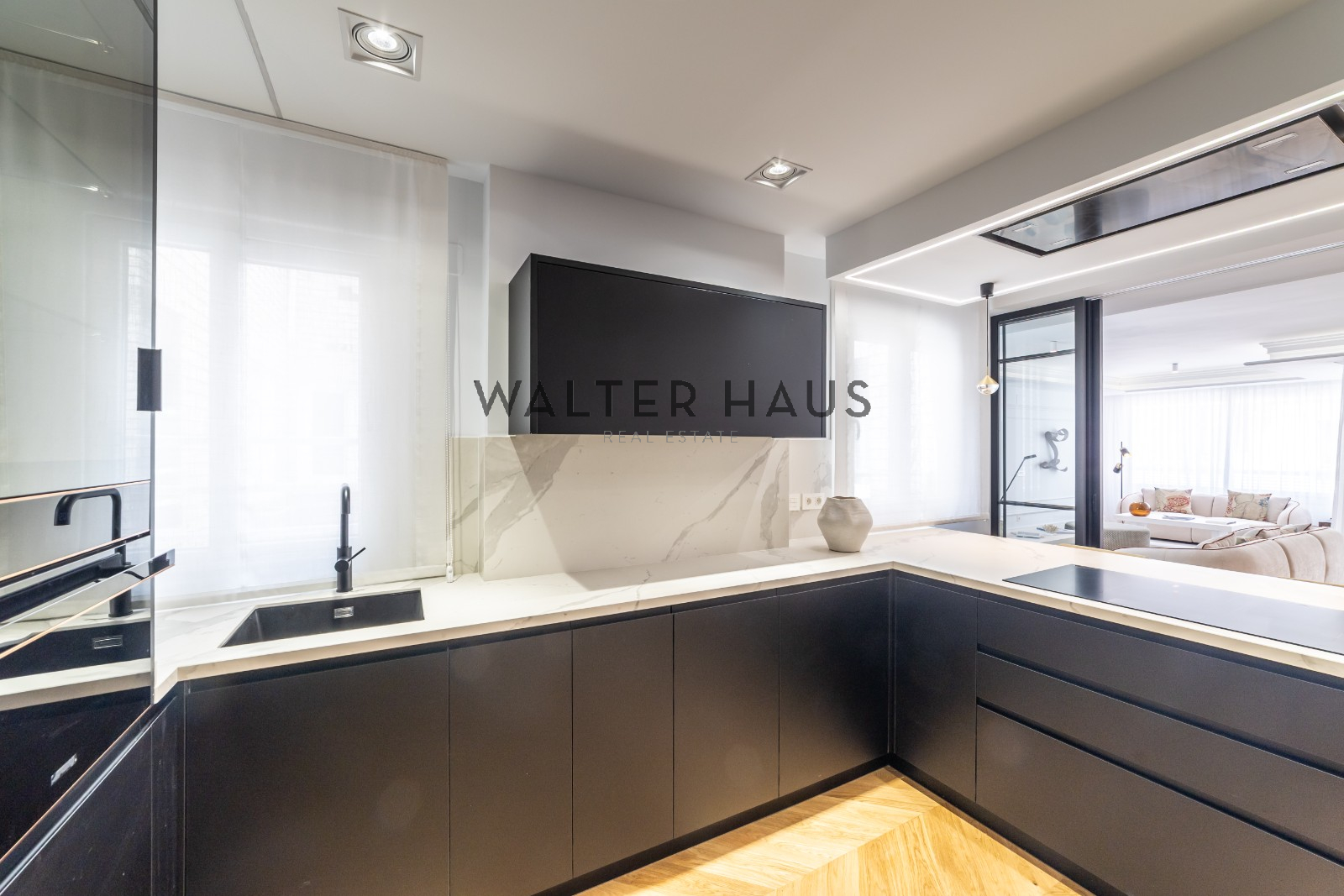 Cet appartement dispose de trois chambres en suite, chacune avec sa propre salle de bain complète, ainsi que d’une chambre supplémentaire pour le personnel. Au total, la propriété offre trois salles de bain complètes et des toilettes invités. La cuisine moderne et semi-intégrée dispose d’un grand îlot central et est entièrement équipée d’appareils électroménagers haut de gamme. Le spacieux salon-salle à manger, baigné de lumière naturelle, s’ouvre sur une accueillante terrasse exposée ouest, idéale pour profiter du plein air.