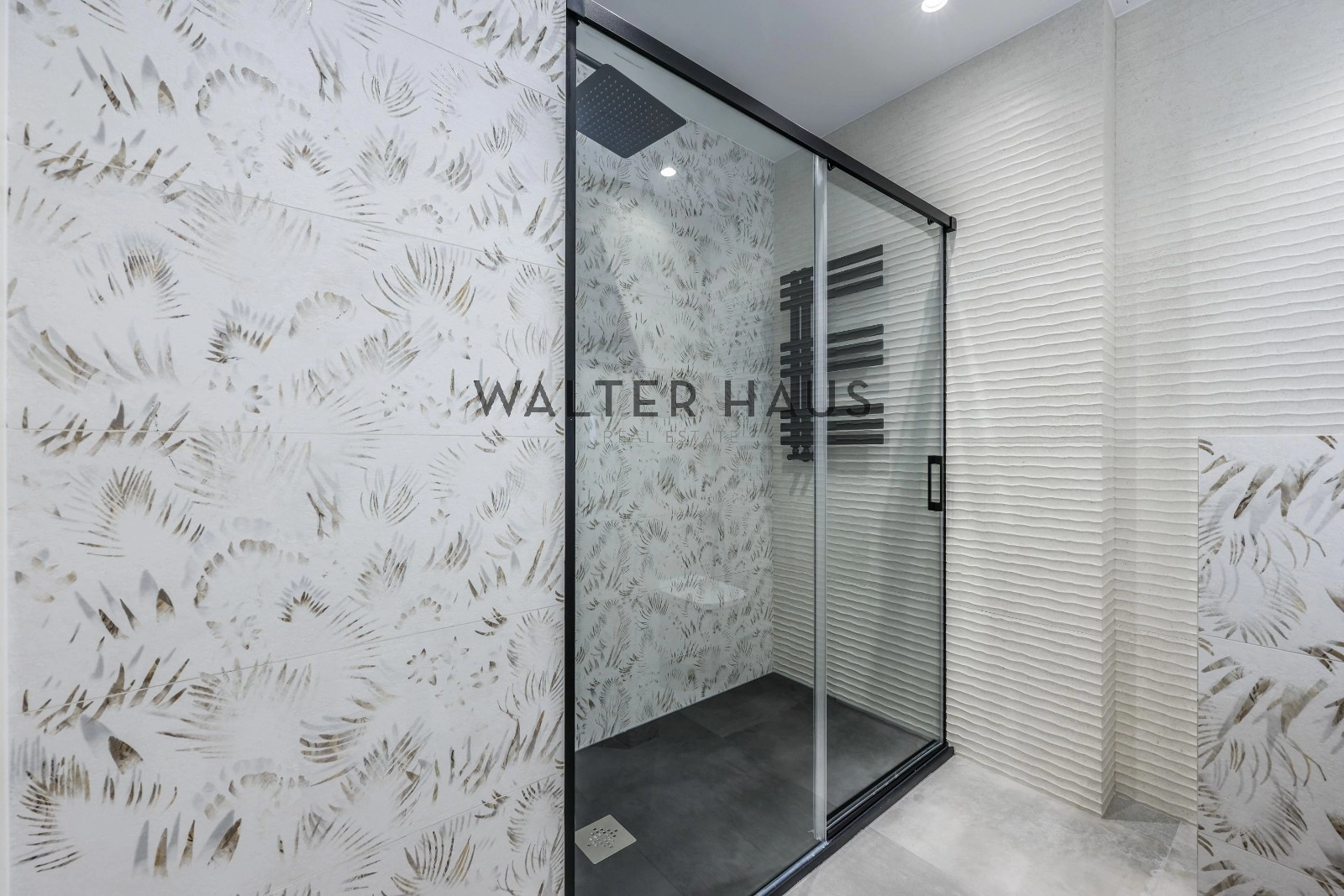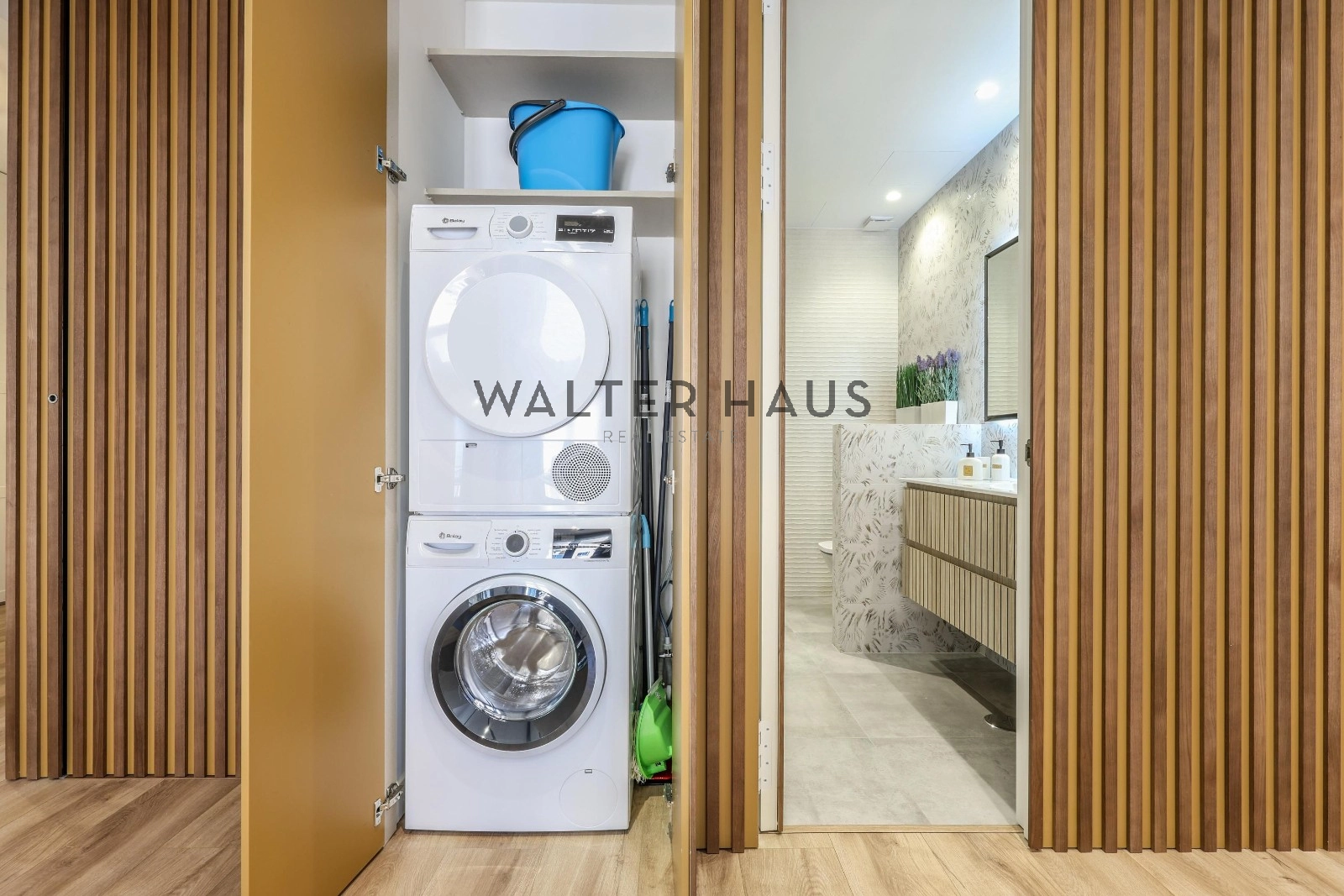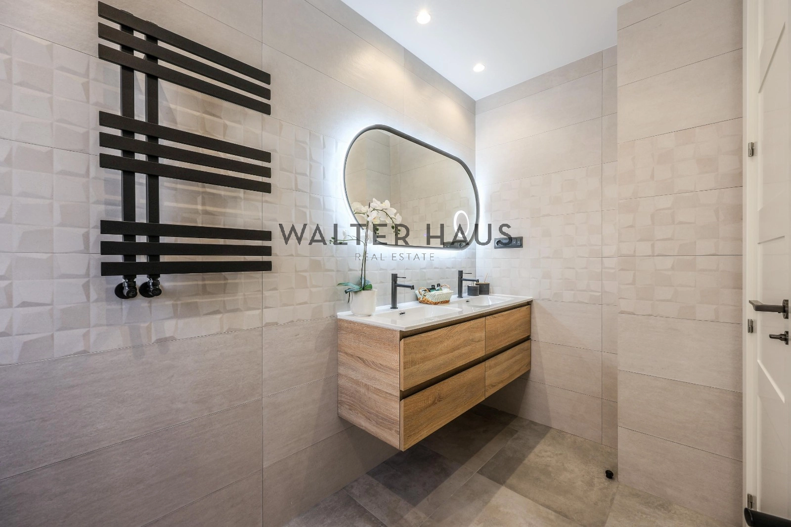 L’appartement dispose d’une cuisine design intégrée au salon-salle à manger, dotée d’une grande fenêtre pour une excellente ventilation. Équipée d’appareils électroménagers encastrés haut de gamme, elle offre de nombreux rangements. Attenante à la cuisine se trouve une buanderie discrète avec lave-linge. L’espace nuit se compose de trois chambres, dont deux doubles, toutes dotées de grands placards intégrés. La chambre principale comprend une salle de bain attenante très confortable avec une douche spacieuse. Une deuxième salle de bain complète avec douche dessert le reste de la maison.