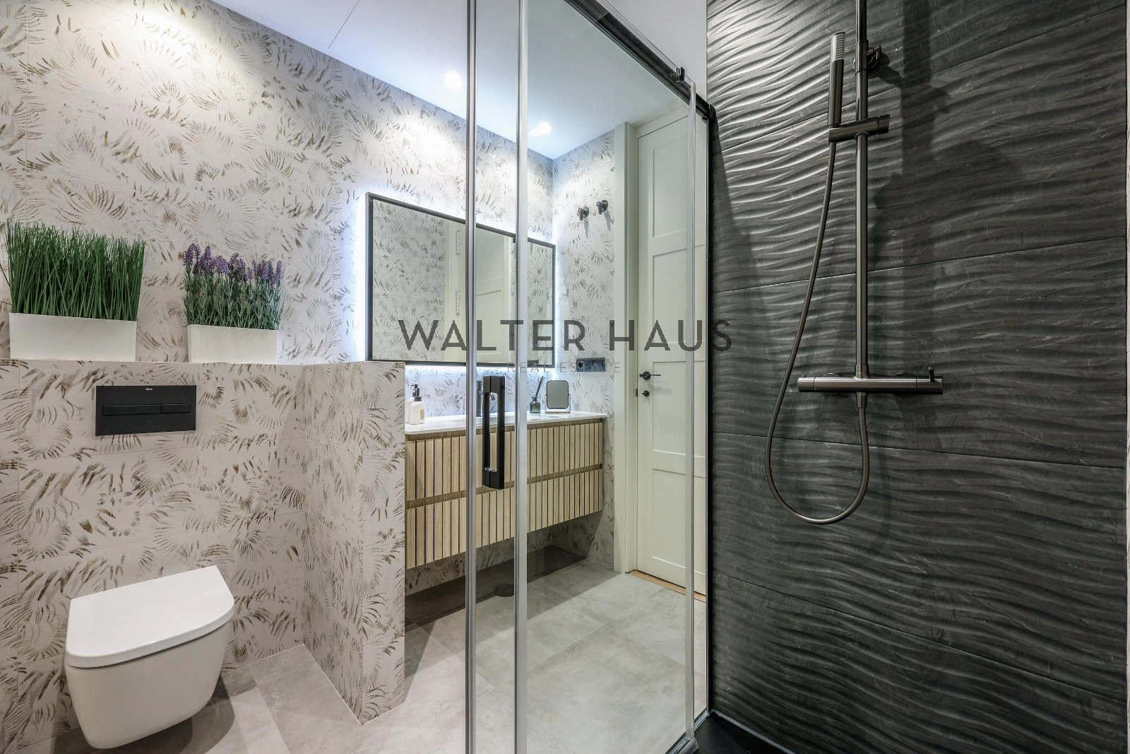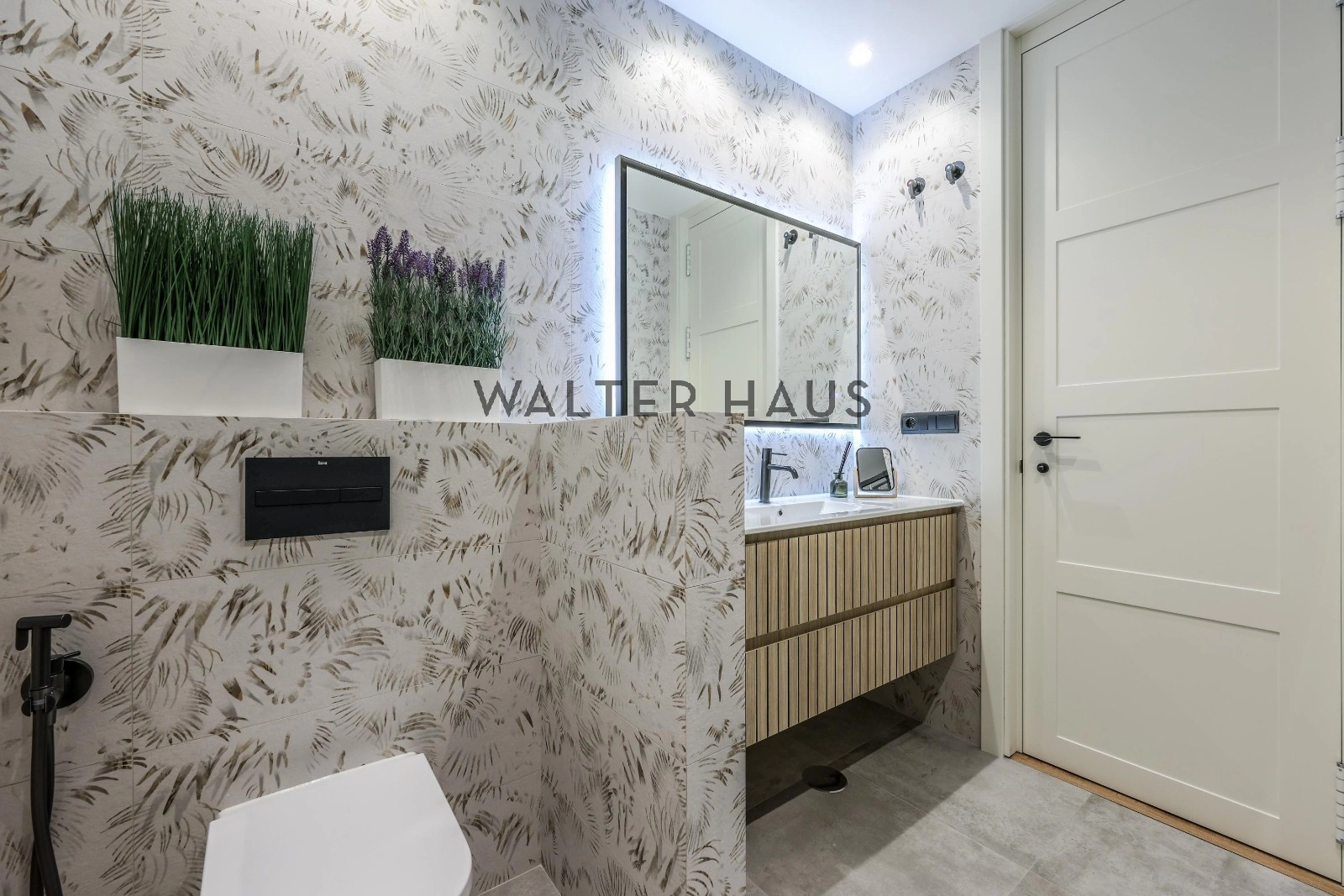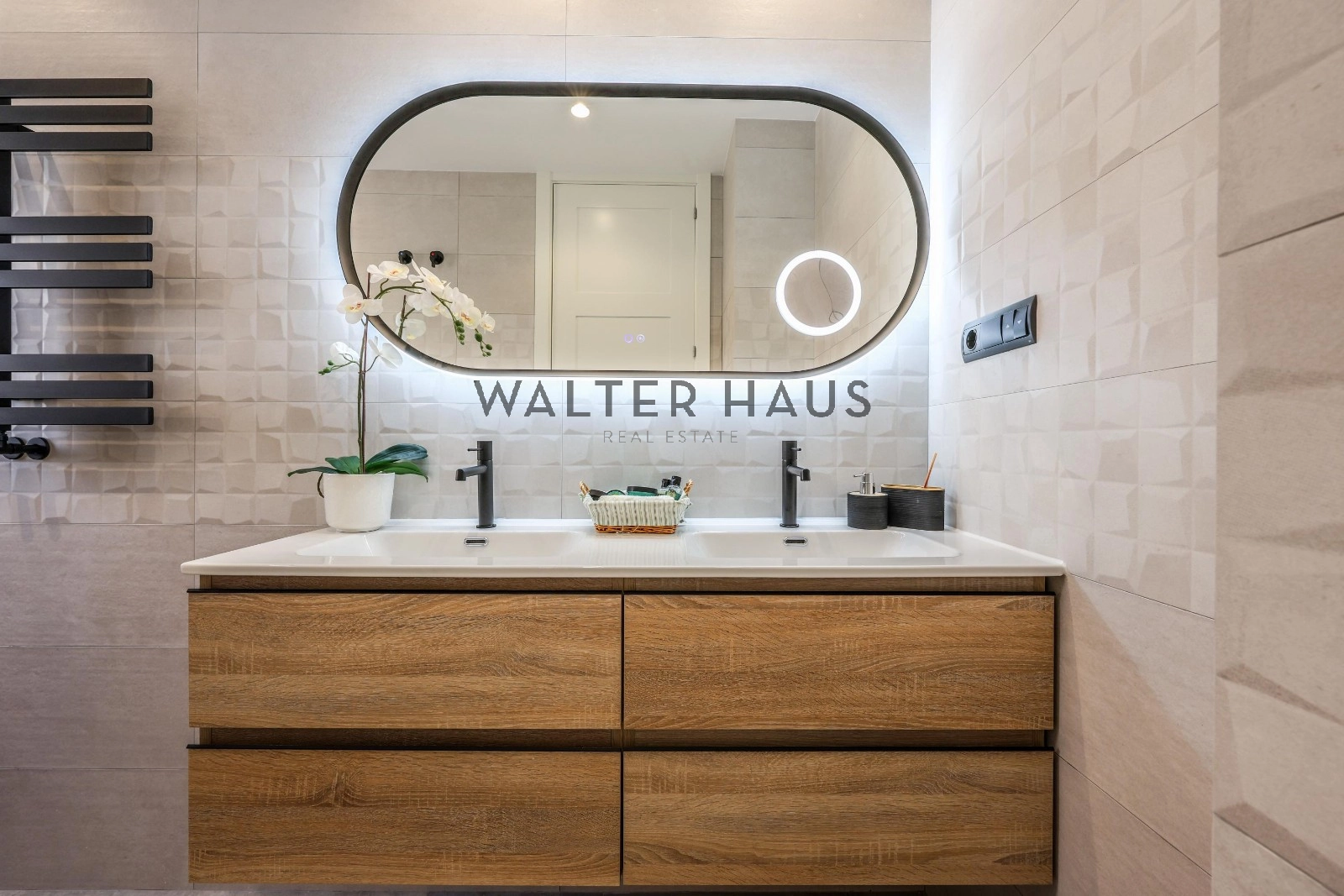 L’appartement dispose d’une cuisine design intégrée au salon-salle à manger, dotée d’une grande fenêtre pour une excellente ventilation. Équipée d’appareils électroménagers encastrés haut de gamme, elle offre de nombreux rangements. Attenante à la cuisine se trouve une buanderie discrète avec lave-linge. L’espace nuit se compose de trois chambres, dont deux doubles, toutes dotées de grands placards intégrés. La chambre principale comprend une salle de bain attenante très confortable avec une douche spacieuse. Une deuxième salle de bain complète avec douche dessert le reste de la maison.
