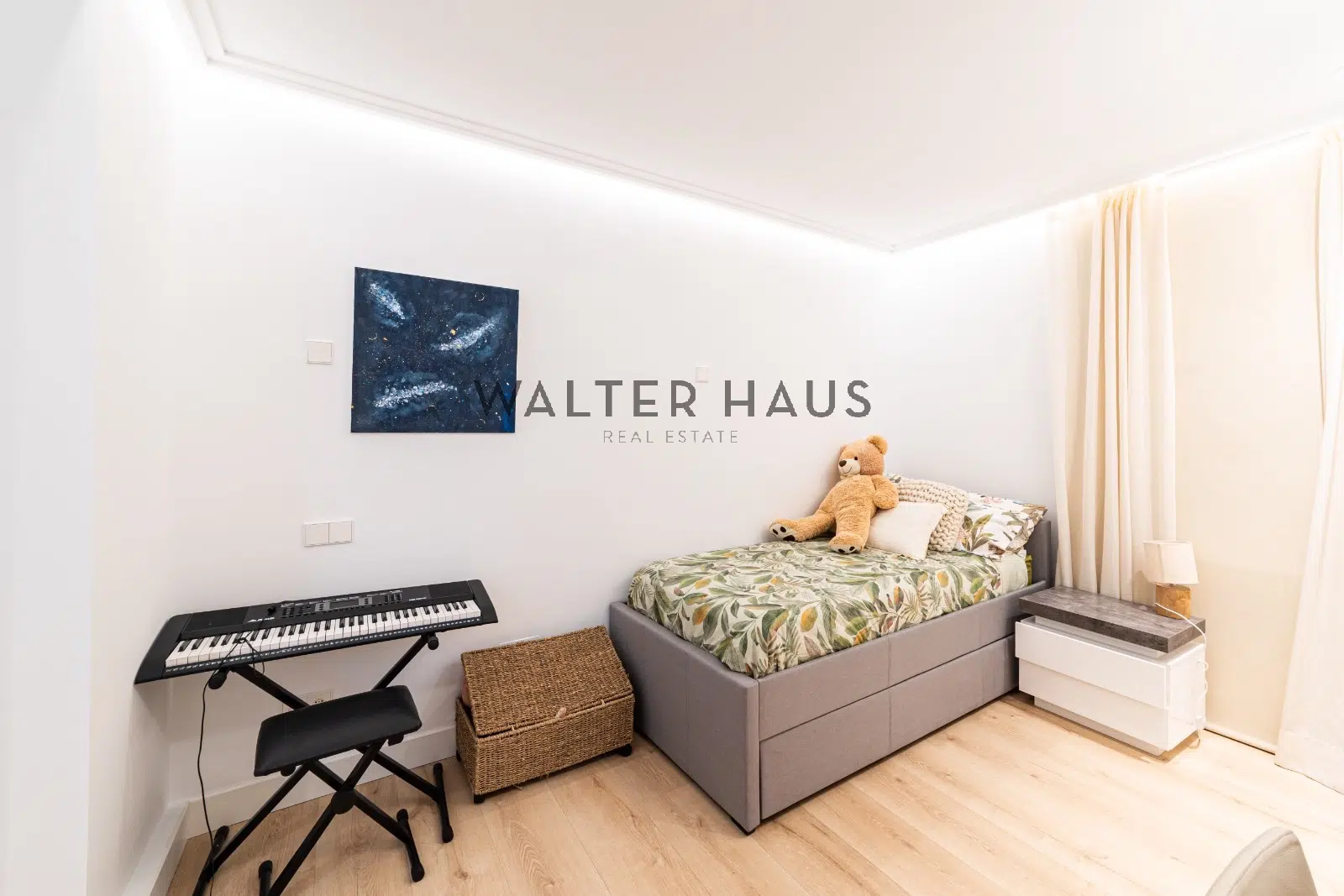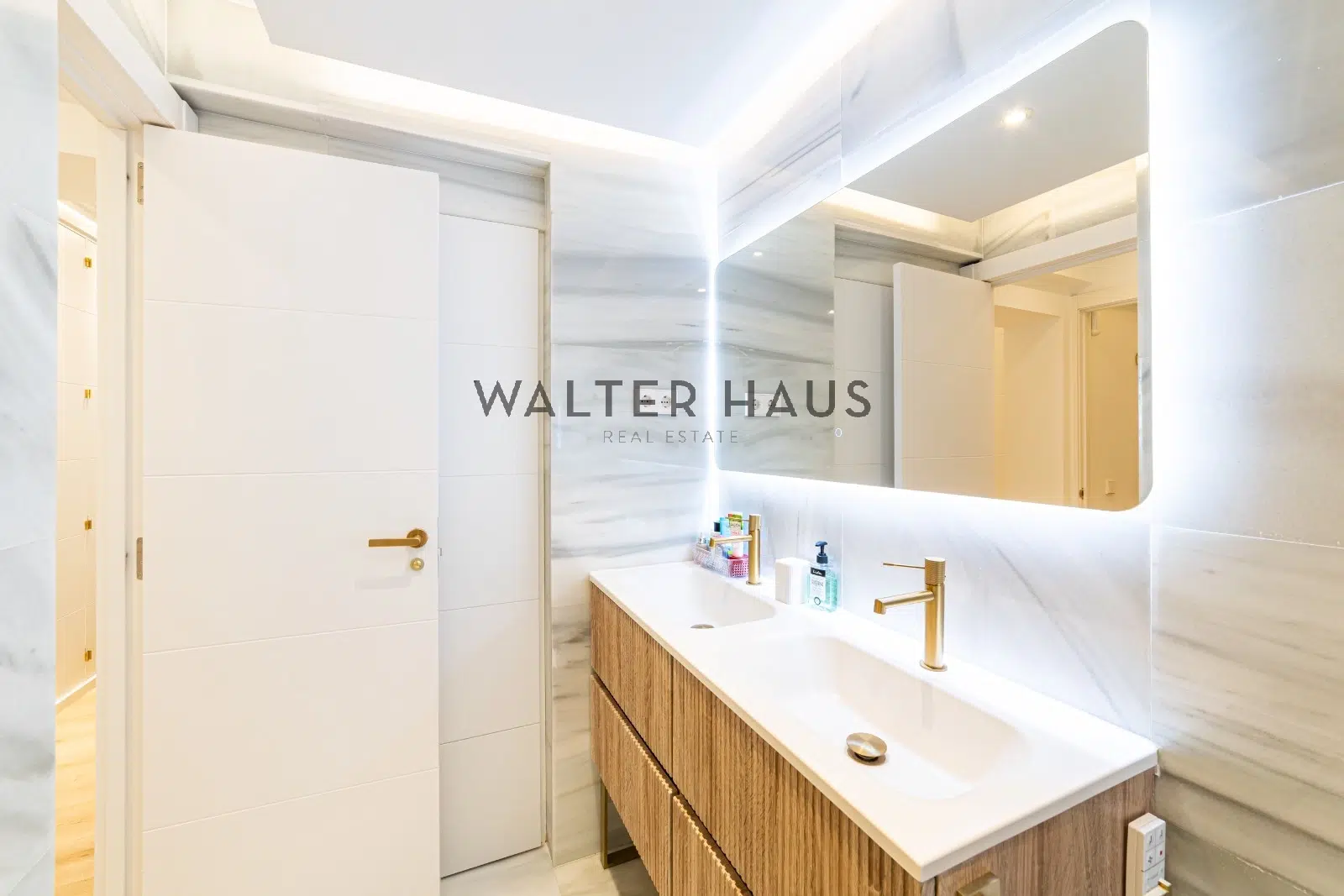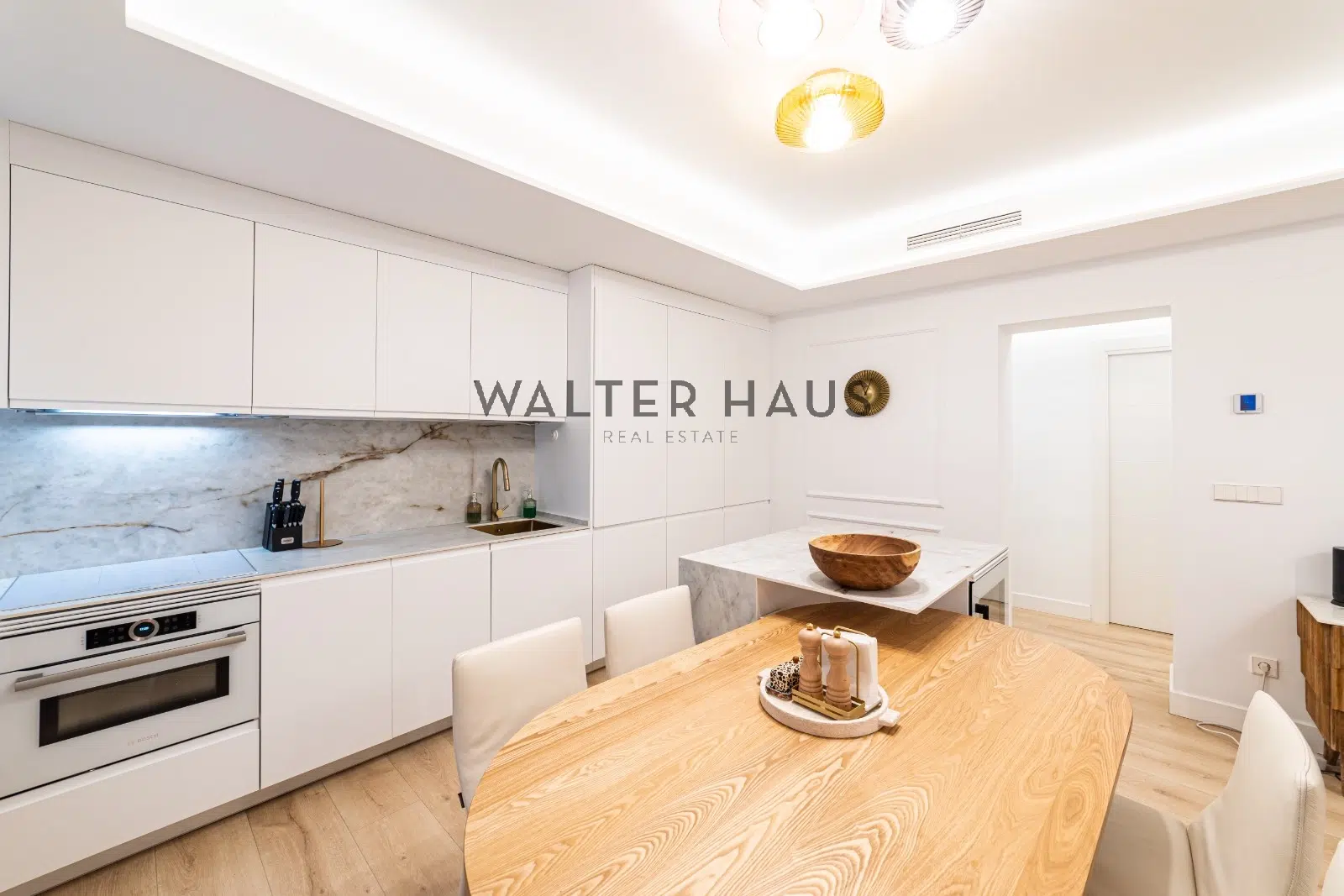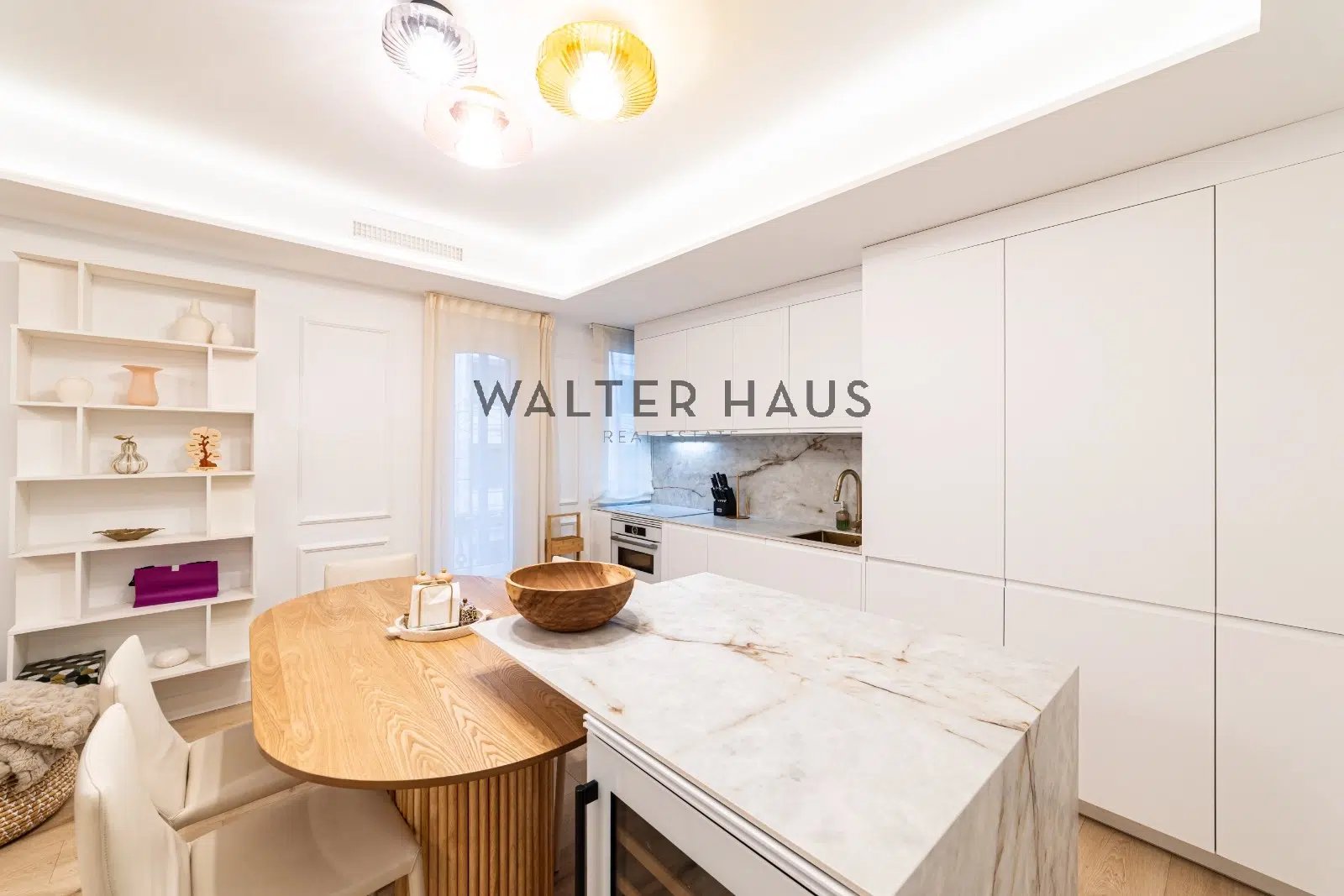 Côté technique, l’appartement a été modernisé avec des matériaux de haute qualité pour les finitions, les fenêtres et la climatisation. La cuisine, harmonieusement intégrée, est équipée de meubles sur mesure et d’électroménagers de pointe. L’espace nuit comprend trois chambres doubles, chacune configurée comme une suite indépendante avec sa propre salle de bains privative. Ces salles de bains sont dotées de finitions en pierre naturelle et d’équipements design, tandis que les chambres disposent de placards intégrés du sol au plafond offrant un grand espace de rangement, garantissant un confort optimal et une intimité absolue.