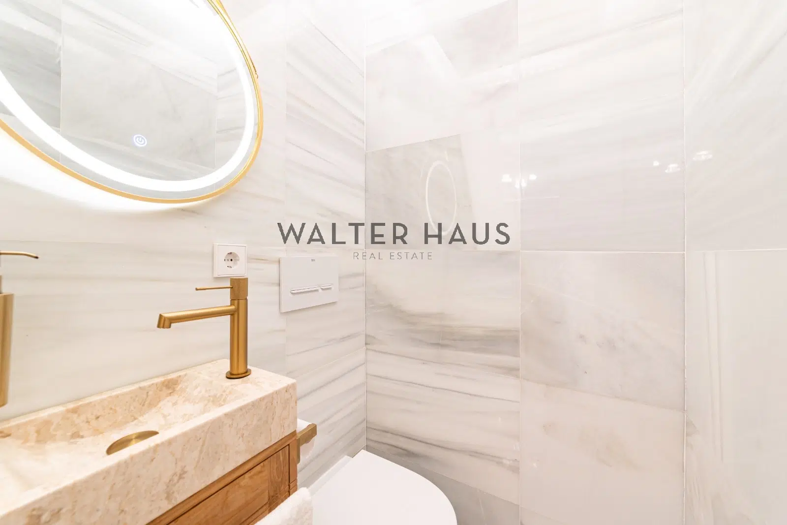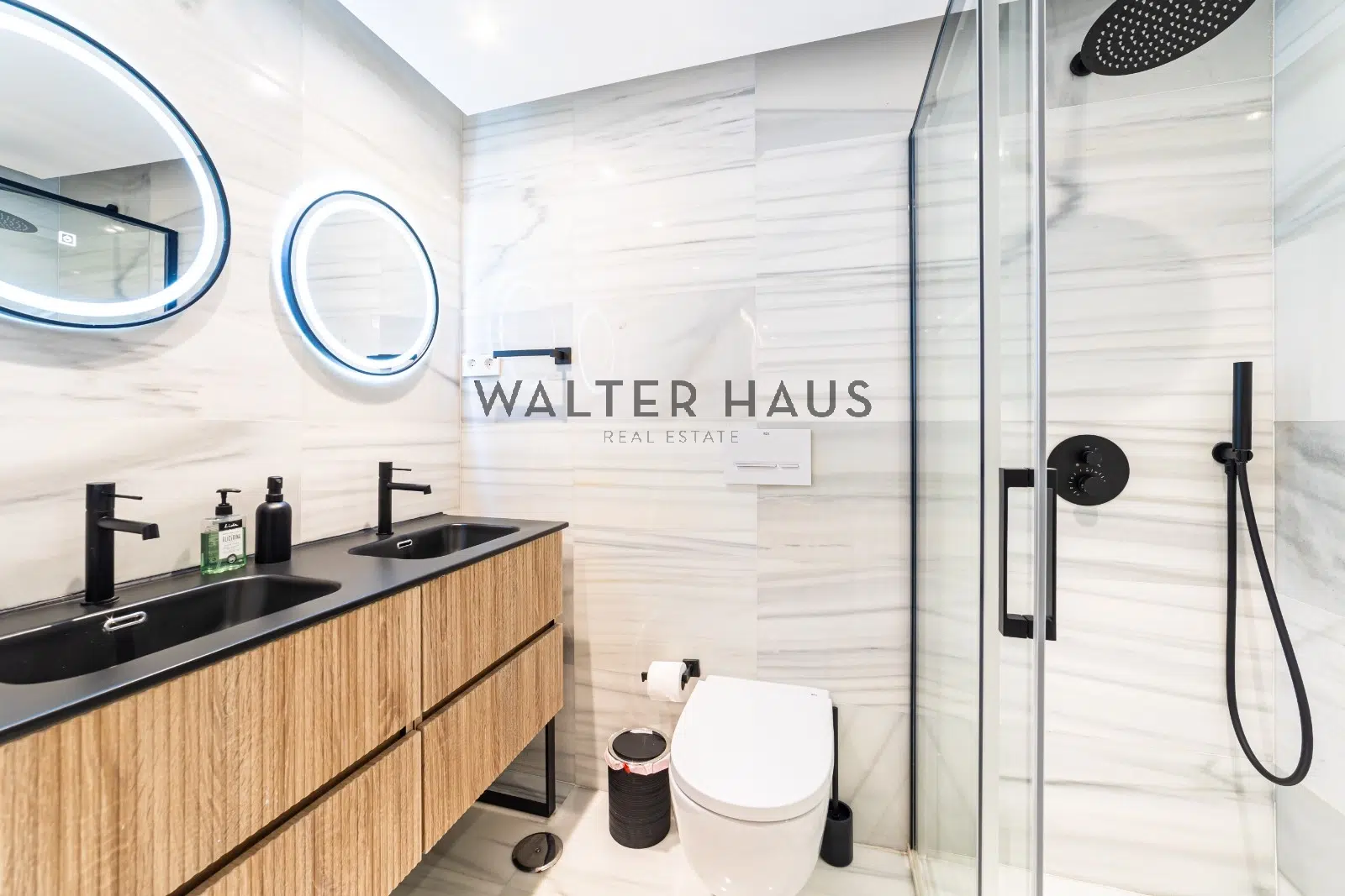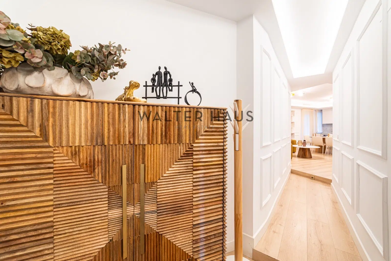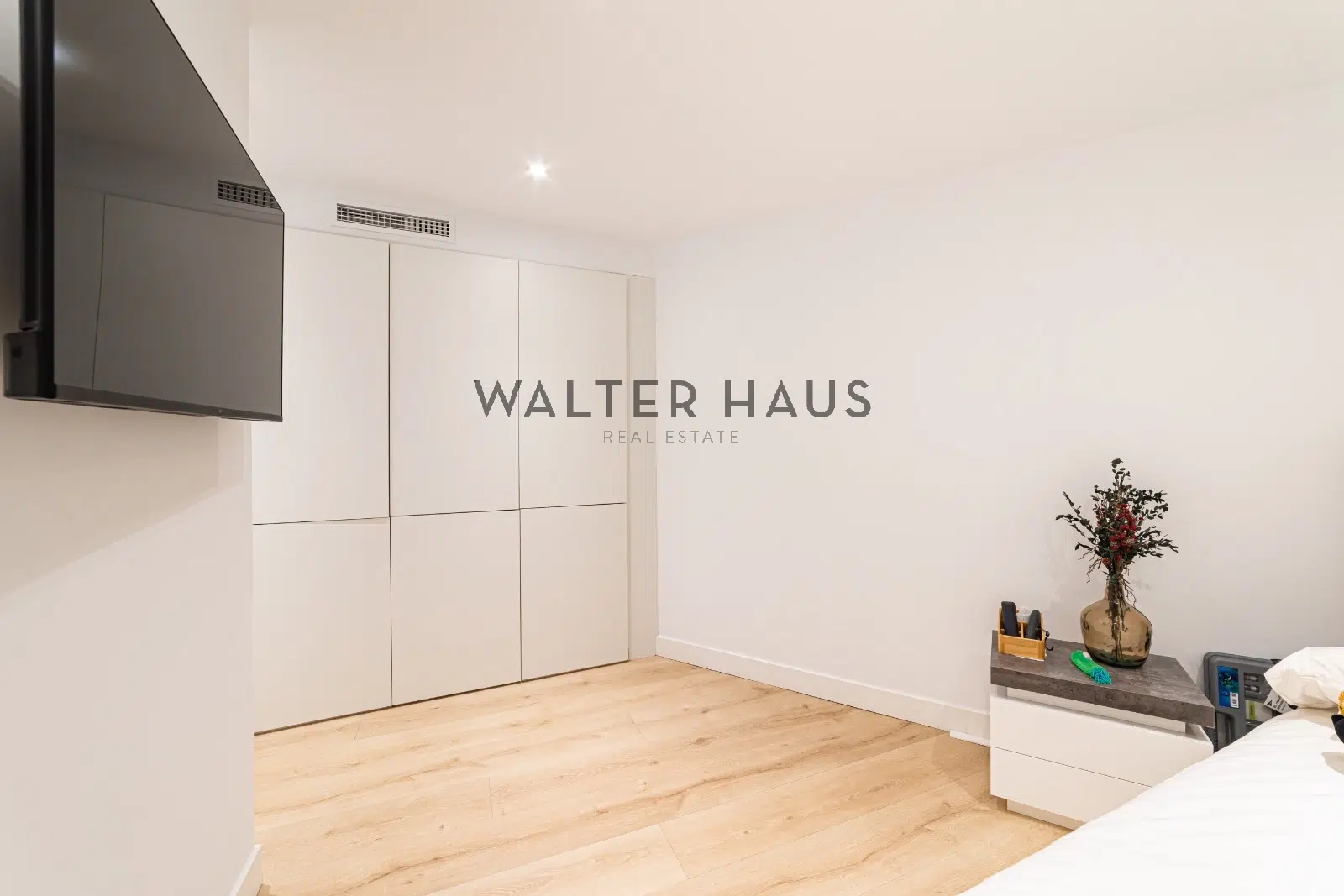 Côté technique, l’appartement a été modernisé avec des matériaux de haute qualité pour les finitions, les fenêtres et la climatisation. La cuisine, harmonieusement intégrée, est équipée de meubles sur mesure et d’électroménagers de pointe. L’espace nuit comprend trois chambres doubles, chacune configurée comme une suite indépendante avec sa propre salle de bains privative. Ces salles de bains sont dotées de finitions en pierre naturelle et d’équipements design, tandis que les chambres disposent de placards intégrés du sol au plafond offrant un grand espace de rangement, garantissant un confort optimal et une intimité absolue.