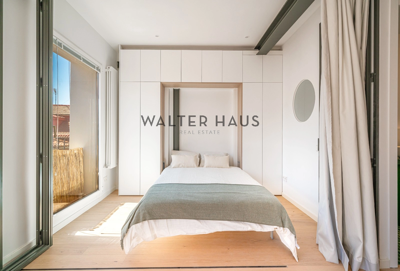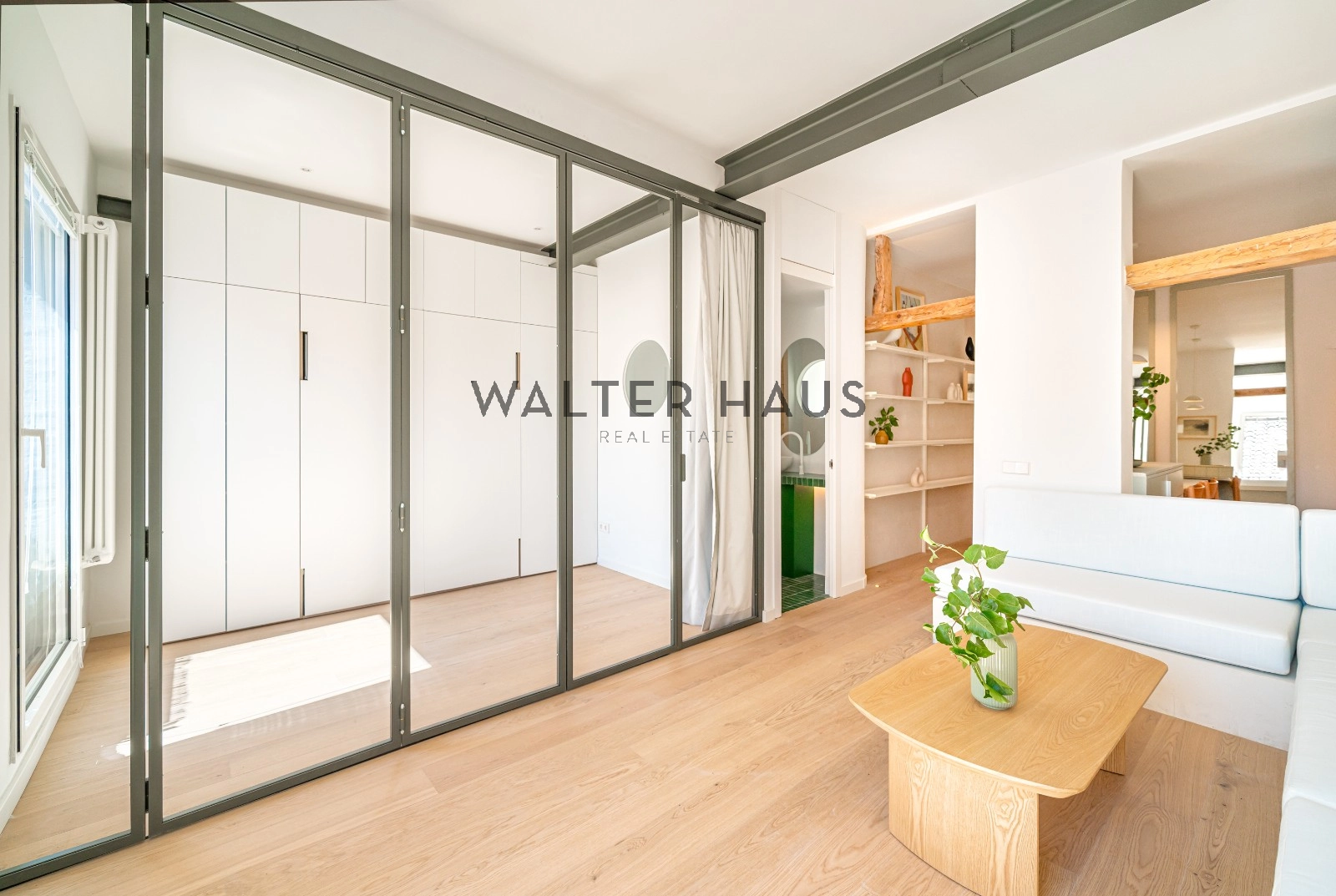 L’architecture du projet a su trouver un équilibre parfait entre esthétique moderne et fonctionnalité. L’appartement se distingue par son souci du détail et la qualité de ses finitions sur mesure : la cuisine, les placards intégrés et les équipements de salle de bains ont été spécialement conçus pour l’espace. Il dispose d’élégantes douches à l’italienne et d’un chaleureux parquet qui créent une atmosphère accueillante et conviviale. L’agencement est remarquable pour son vaste espace de vie ouvert qui réunit la cuisine, la salle à manger et le salon, créant ainsi un lieu de vie idéal. La chambre principale dispose d’une salle de bains privative, tandis que la seconde chambre offre un précieux dressing intégré. De plus, une ingénieuse pièce modulable vitrée avec un lit escamotable permet de l’aménager en bureau ou en chambre d’amis supplémentaire. Deux balcons donnant sur la rue et offrant une vue imprenable sur les toits de Madrid complètent le charme de cette demeure.