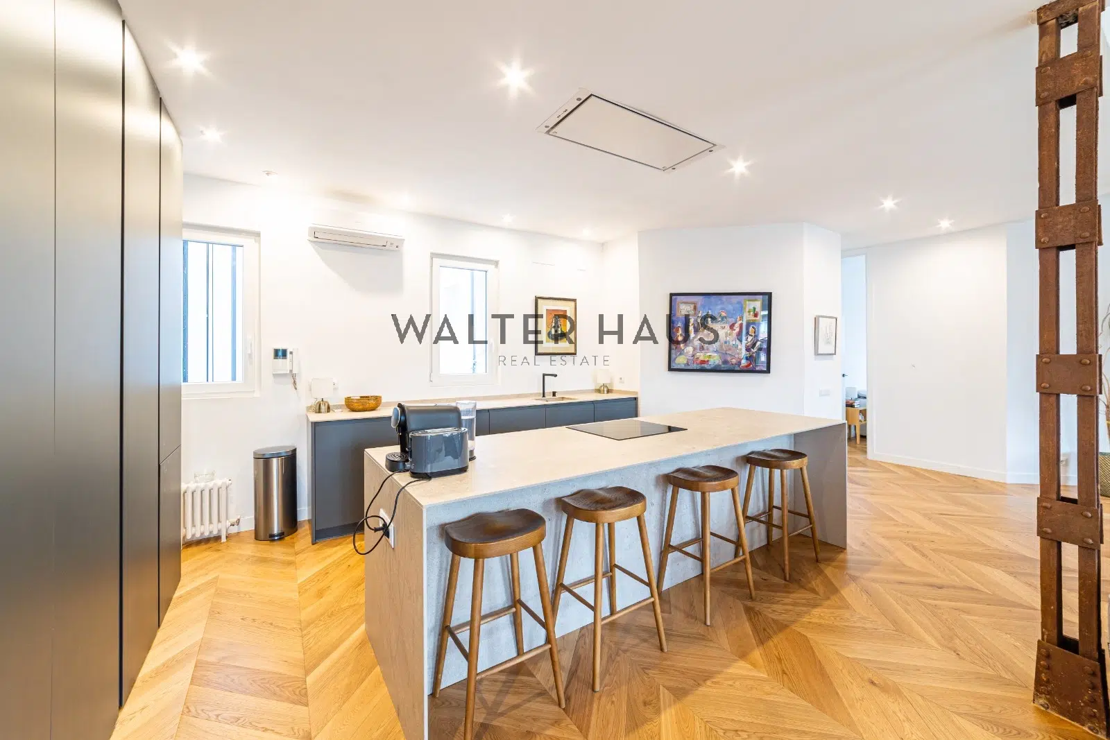 Entièrement rénové il y a quelques années, l’appartement a été repensé pour un mode de vie plus fonctionnel et convivial. Il comprend désormais un hall d’entrée avec de nombreux rangements, deux chambres spacieuses avec placards intégrés et balcons, deux salles de bains complètes avec ventilation naturelle et des toilettes invités. Le séjour/salle à manger, ainsi que la cuisine équipée d’un grand îlot central et d’un espace de travail, forment un espace ouvert, lumineux et modulable. Les poutres en fer forgé d’origine, désormais apparentes, rompent la monotonie et témoignent des origines de l’immeuble, datant de la première moitié du XXe siècle.