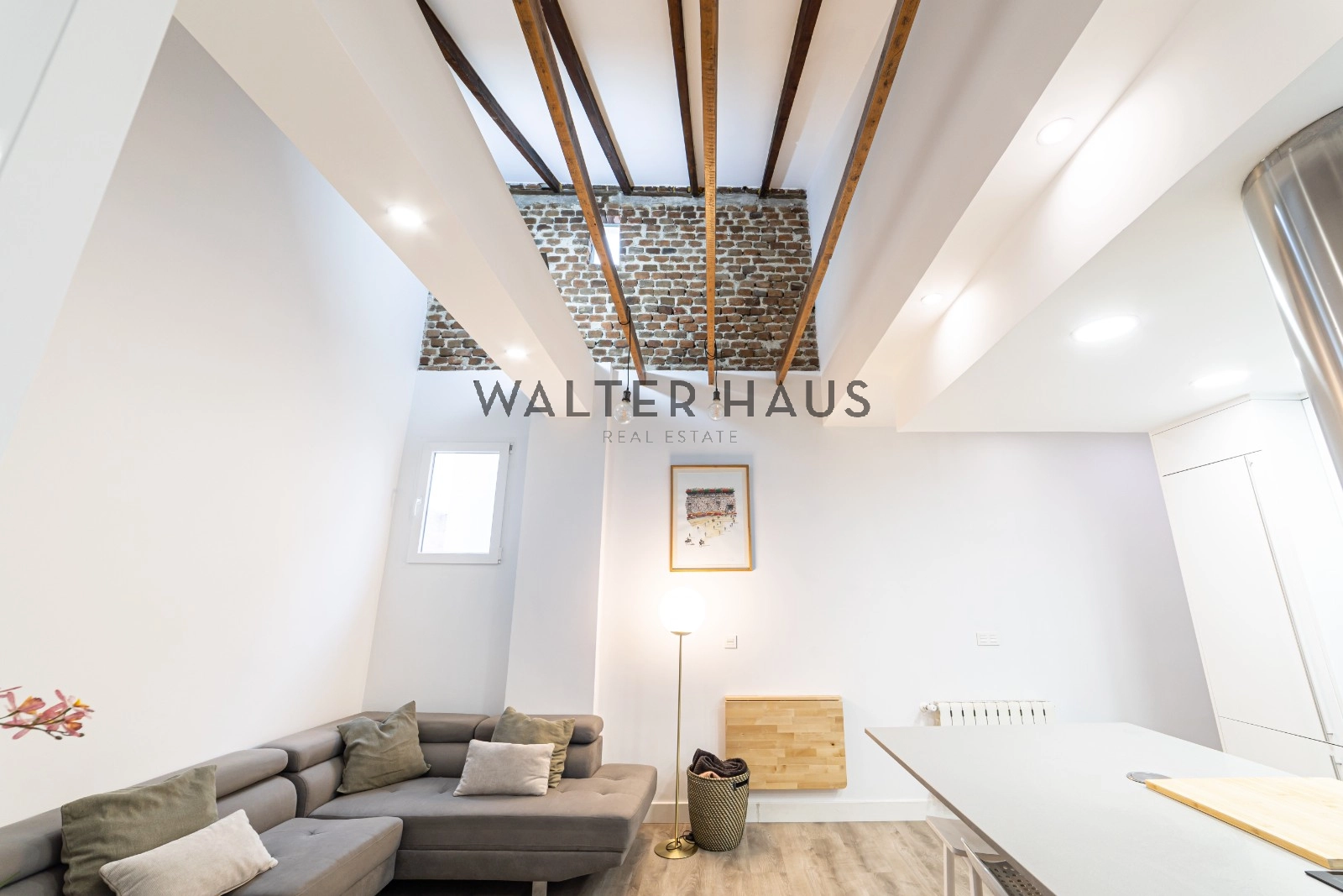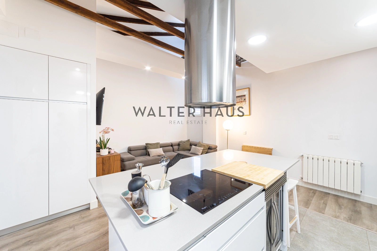 À l’intérieur, le cœur de l’appartement est son spacieux séjour, caractérisé par une belle hauteur sous plafond et des poutres apparentes d’origine qui confèrent du caractère et une sensation d’espace. Cet espace s’ouvre harmonieusement sur une grande cuisine design équipée d’un îlot central, idéale pour recevoir et cuisiner. L’espace nuit comprend deux chambres confortables et deux salles de bains complètes aux finitions haut de gamme. La suite parentale a été conçue comme une véritable suite privée, avec un dressing et une salle de bains privative, créant un havre de paix et de détente.