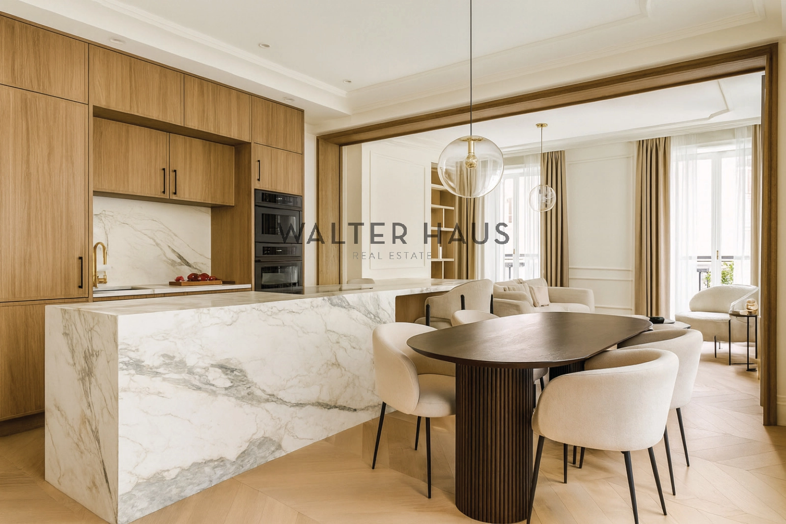 Après rénovation, le bien offrira un agencement moderne et fonctionnel avec trois chambres spacieuses et quatre salles de bains complètes, conçues avec des matériaux haut de gamme et des finitions élégantes. L’espace de vie est conçu comme un lieu ouvert et fluide, idéal pour ceux qui recherchent confort et espace en milieu urbain. La structure originale de l’immeuble permet de bénéficier de hauts plafonds qui, combinés à l’orientation de l’appartement, garantissent une atmosphère aérée et lumineuse. Chaque détail technique a été pensé pour offrir un confort thermique et acoustique optimal au cœur de la capitale.