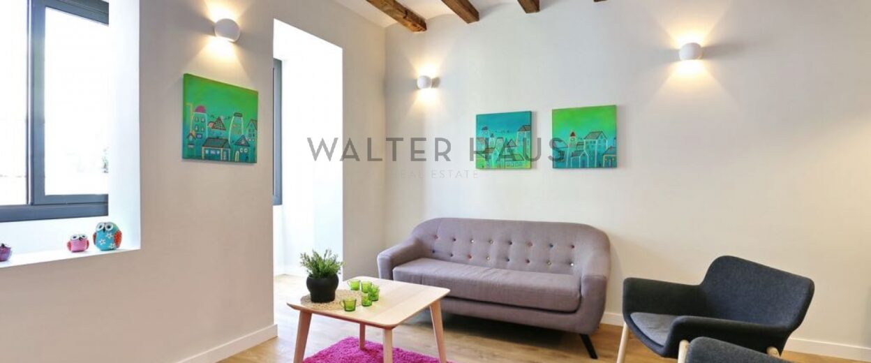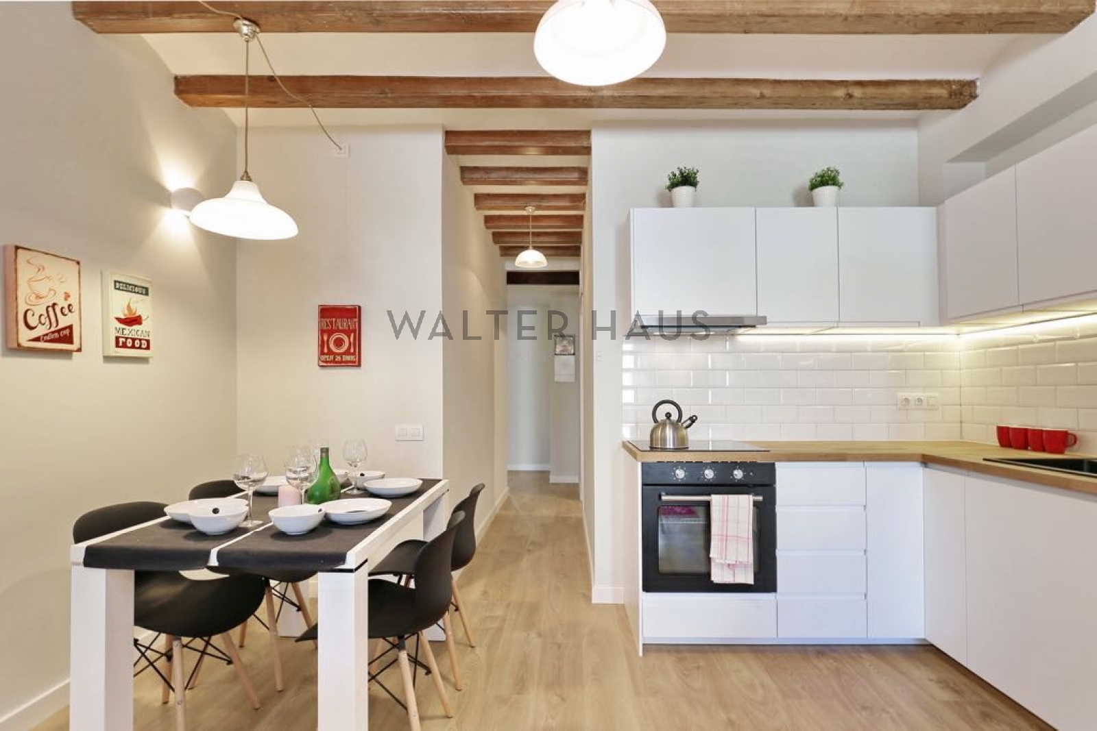 Lumineux appartement de 73 m² dans un immeuble rénové sans ascenseur. Entièrement rénové, il allie éléments d’origine et détails et équipements modernes. Il en résulte un logement spectaculaire aux finitions haut de gamme et au caractère affirmé. Le salon-salle à manger est lumineux et donne sur une galerie baignée de lumière naturelle. La cuisine laquée blanche, ouverte sur la salle à manger, est équipée d’électroménagers encastrés. L’espace nuit se compose de deux chambres doubles donnant sur l’extérieur, dont la suite parentale avec salle de bains privative et accès à un balcon donnant sur la rue. Une deuxième salle de bains avec douche dessert le reste de l’appartement. Climatisation gainable, double vitrage Climalit, parquet partout et carrelage en porcelaine dans les salles de bains. Plafonds voûtés catalans avec poutres apparentes. Meublé avec du mobilier moderne.
