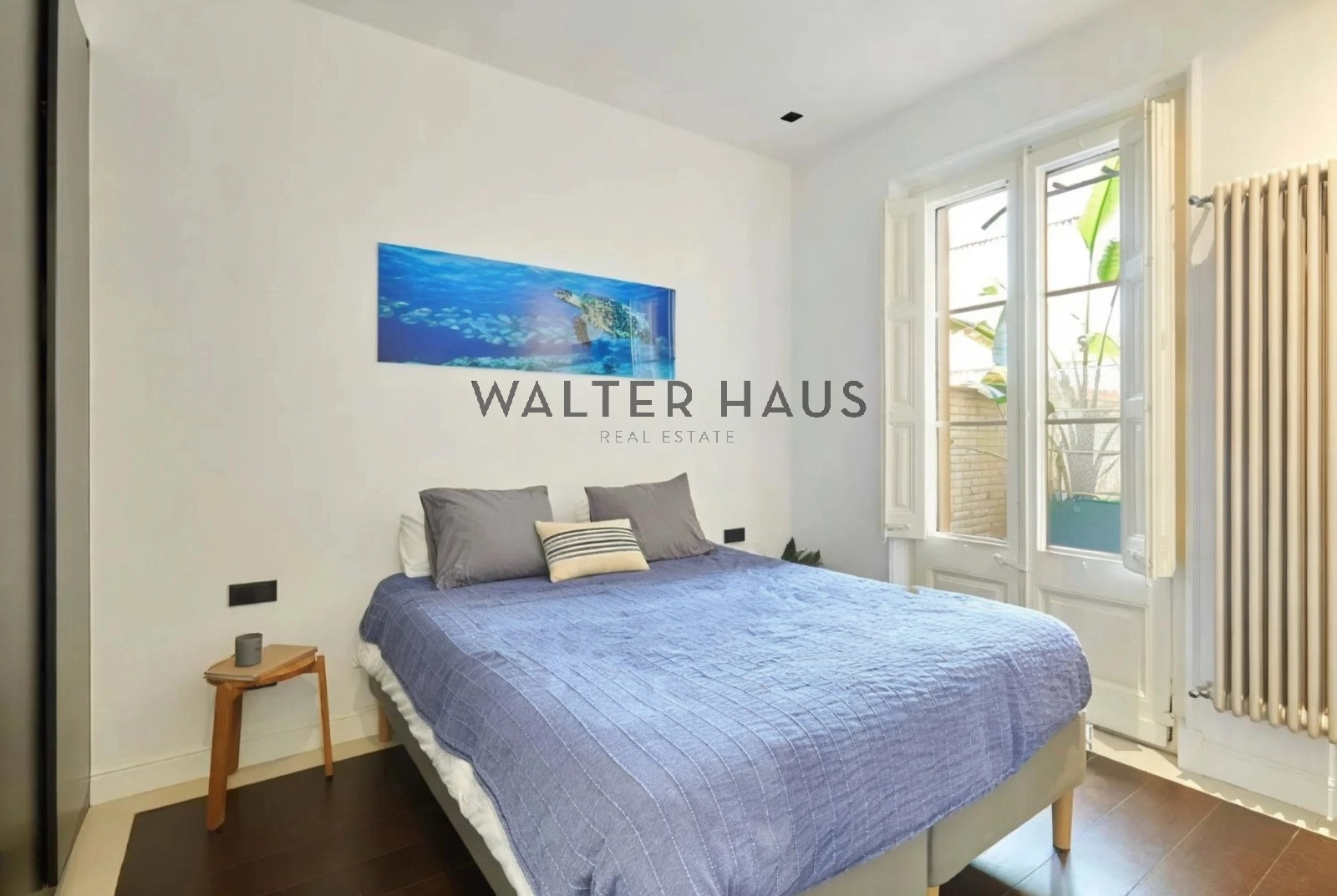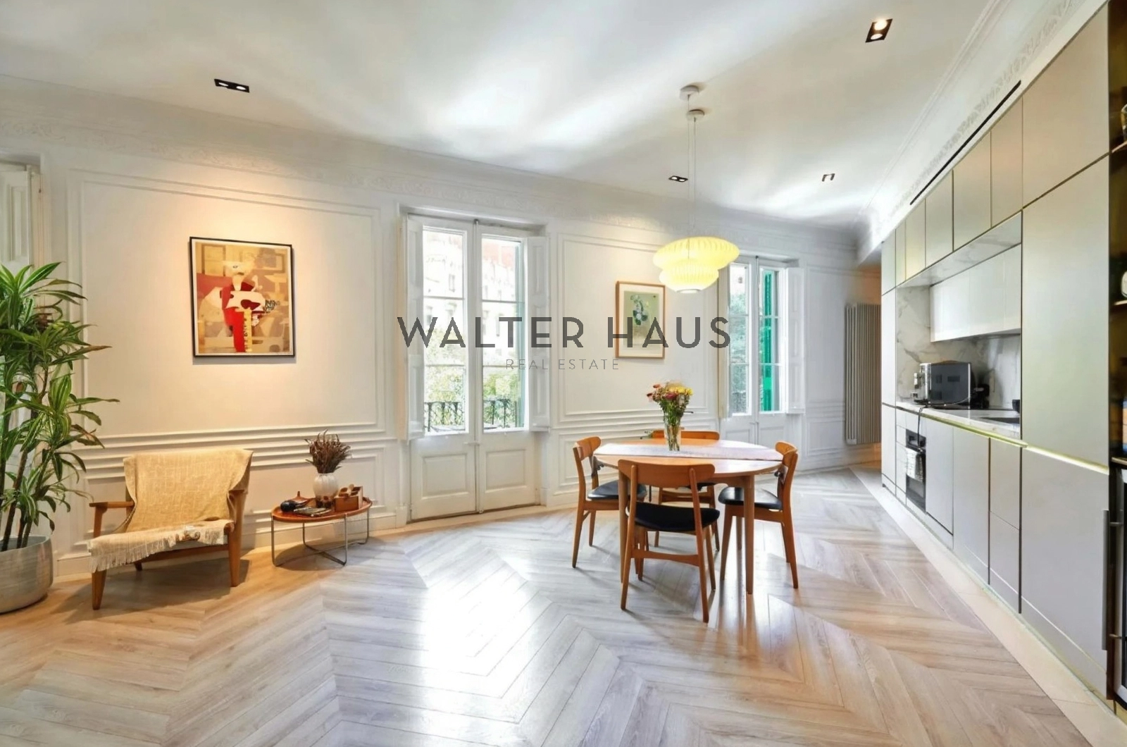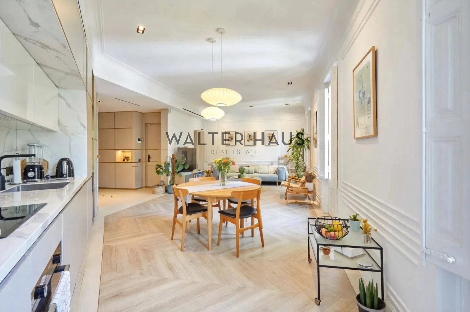 L’intérieur a été conçu pour optimiser la lumière naturelle et créer une impression d’espace. Le séjour-salle à manger, lumineux et aéré, s’ouvre sur des balcons et une cuisine américaine favorisant une circulation fluide. Il comprend trois chambres et deux salles de bains complètes, dont deux chambres doubles avec salles de bains et dressings privatifs. La troisième chambre offre une grande flexibilité d’aménagement, s’adaptant facilement à différents modes de vie et pouvant servir de bureau, de dressing ou de cellier. L’appartement bénéficie également d’un chauffage et d’une climatisation réversibles, d’une installation électrique entièrement rénovée et d’un chauffage aérothermique. Lors de la rénovation, les fenêtres d’origine en bois massif ont été conservées et restaurées, et le parquet en chevrons naturel confère à l’appartement un caractère élégant et intemporel.