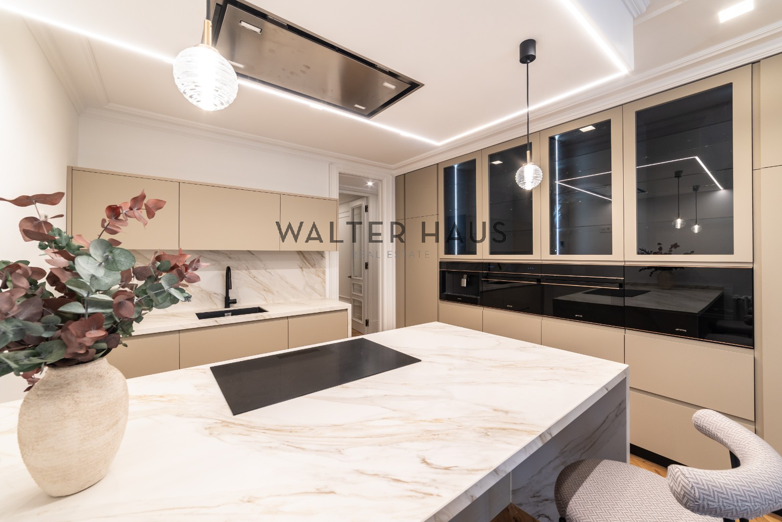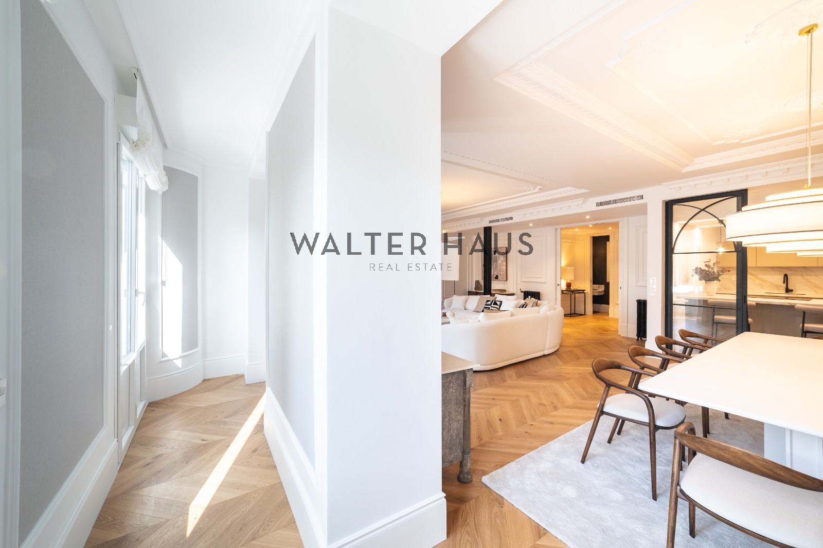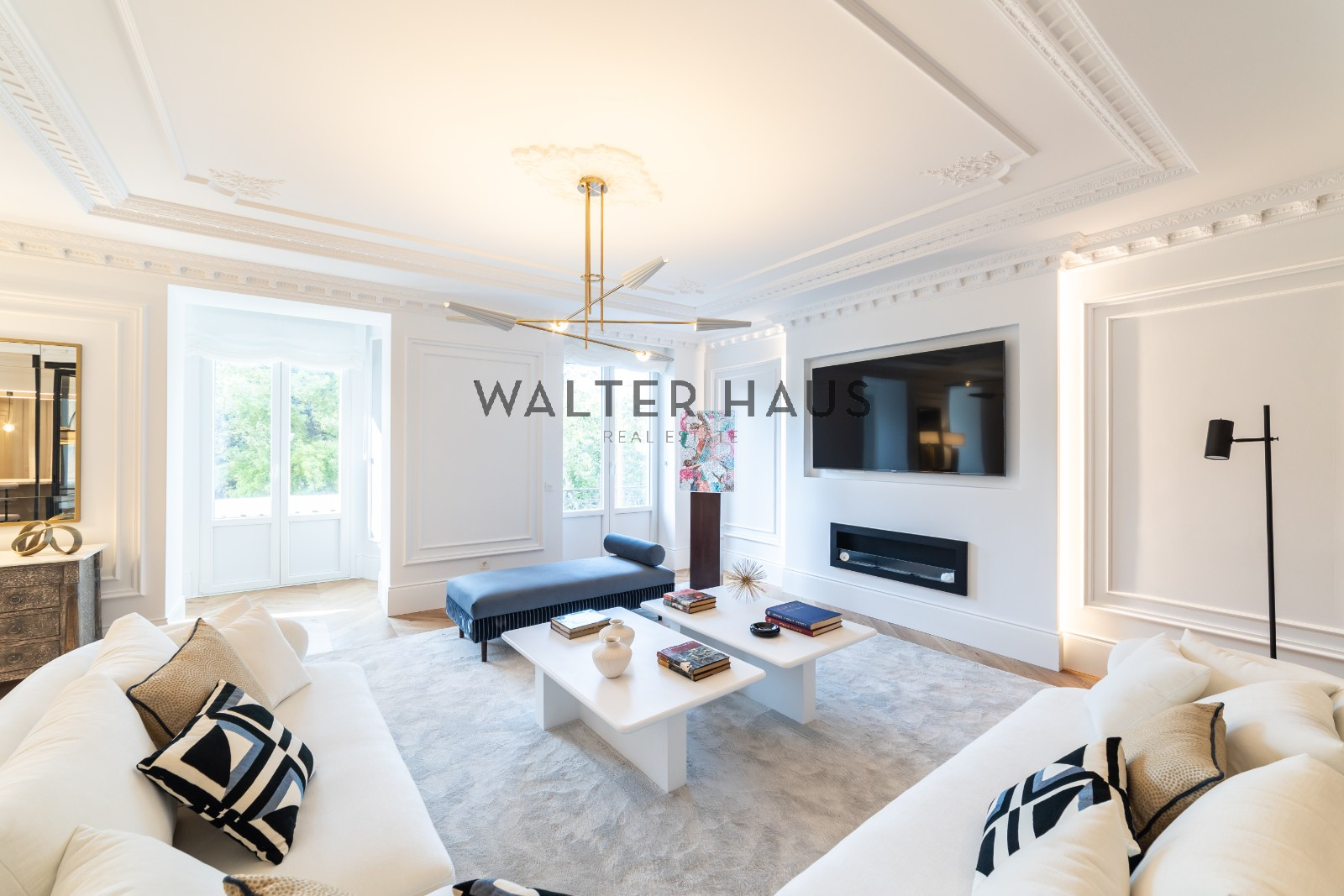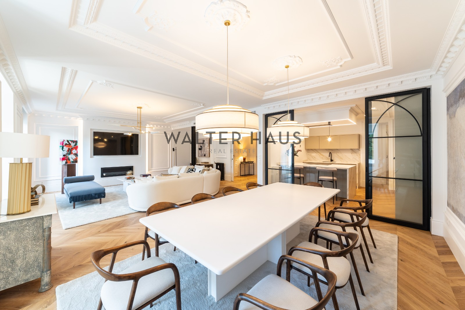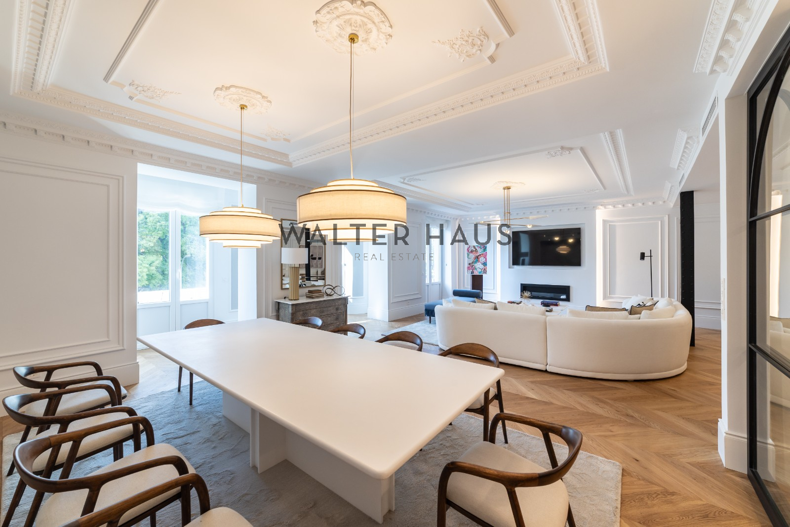 Cette propriété a été soigneusement rénovée tout en conservant son charme d’origine, comme les hauts plafonds moulurés, les radiateurs anciens restaurés et les balcons offrant des vues agréables. L’agencement a été conçu pour offrir un confort maximal, comprenant un spacieux salon-salle à manger avec de grandes fenêtres, une cuisine semi-ouverte au design fonctionnel, trois chambres en suite, dont une parentale avec dressing, ainsi que des toilettes invités et une buanderie séparée. Il est livré entièrement meublé et décoré avec un goût exquis.