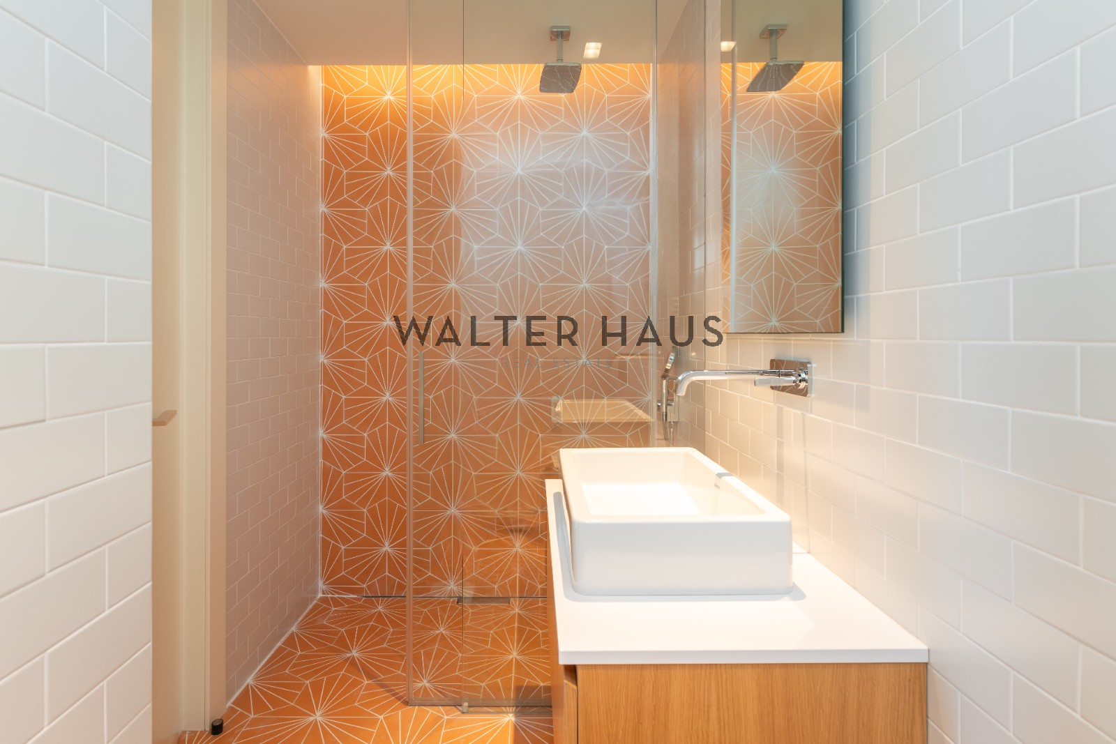 Le sol en porcelaine (R9/C1) prédomine, inspiré du sol hydraulique caractéristique de Barcelone. La forme choisie (hexagonale) a pour fonction de résoudre la forme du chanfrein sans marquer de direction spécifique. Le dessin géométrique et les tons adoptés, basés sur la gamme des Couleurs Le Corbusier, donnent aux maisons une touche de modernisme et de contemporanéité qui joue parfaitement avec les boiseries en Chêne et les plafonds mansardés apparents.