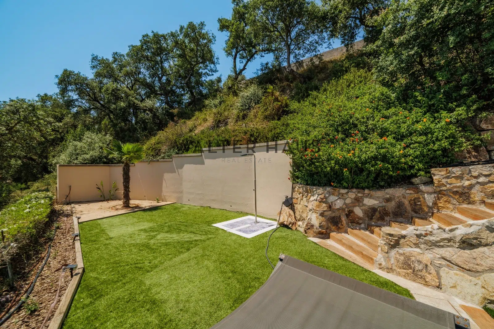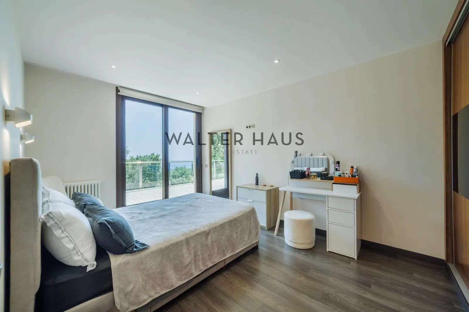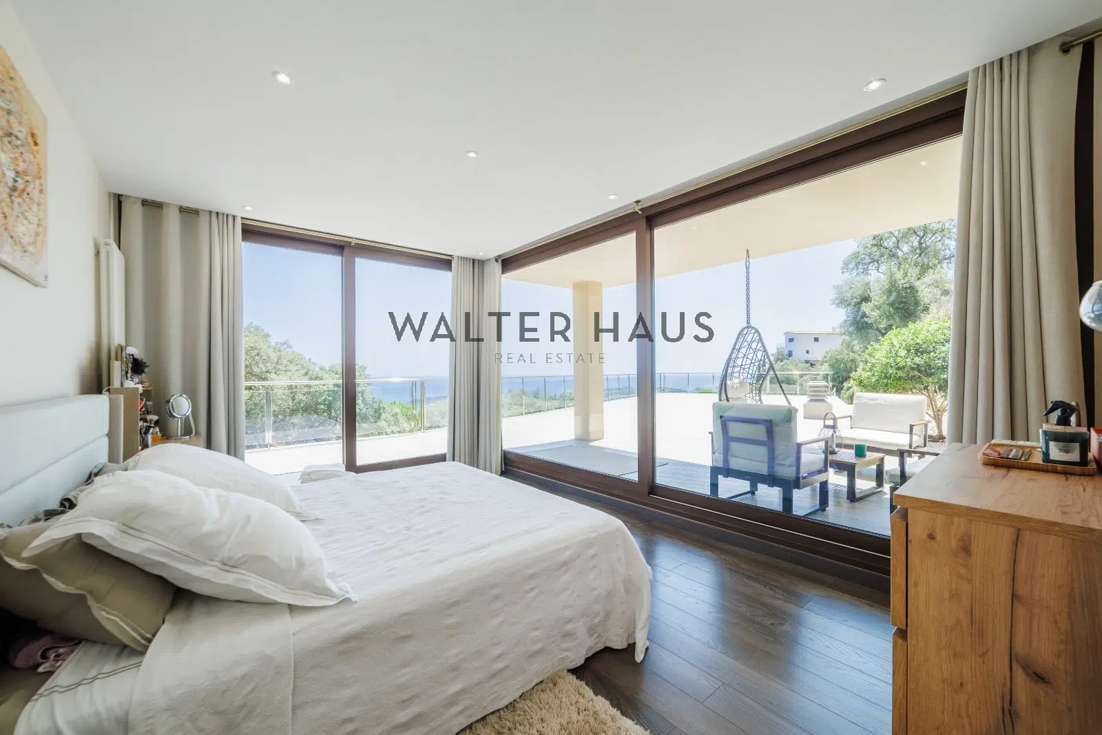L’étage supérieur comprend trois suites, une chambre double, un dressing supplémentaire et une grande terrasse de 60 m² avec vue sur la mer.