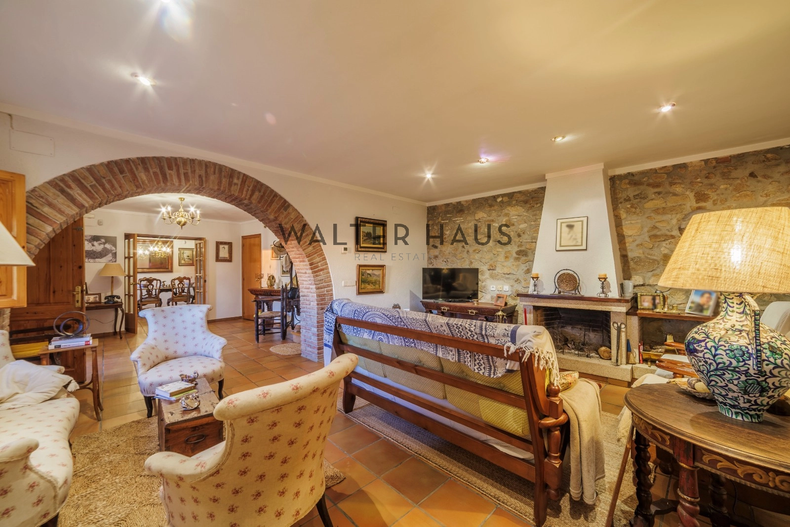 Au rez-de-chaussée, d’une superficie de 447,10 m², un grand hall d’entrée se distingue, orné des arcades typiques d’une ferme catalane.