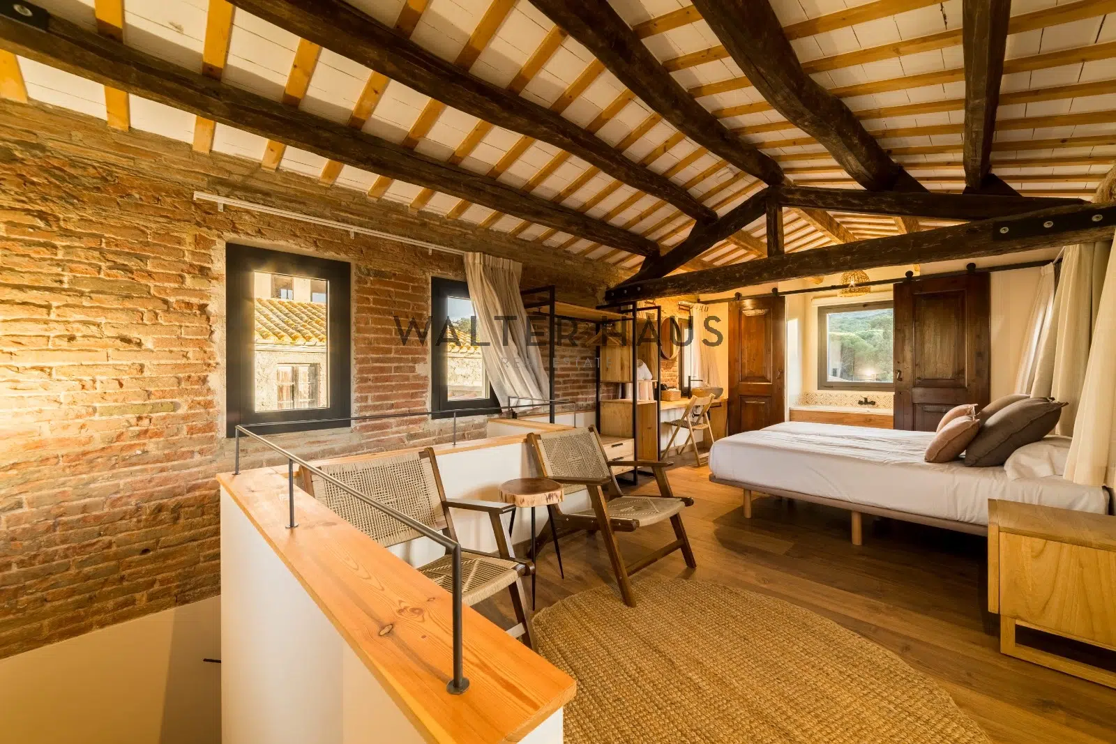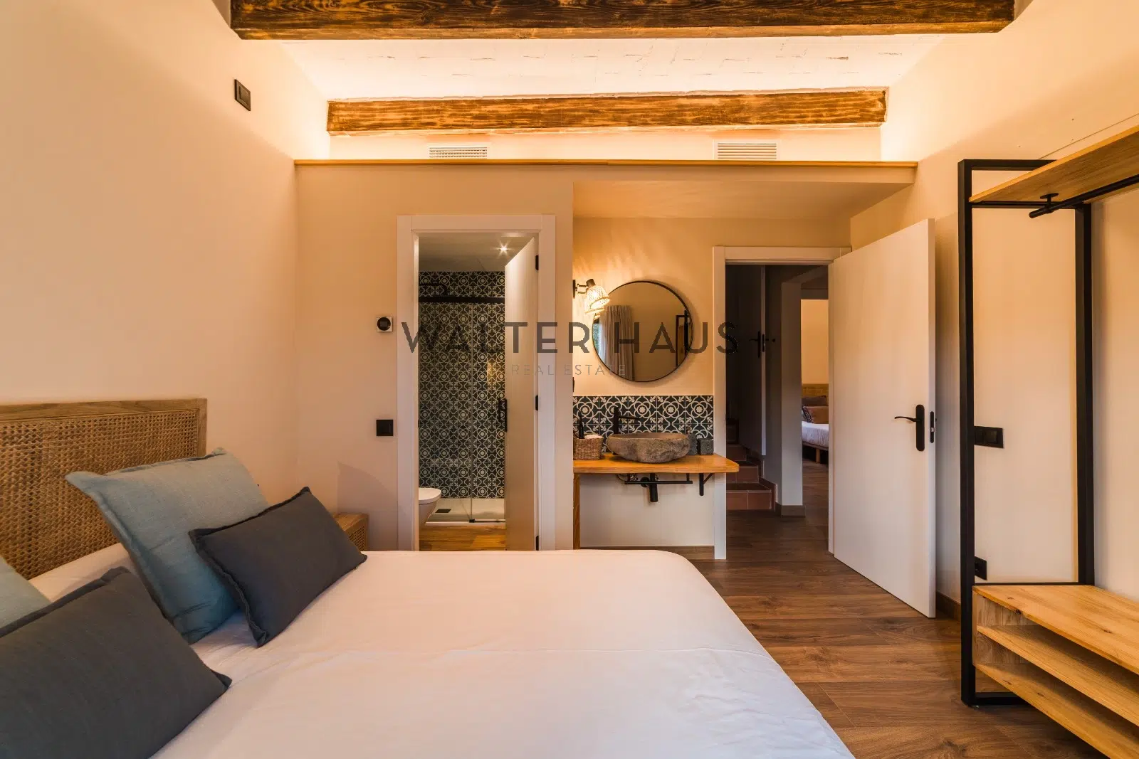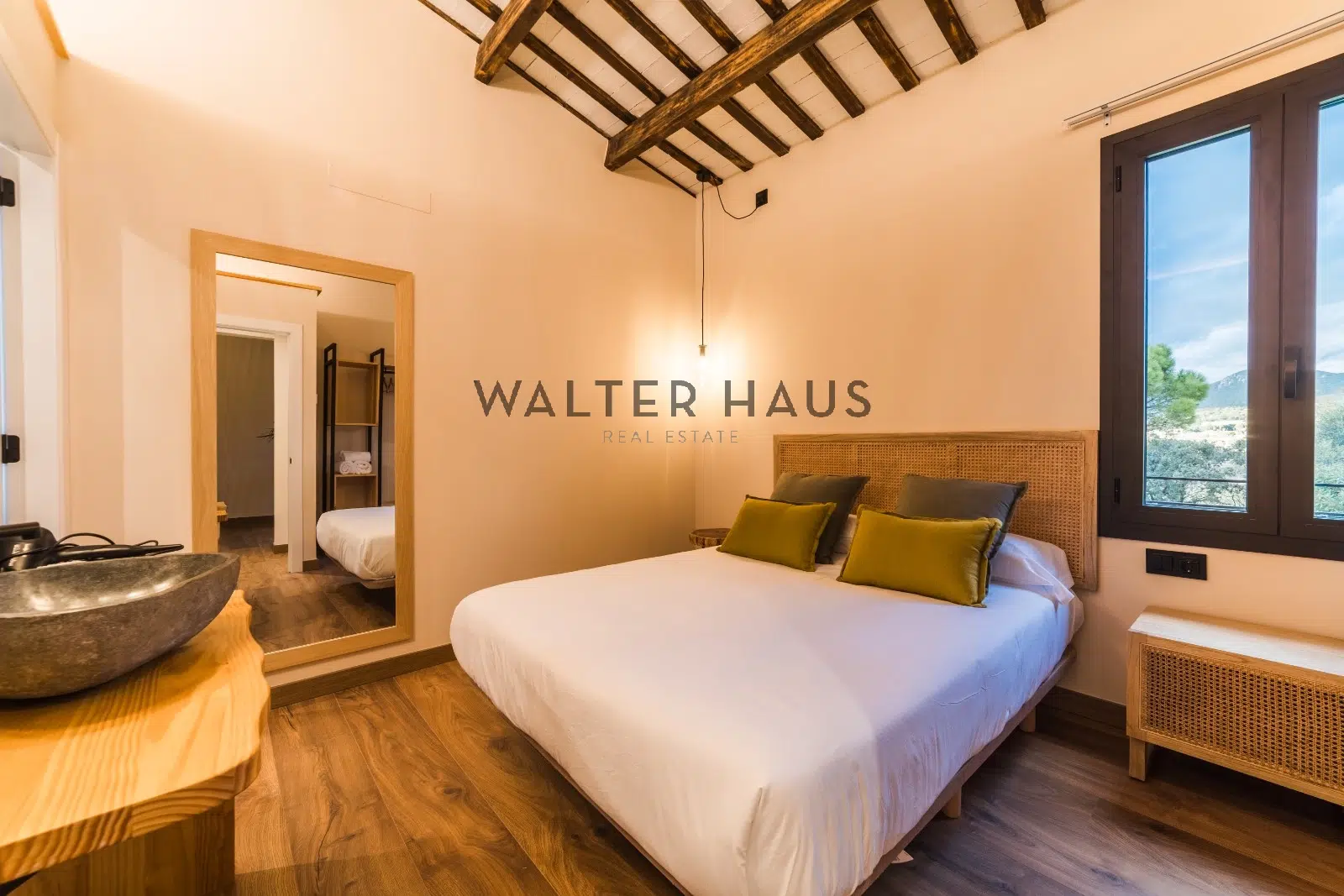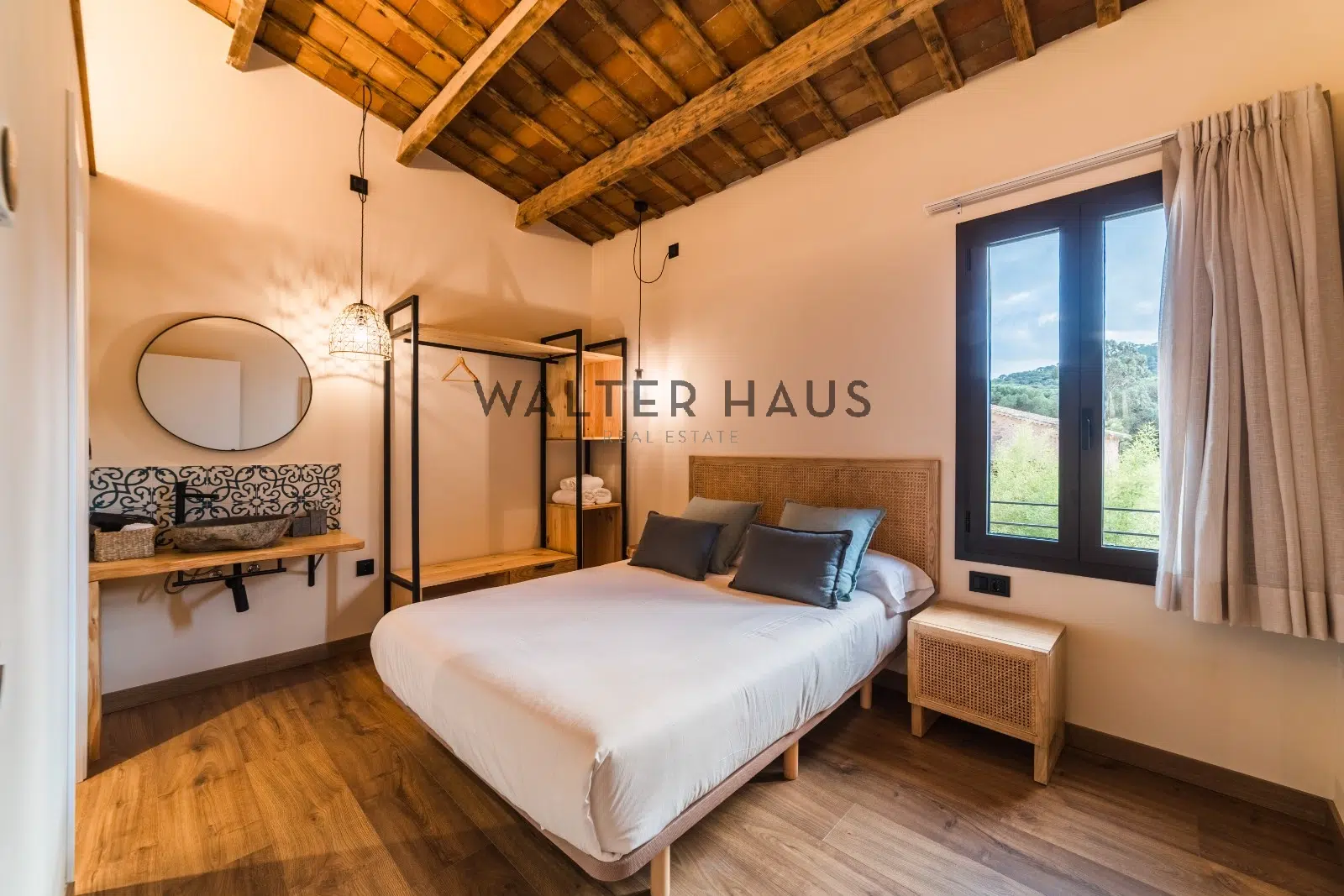 Le cœur du domaine est constitué de trois maisons aux caractéristiques distinctes. La maison principale a été soigneusement restaurée et offre des pièces spacieuses, fonctionnelles et esthétiques, conçues pour une vie de famille confortable. Elle comprend une cuisine ouverte sur le séjour/salle à manger, une buanderie, des toilettes invités et un accès à une terrasse avec barbecue ou au jardin avec piscine, jouxtant l’ancien moulin. L’espace nuit comprend quatre chambres avec salle de bains privative au premier étage et, au deuxième étage, une chambre mansardée avec baignoire offrant une vue imprenable sur les couchers de soleil. L’ancienne écurie, désormais transformée en maison individuelle avec cuisine entièrement équipée, séjour/salle à manger offrant une vue imprenable, une suite parentale au rez-de-chaussée et deux autres suites à l’étage, dont une avec baignoire balnéo et poutres apparentes, a su conserver son charme rustique d’antan tout en intégrant des équipements modernes, notamment une piscine privée. Le troisième bâtiment, en attente de rénovation, offre un potentiel de personnalisation, que ce soit comme extension de la résidence principale ou comme maison d’hôtes. Les deux maisons restaurées sont entièrement équipées et prêtes à accueillir des locations de vacances haut de gamme. Le jardin abrite également un moulin historique.