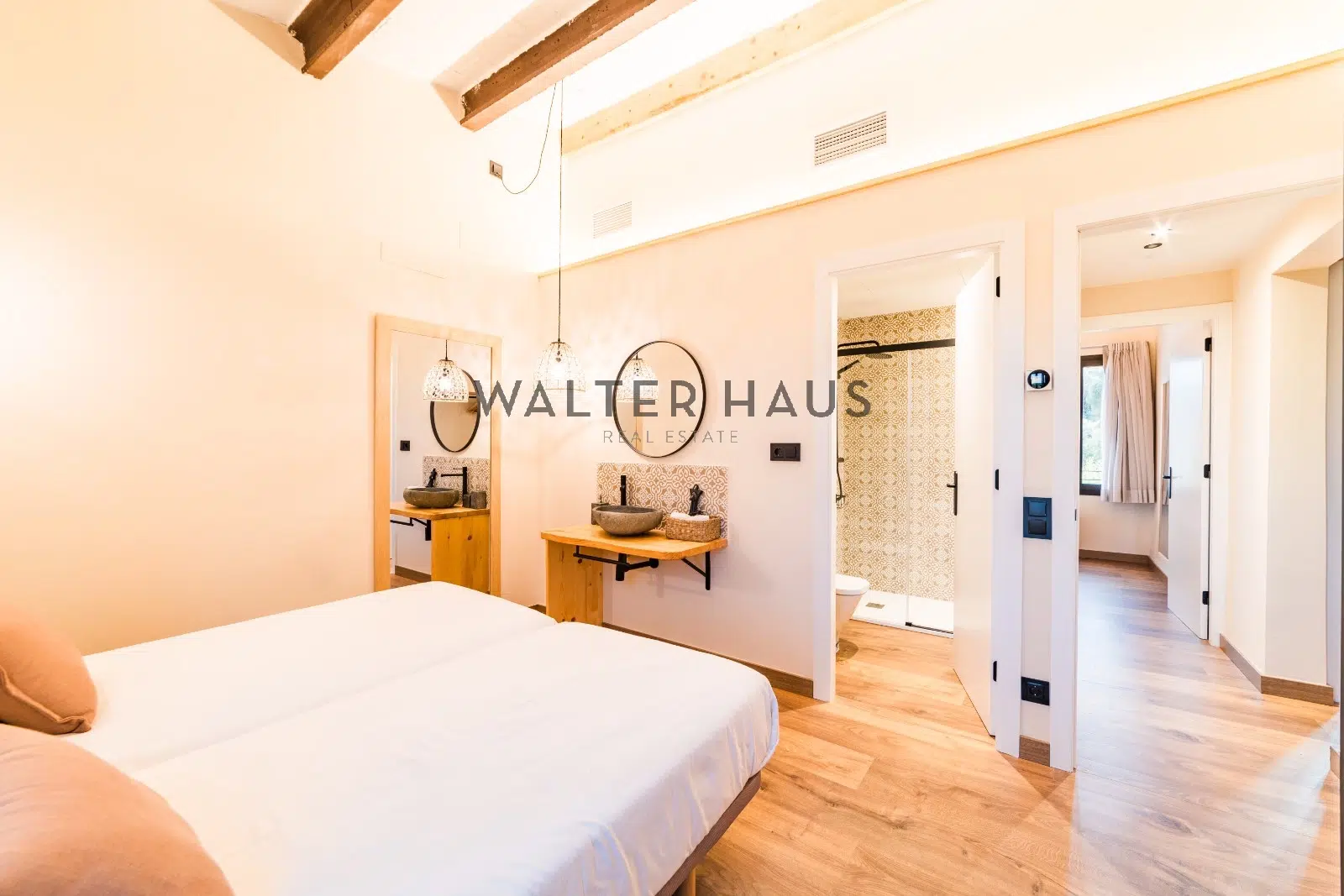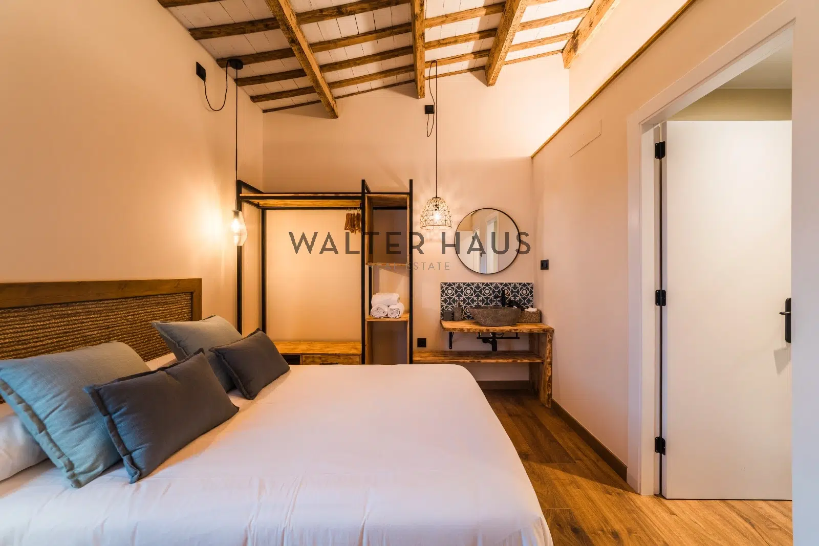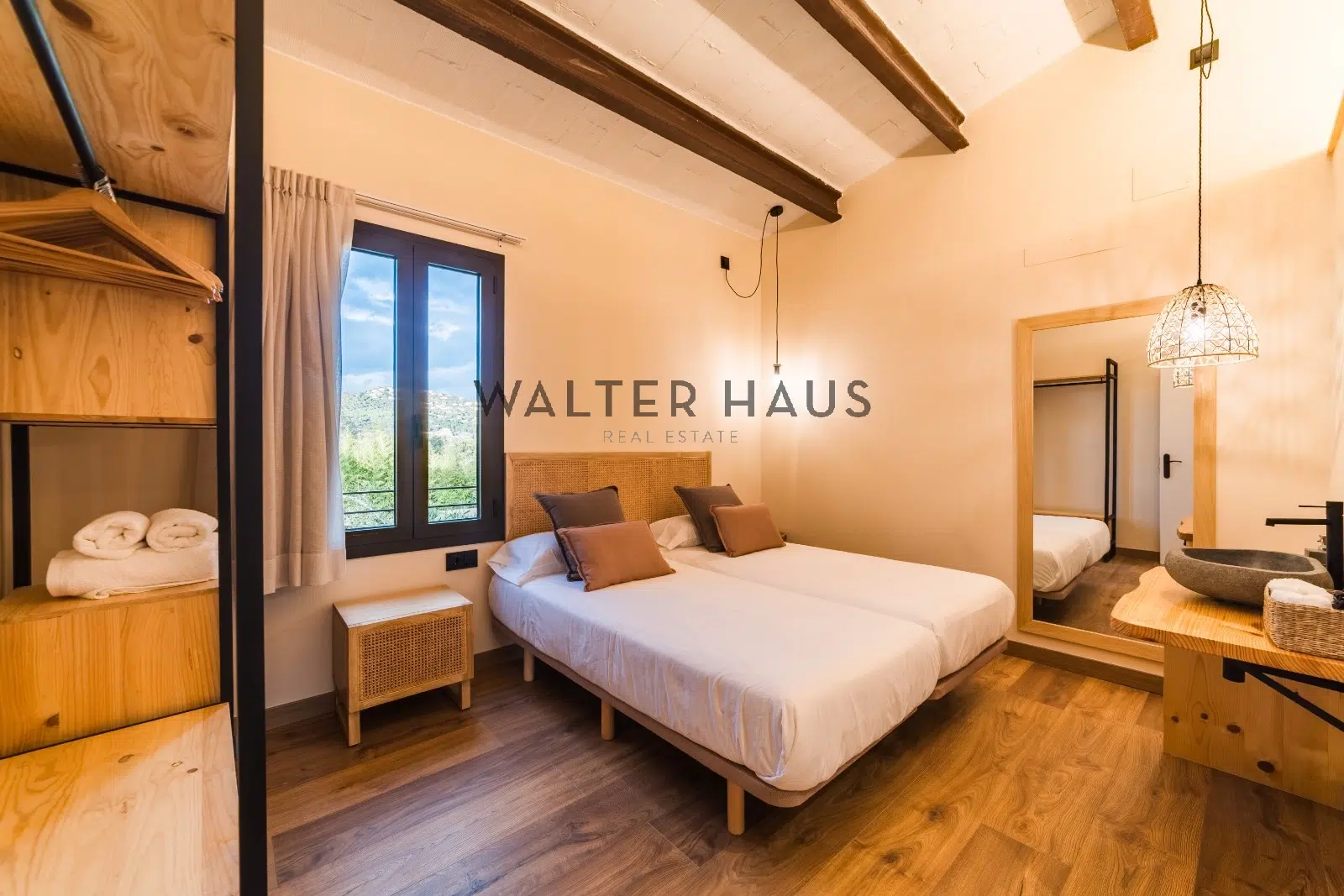Le cœur du domaine est constitué de trois maisons aux caractéristiques distinctes. La maison principale a été soigneusement restaurée et offre des pièces spacieuses, fonctionnelles et esthétiques, conçues pour une vie de famille confortable. Elle comprend une cuisine ouverte sur le séjour/salle à manger, une buanderie, des toilettes invités et un accès à une terrasse avec barbecue ou au jardin avec piscine, jouxtant l’ancien moulin. L’espace nuit comprend quatre chambres avec salle de bains privative au premier étage et, au deuxième étage, une chambre mansardée avec baignoire offrant une vue imprenable sur les couchers de soleil. L’ancienne écurie, désormais transformée en maison individuelle avec cuisine entièrement équipée, séjour/salle à manger offrant une vue imprenable, une suite parentale au rez-de-chaussée et deux autres suites à l’étage, dont une avec baignoire balnéo et poutres apparentes, a su conserver son charme rustique d’antan tout en intégrant des équipements modernes, notamment une piscine privée. Le troisième bâtiment, en attente de rénovation, offre un potentiel de personnalisation, que ce soit comme extension de la résidence principale ou comme maison d’hôtes. Les deux maisons restaurées sont entièrement équipées et prêtes à accueillir des locations de vacances haut de gamme. Le jardin abrite également un moulin historique.