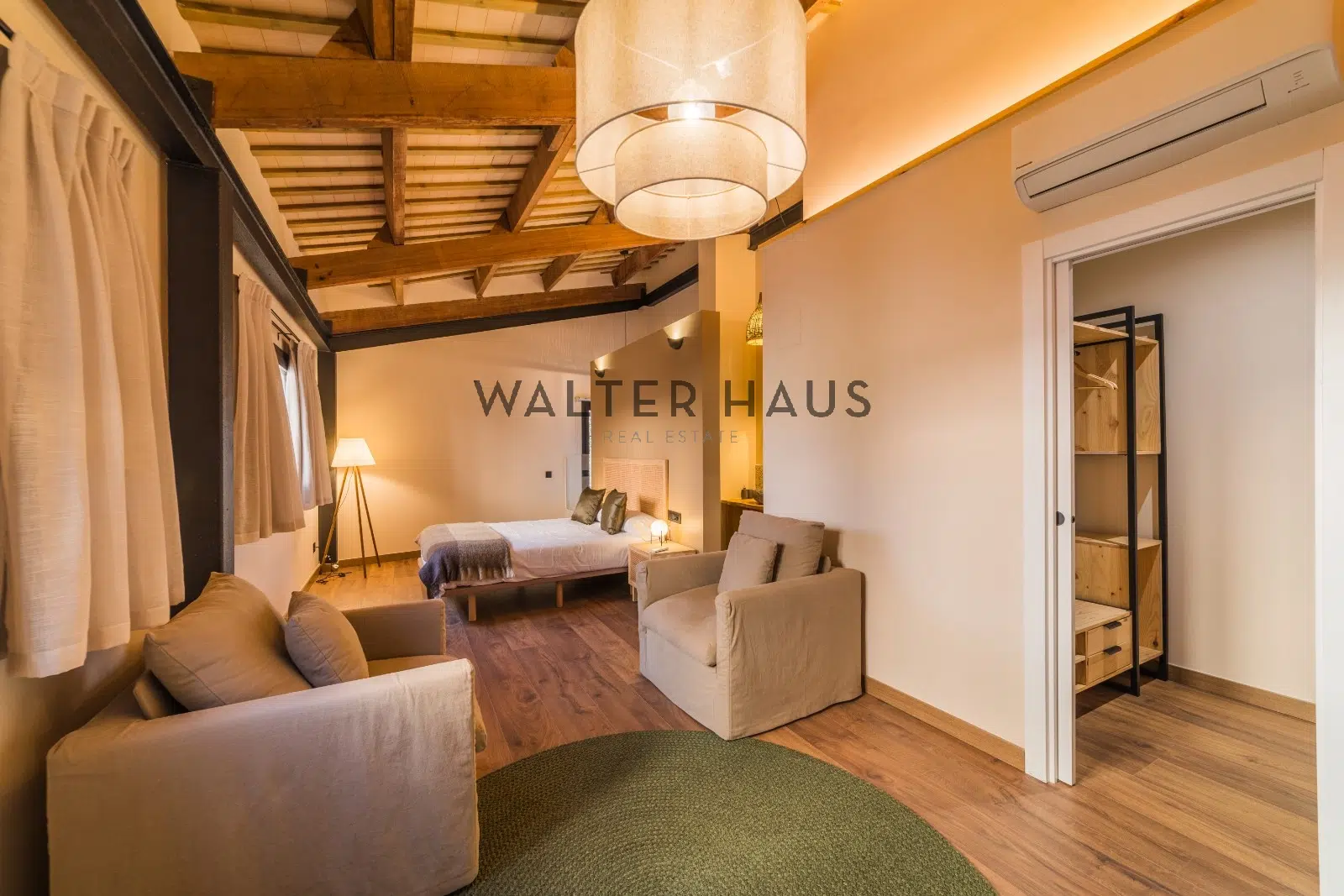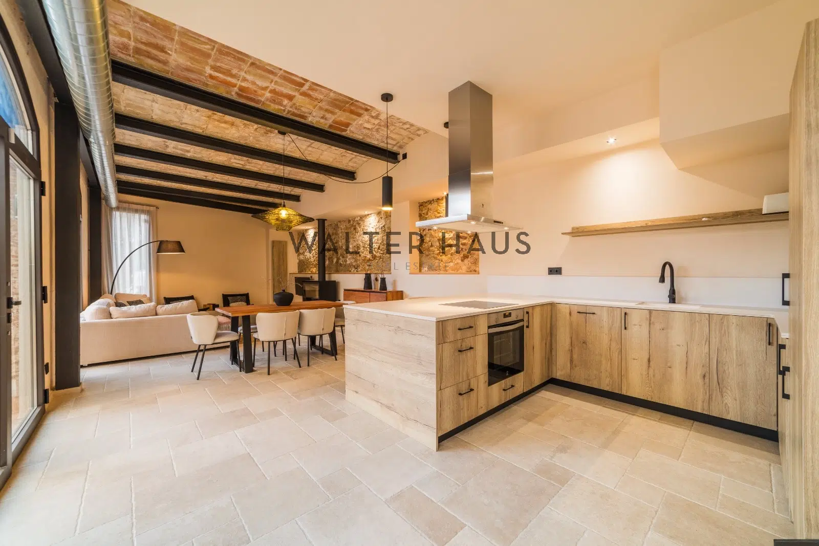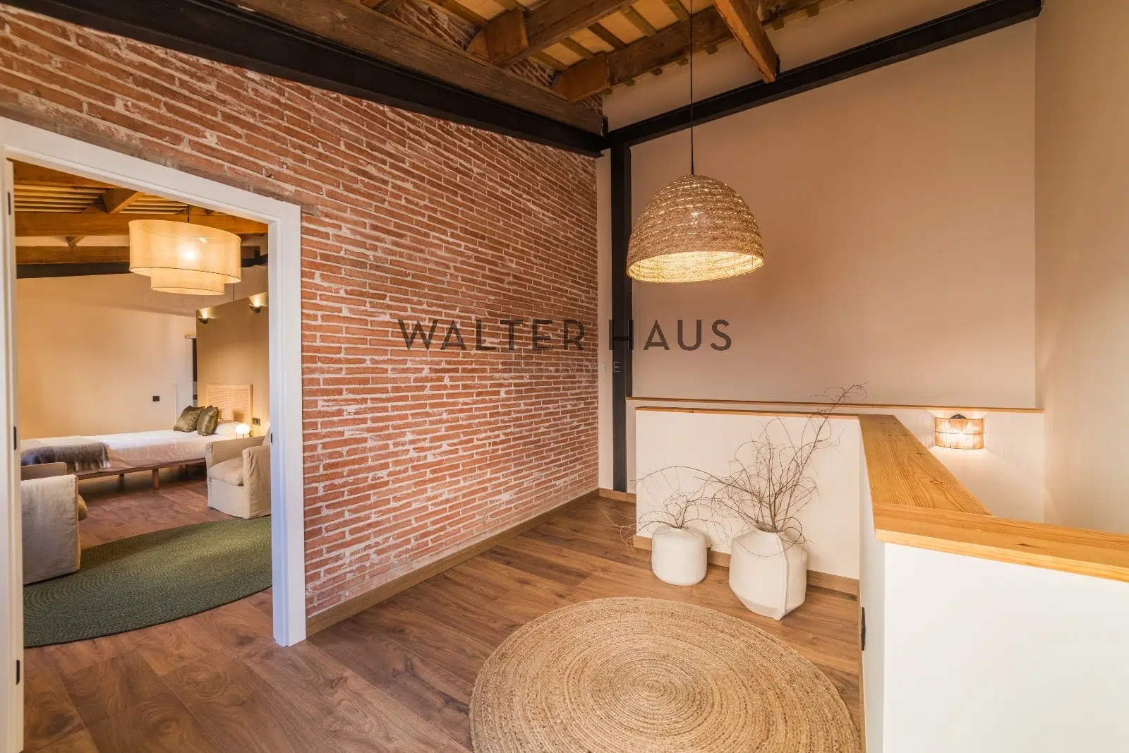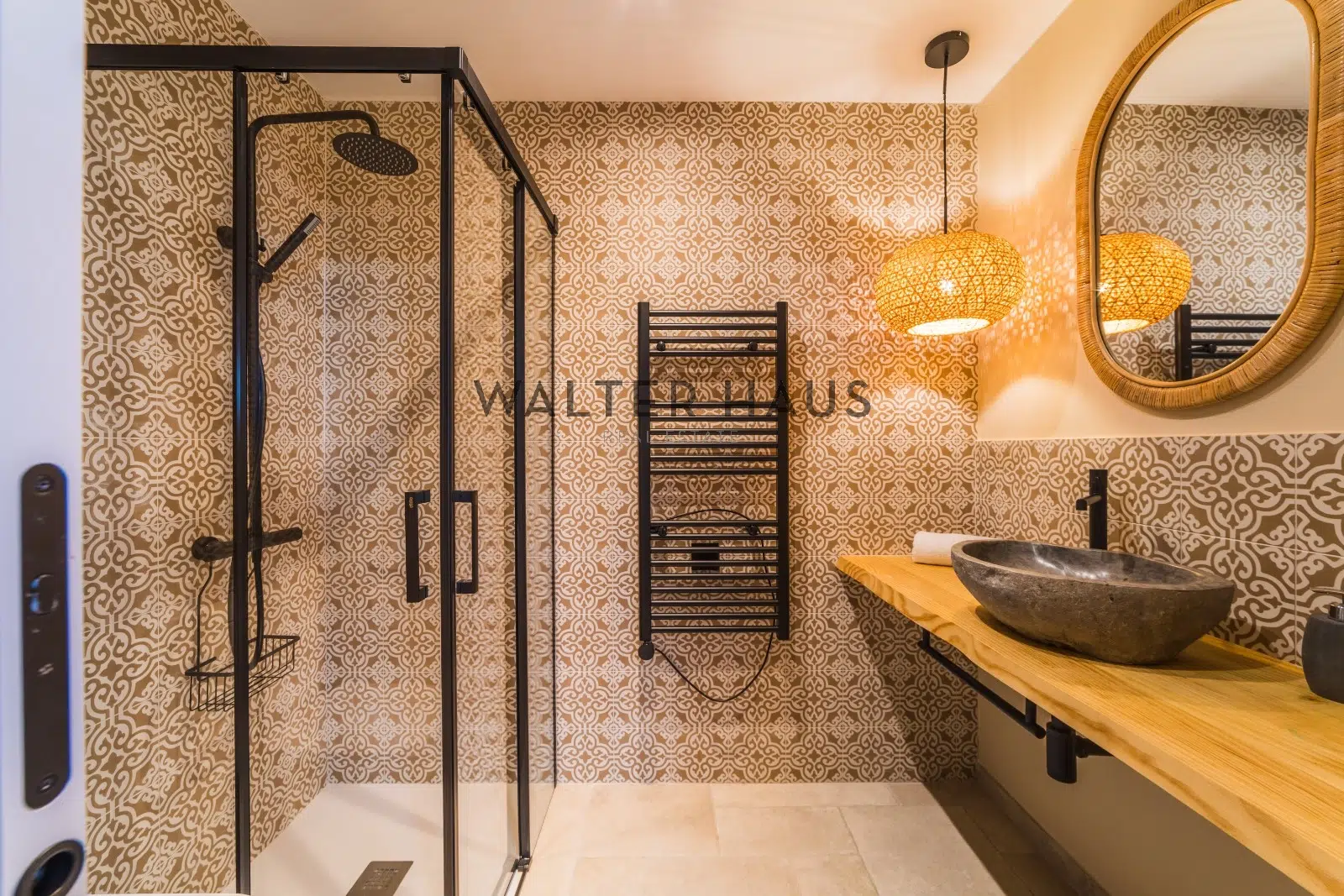 Le cœur du domaine est constitué de trois maisons aux caractéristiques distinctes. La maison principale a été soigneusement restaurée et offre des pièces spacieuses, fonctionnelles et esthétiques, conçues pour une vie de famille confortable. Elle comprend une cuisine ouverte sur le séjour/salle à manger, une buanderie, des toilettes invités et un accès à une terrasse avec barbecue ou au jardin avec piscine, jouxtant l’ancien moulin. L’espace nuit comprend quatre chambres avec salle de bains privative au premier étage et, au deuxième étage, une chambre mansardée avec baignoire offrant une vue imprenable sur les couchers de soleil. L’ancienne écurie, désormais transformée en maison individuelle avec cuisine entièrement équipée, séjour/salle à manger offrant une vue imprenable, une suite parentale au rez-de-chaussée et deux autres suites à l’étage, dont une avec baignoire balnéo et poutres apparentes, a su conserver son charme rustique d’antan tout en intégrant des équipements modernes, notamment une piscine privée. Le troisième bâtiment, en attente de rénovation, offre un potentiel de personnalisation, que ce soit comme extension de la résidence principale ou comme maison d’hôtes. Les deux maisons restaurées sont entièrement équipées et prêtes à accueillir des locations de vacances haut de gamme. Le jardin abrite également un moulin historique.
