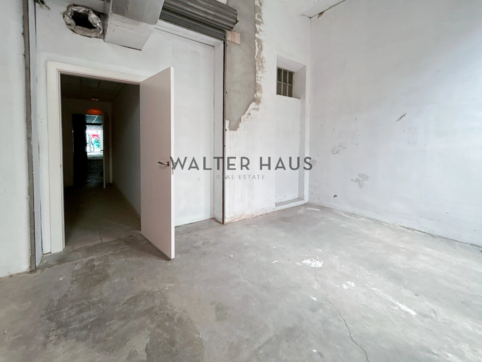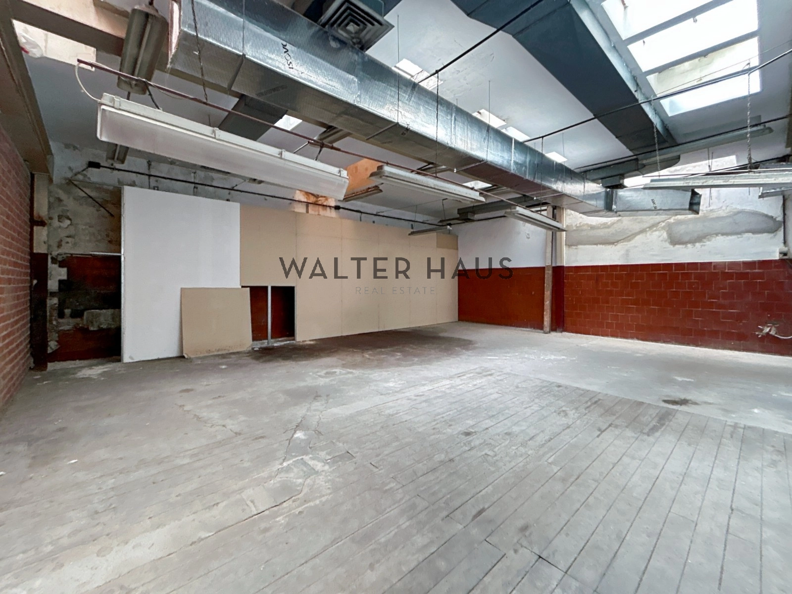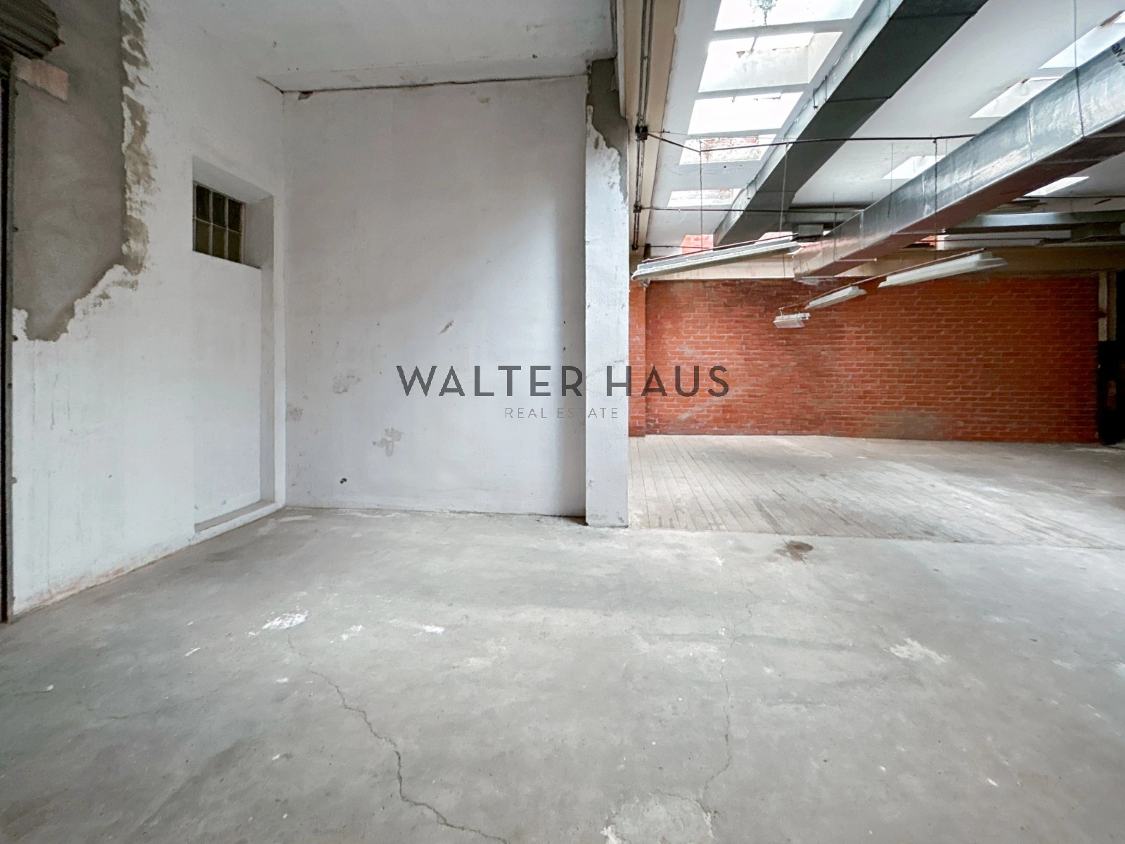 Plus loin, un hall qui vous emmène dans un grand espace avec de hauts plafonds et beaucoup de lumière naturelle grâce aux lucarnes au plafond. Complètement diaphane. Murs en briques apparentes.