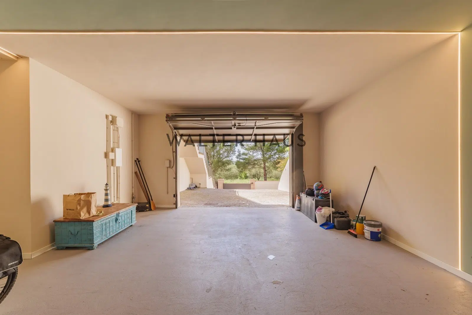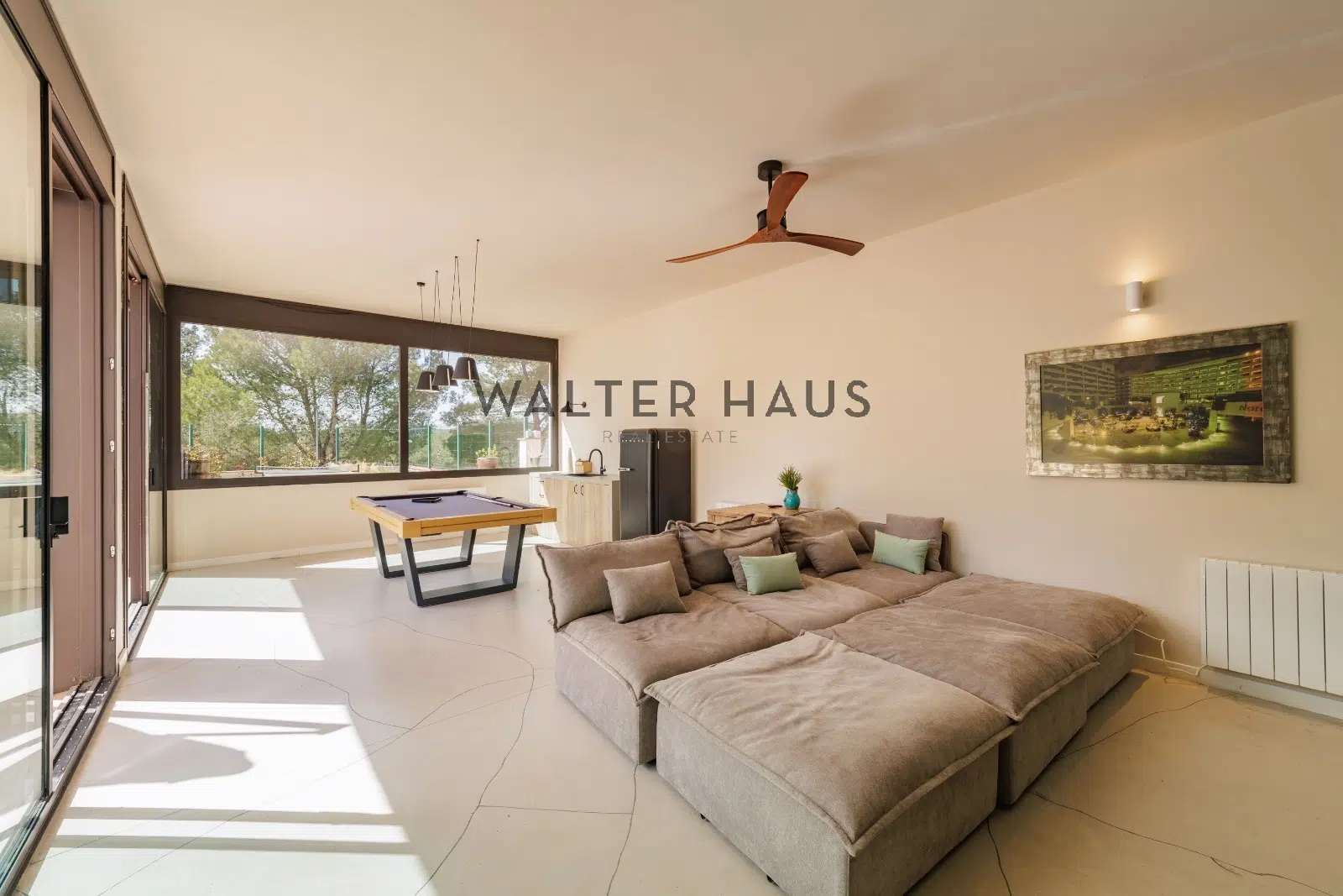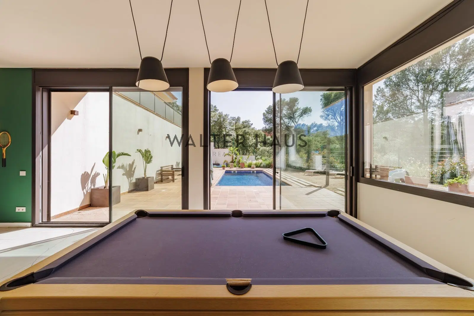 L’étage inférieur offre un espace de loisirs exceptionnel, avec une salle de jeux équipée d’un billard, un coin TV et une autre cuisine ouverte. Cet espace s’ouvre sur le jardin et la piscine, offrant un cadre idyllique pour se détendre et profiter des beaux jours. À ce niveau se trouvent également une salle de bain, une petite chambre supplémentaire et un garage fermé pouvant accueillir deux voitures.