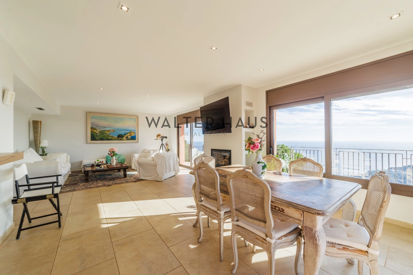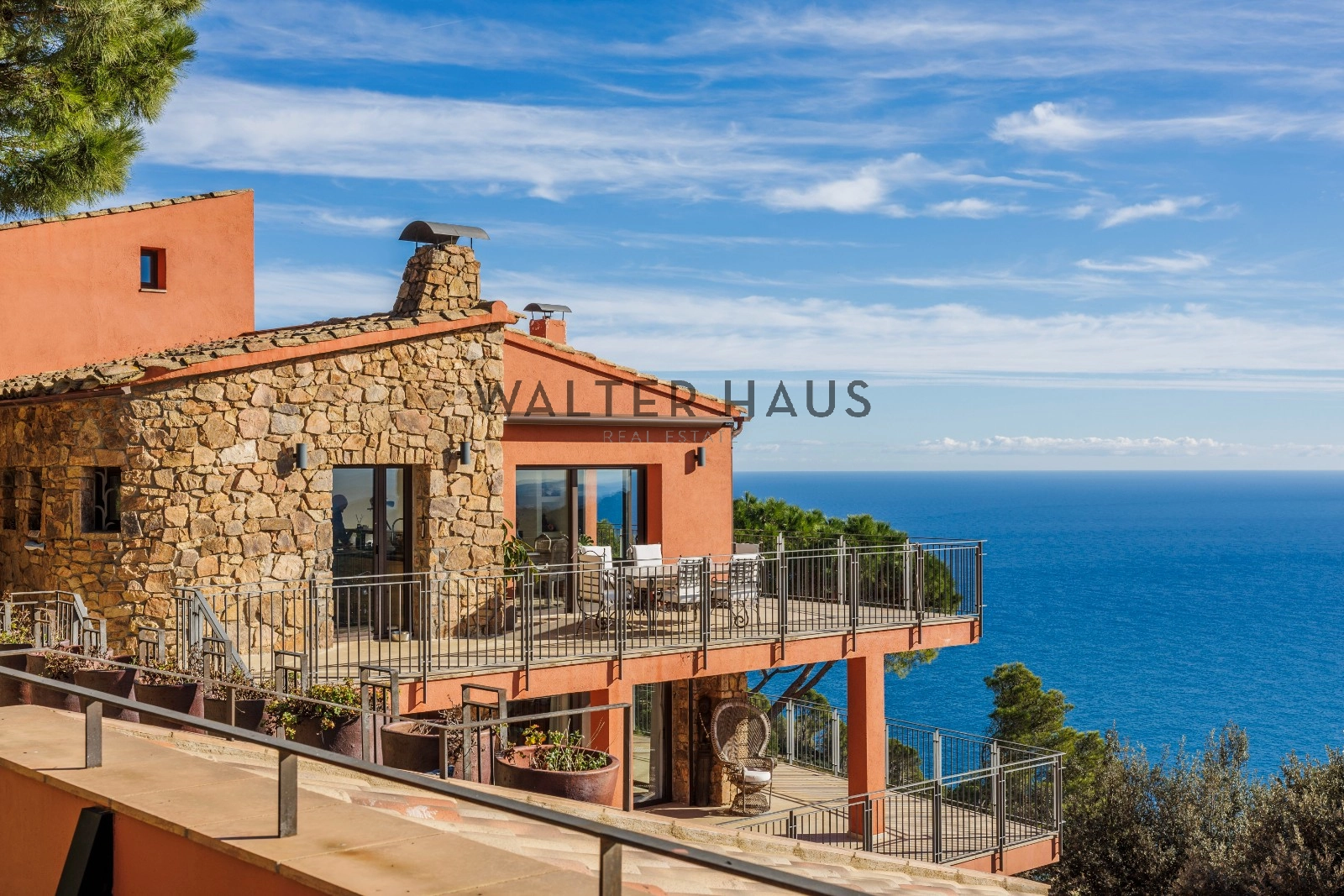 Accessible par une longue et majestueuse allée extérieure, la maison se déploie sur deux niveaux, optimisant ainsi la vue et la luminosité naturelle.