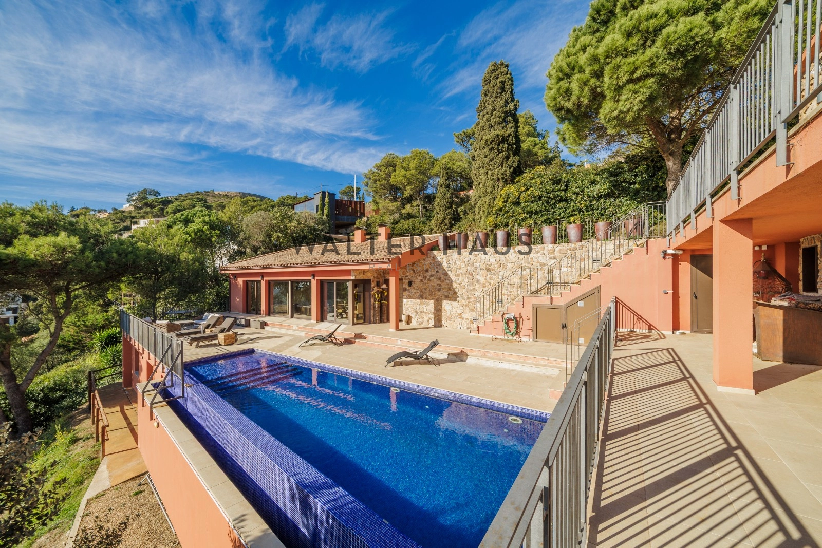 Située à quelques minutes à pied du centre de Begur, cette villa de 499 m² habitables sur un terrain de 2 232 m², rénovée en 2023, bénéficie d’un emplacement idéal offrant une intimité totale et une vue panoramique imprenable sur la baie d’Aiguablava, l’un des paysages les plus exclusifs de la région.