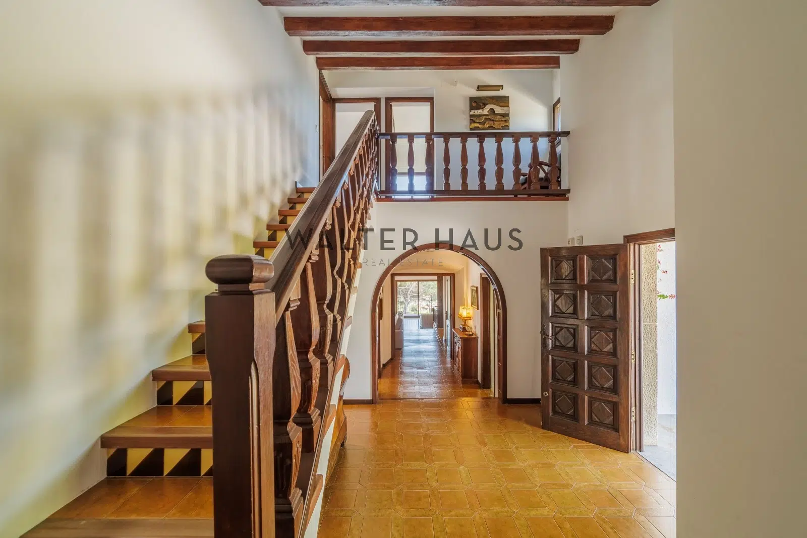 Au rez-de-chaussée, un accueillant séjour-salle à manger avec cheminée, parquet et plafonds aux détails rustiques contribue à son ambiance chaleureuse. De là, plusieurs terrasses permettent de profiter pleinement des environs. La cuisine entièrement équipée, avec son îlot central, offre espace et fonctionnalité. Ce niveau comprend également deux chambres, dont une avec salle de bains privative, des toilettes invités et une buanderie séparée.