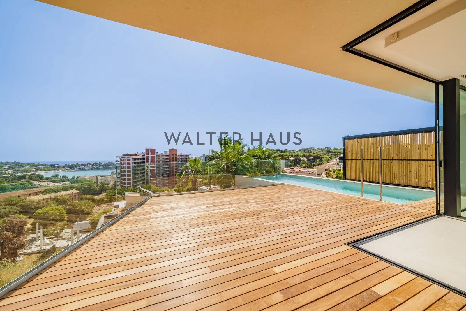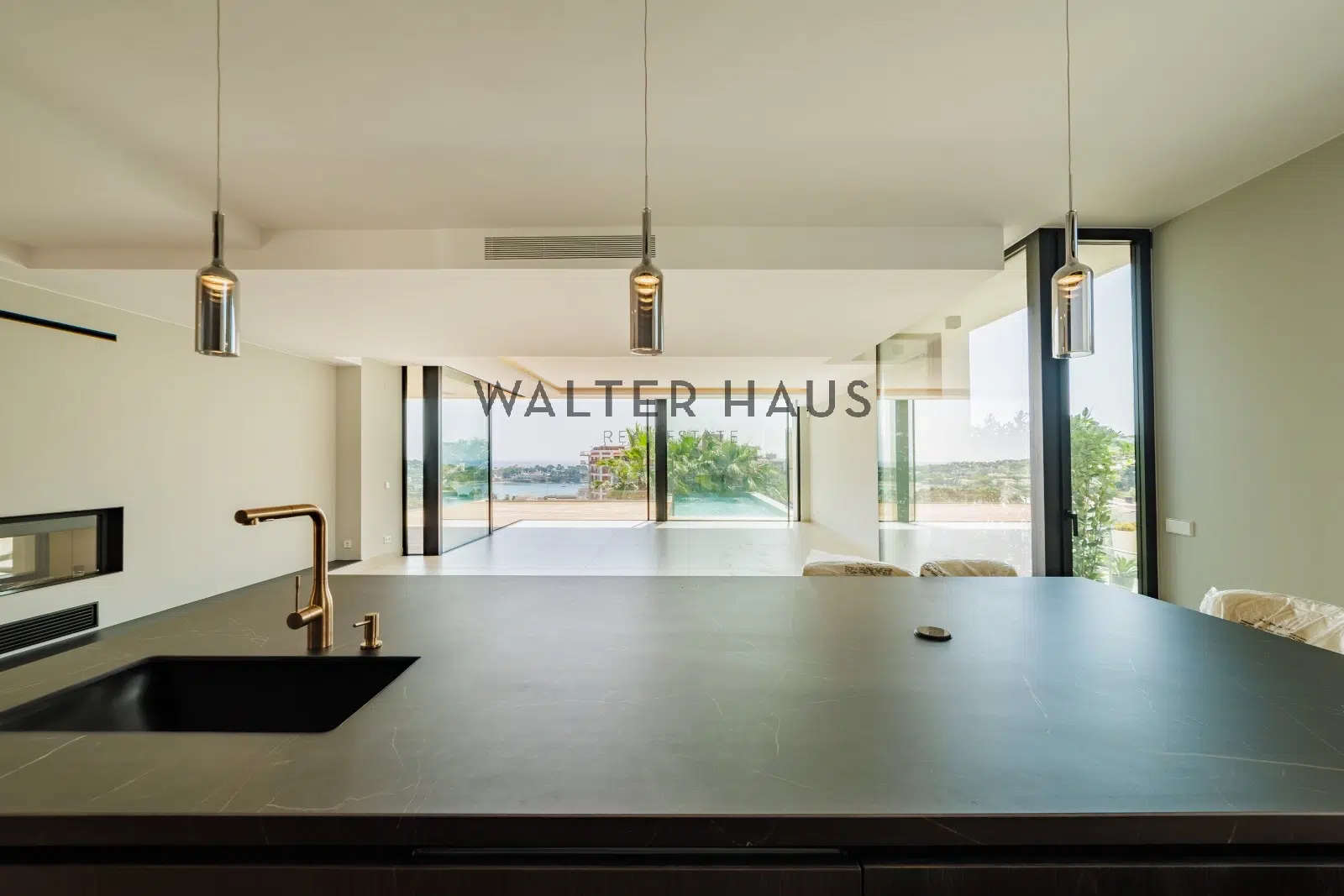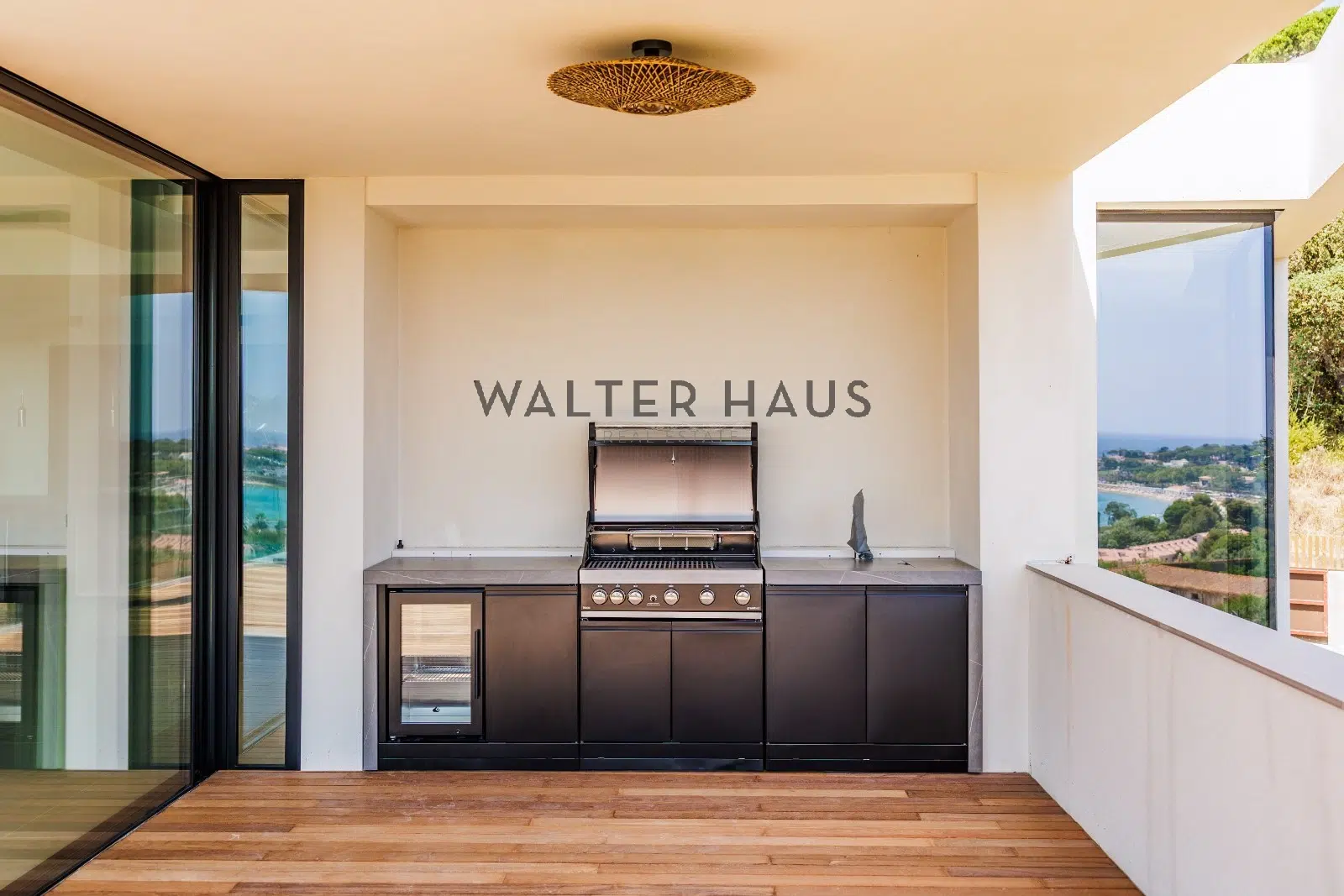 La cuisine, avec son îlot central, est conçue pour s’intégrer harmonieusement au quotidien et aux moments de convivialité. Le séjour s’ouvre sur une grande terrasse équipée d’une cuisine d’été et d’une piscine, offrant une vue panoramique sur la baie. Une suite parentale avec salle de bains privative se trouve également à ce niveau.