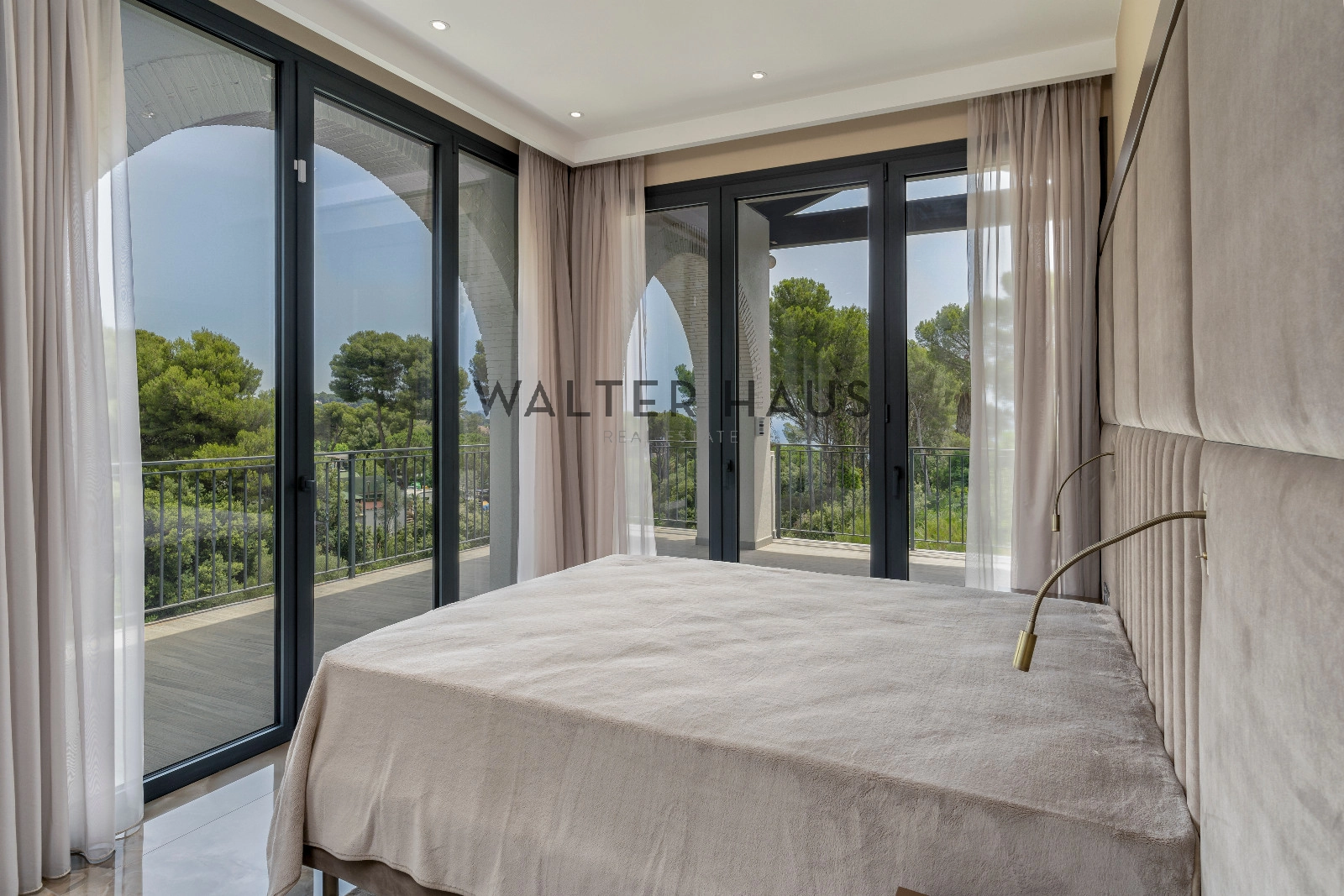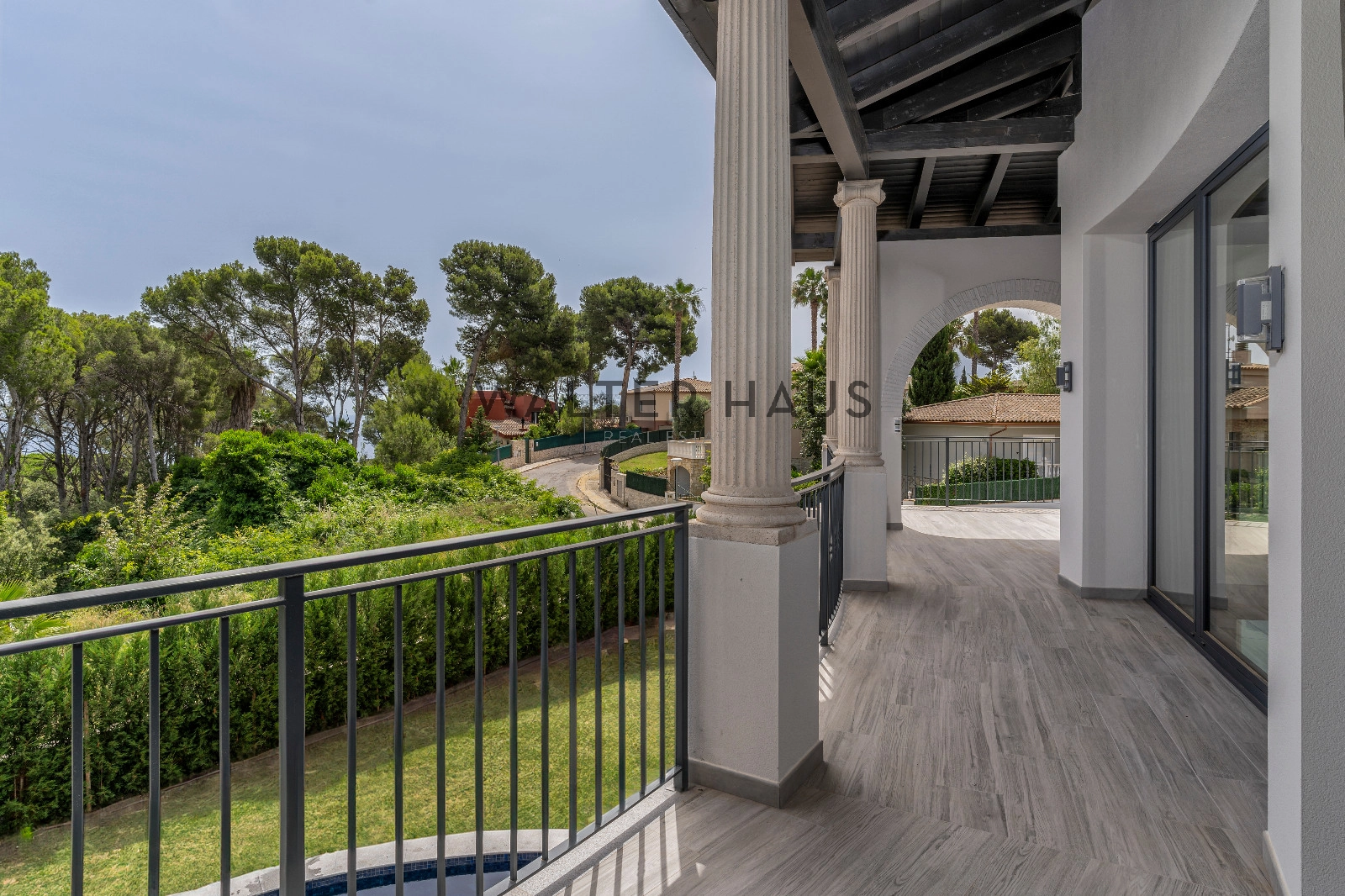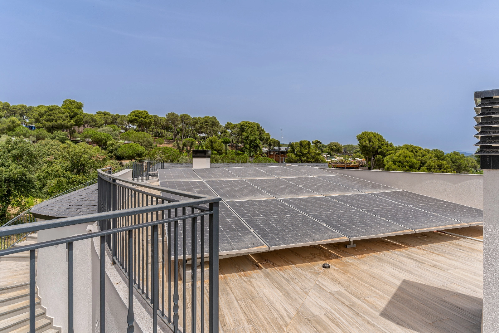 Au premier étage, la luxueuse suite parentale comprend un dressing et une salle de bains attenante. Trois autres chambres doubles, chacune avec salle de bains attenante et grand placard, donnent accès à une grande terrasse. Un escalier extérieur mène à la terrasse sur le toit avec vue panoramique sur la mer.