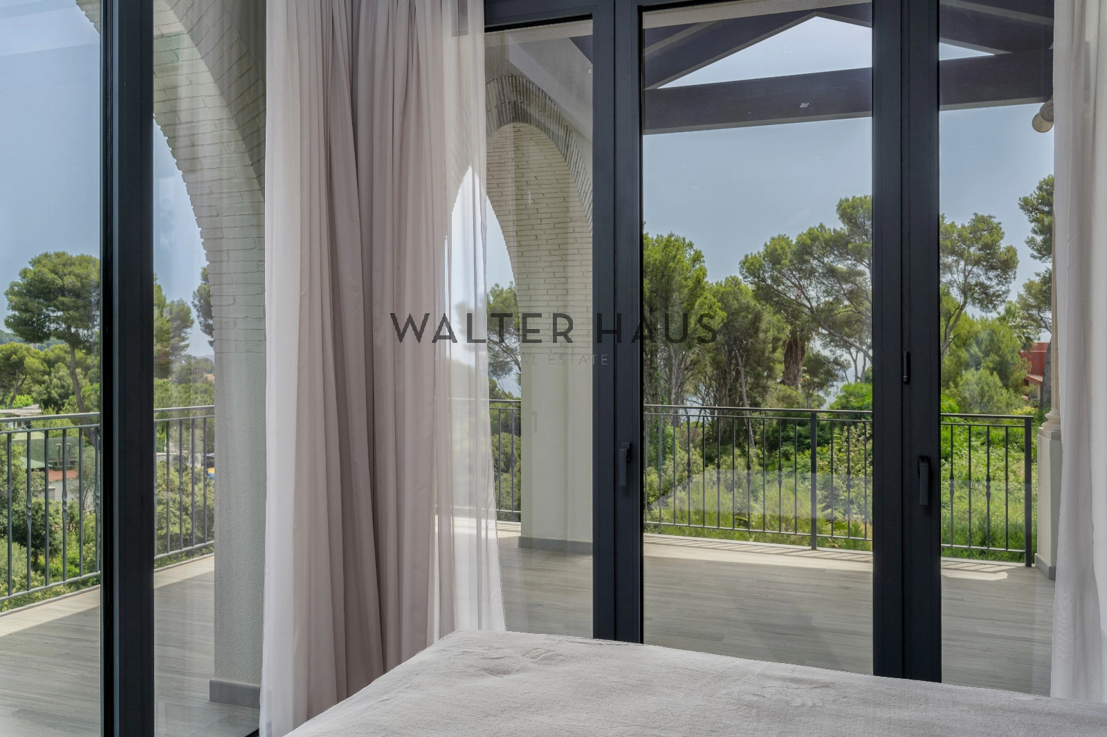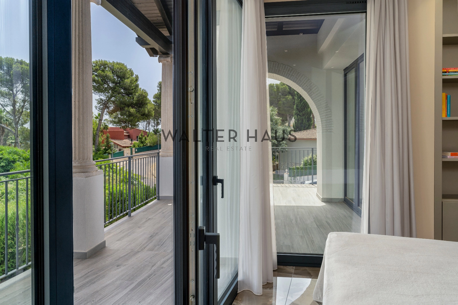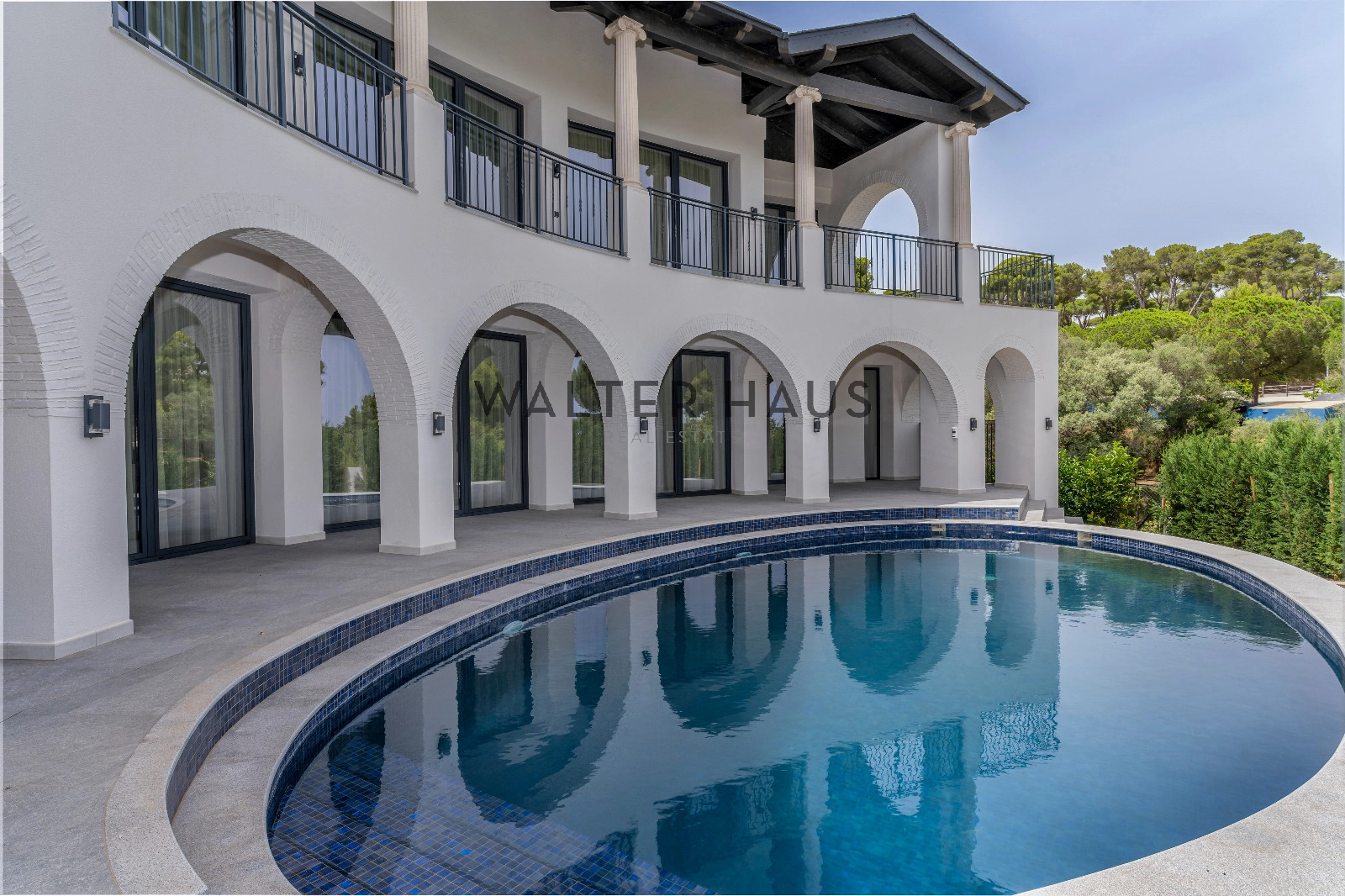 Au premier étage, la luxueuse suite parentale comprend un dressing et une salle de bains attenante. Trois autres chambres doubles, chacune avec salle de bains attenante et grand placard, donnent accès à une grande terrasse. Un escalier extérieur mène à la terrasse sur le toit avec vue panoramique sur la mer.
