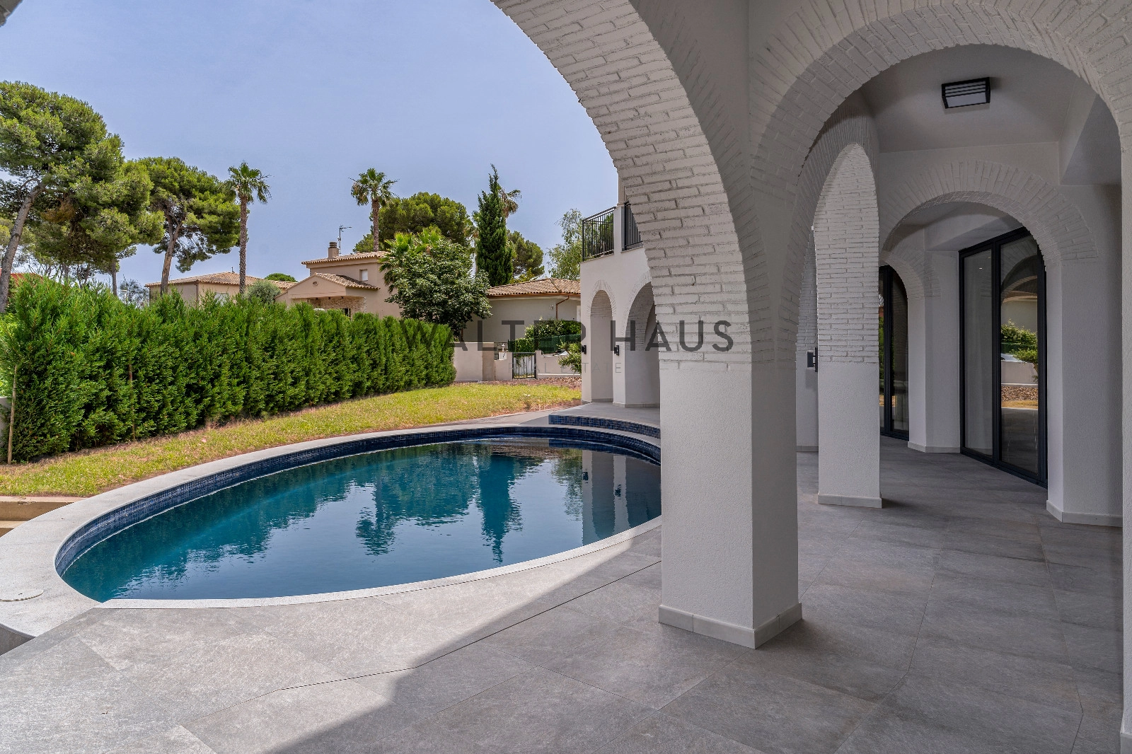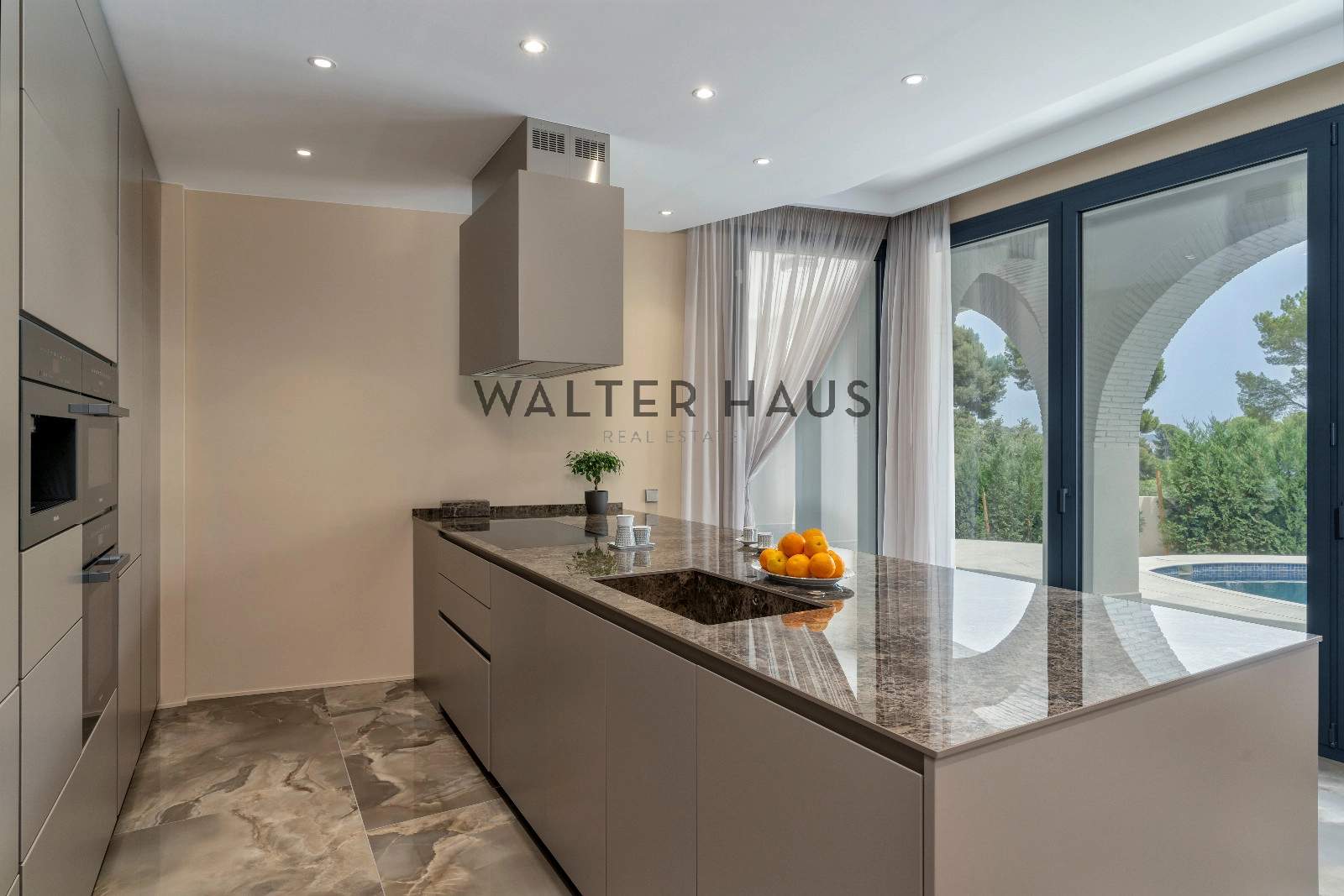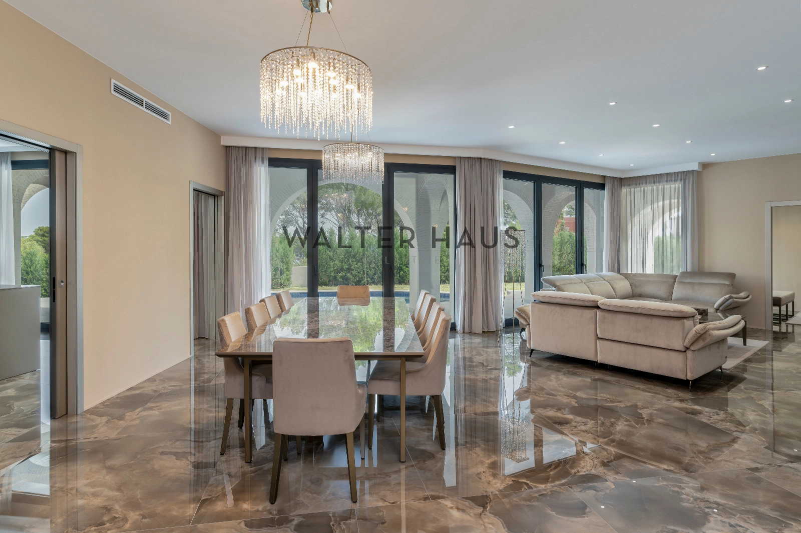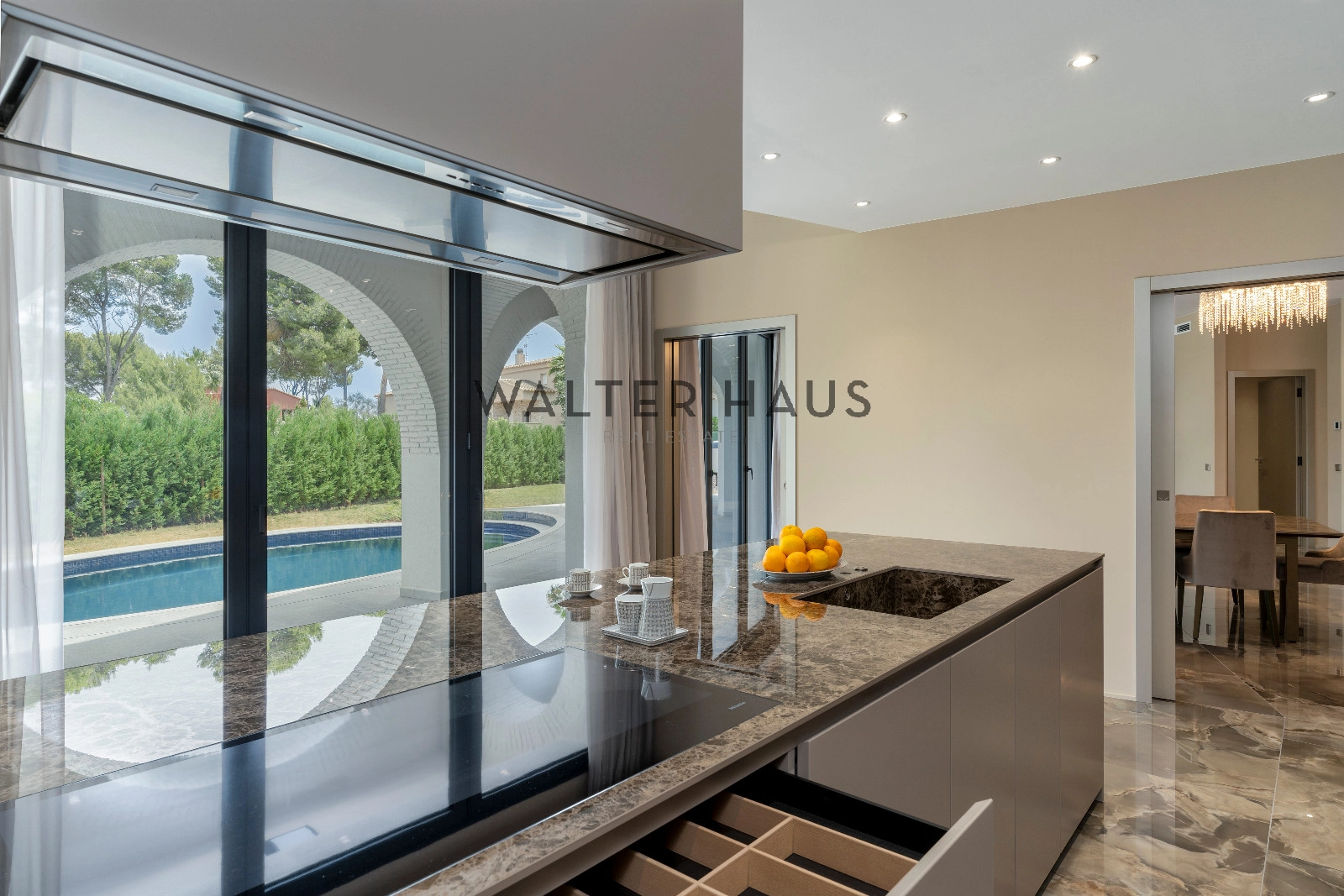 Magnifique maison à vendre dans le magnifique lotissement Treumal à Calonge, d’une superficie de 843 m² sur un terrain de 981 m². Dès l’entrée, vous découvrirez un hall d’entrée accueillant avec vestiaire et salle de bains invités, menant à un spacieux salon-salle à manger ouvert, relié à une véranda en forme de croissant. La cuisine italienne sur mesure est équipée d’appareils électroménagers Miele, d’un cellier et d’une cuisine de service. Au même niveau, vous trouverez une chambre avec salle de bains attenante et accès à la véranda, ainsi qu’une buanderie entièrement équipée.