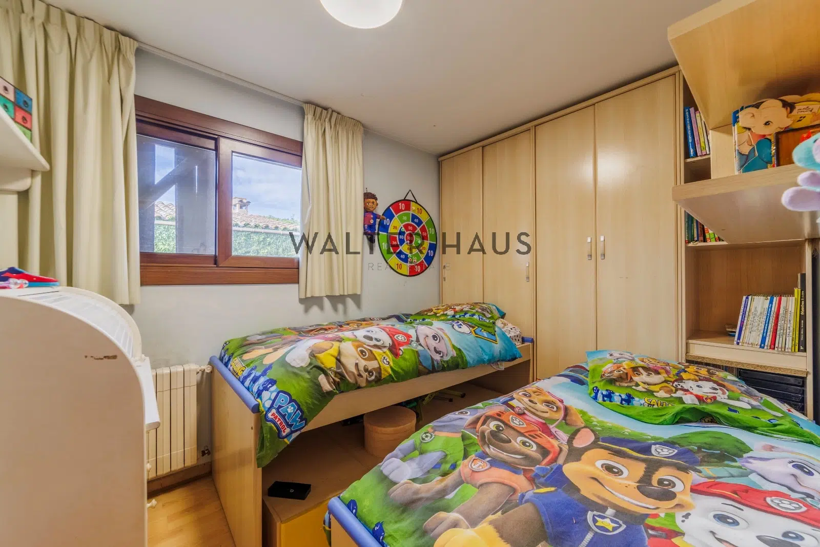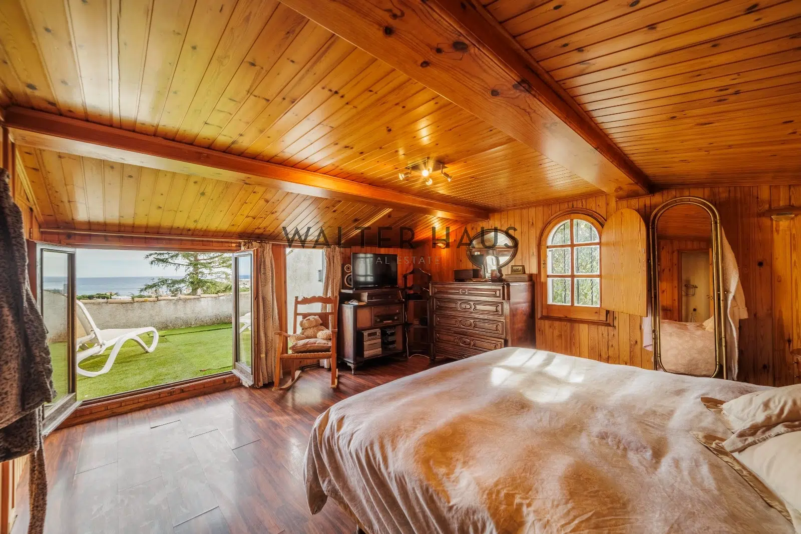 Le deuxième étage est entièrement occupé par la suite parentale, un espace mansardé avec salle de bains, dressing et terrasse solarium privative avec vue sur la mer. À l’extérieur, la maison dispose d’un jardin accueillant, d’une piscine, d’un espace barbecue, d’une aire de jeux pour enfants et d’un espace fitness.