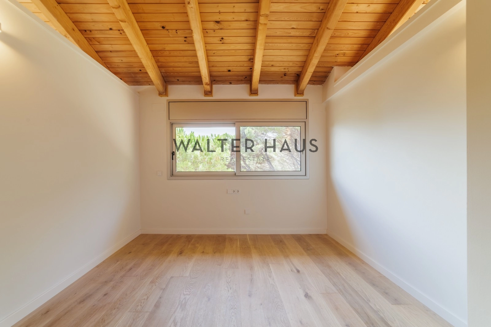 L’étage supérieur abrite trois chambres doubles, dont la suite parentale avec dressing, baignoire balnéo et douche avec vue sur la nature environnante, ainsi qu’une salle de bain complète pour les autres chambres. Le sous-sol comprend un garage double et une pièce supplémentaire avec salle de bain. Les finitions de haute qualité sont un atout majeur, telles que le parquet en bois naturel, les fenêtres en aluminium à haute performance énergétique et la climatisation réversible.