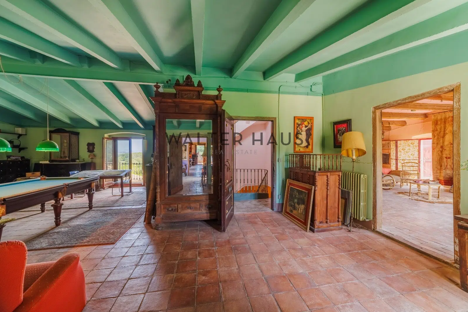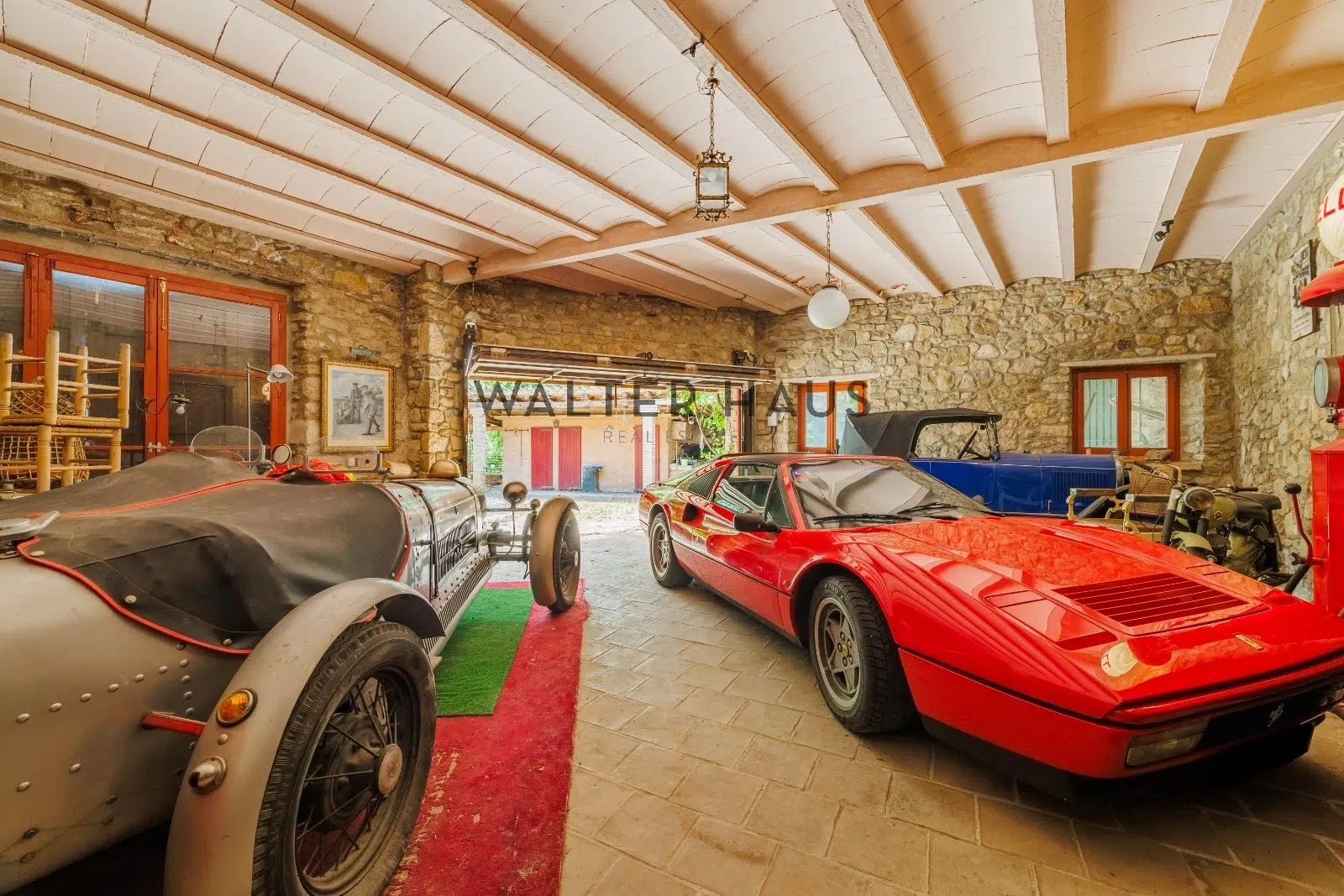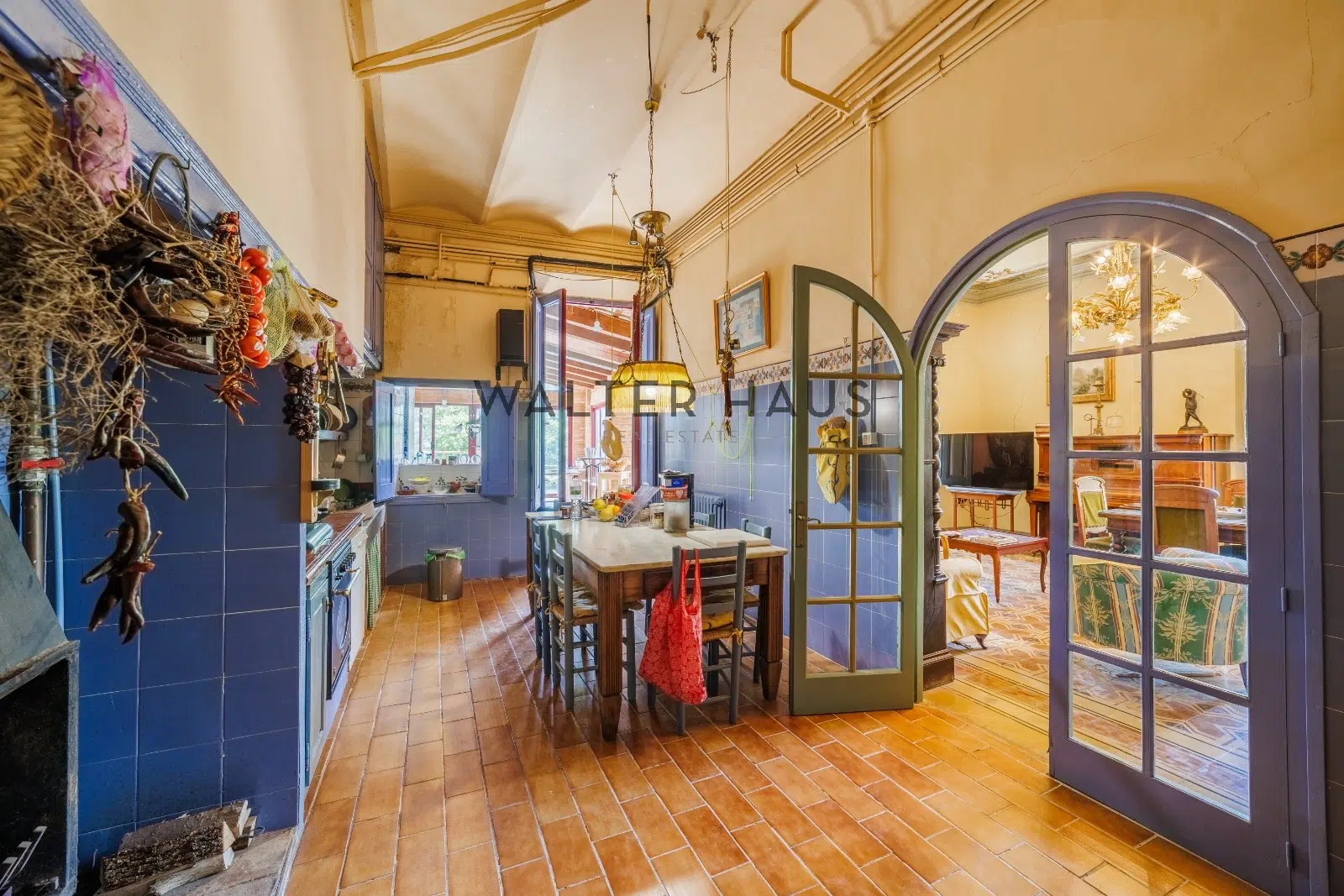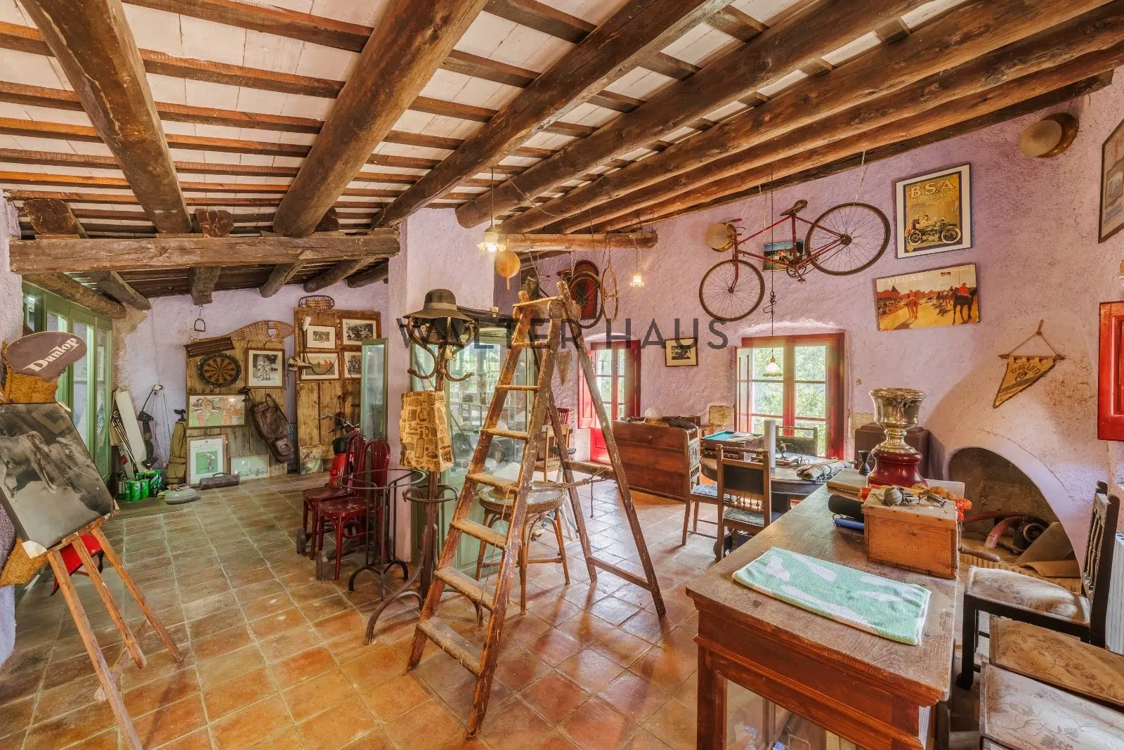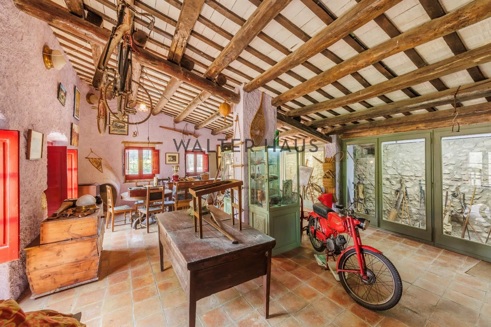 Les détails intérieurs se distinguent par leur caractère unique, comme les voûtes en pierre et en brique et les murs en pierre de l’ancien moulin du XVIIIe siècle sur lequel la propriété a été construite. La maison dispose d’une grande cuisine ancienne équipée d’une cheminée moderniste, reliée à un espace ouvert plus moderne offrant une vue sur le torrent et les montagnes. De plus, il dispose de plusieurs pièces, dont une chambre d’amis, une salle de musée, une salle de billard et un garage.