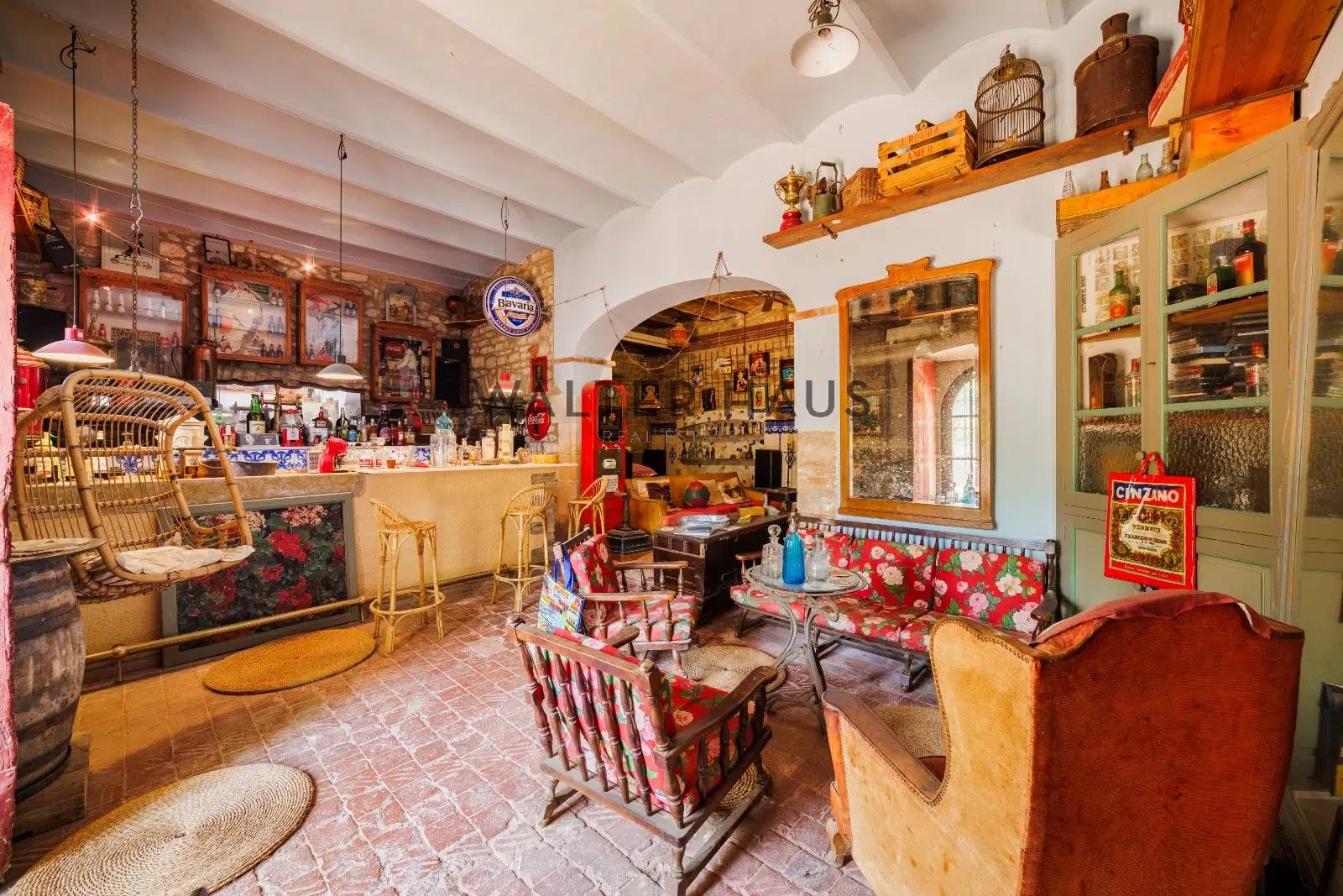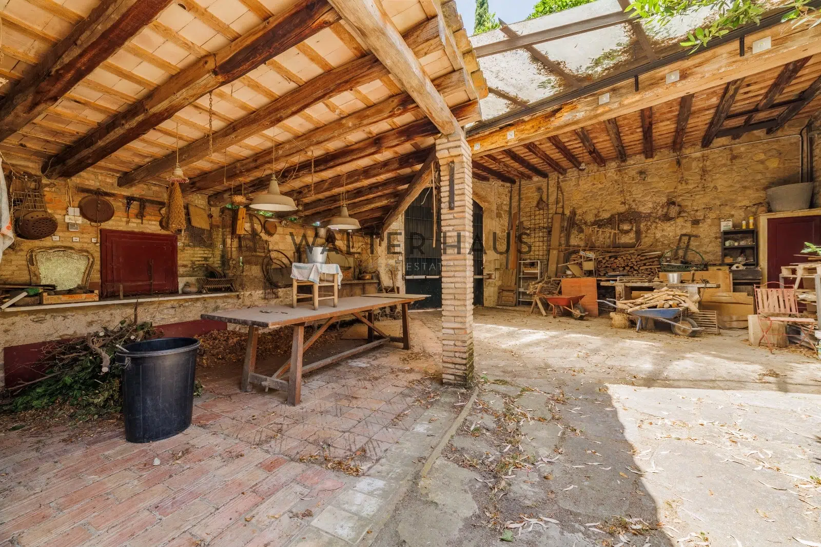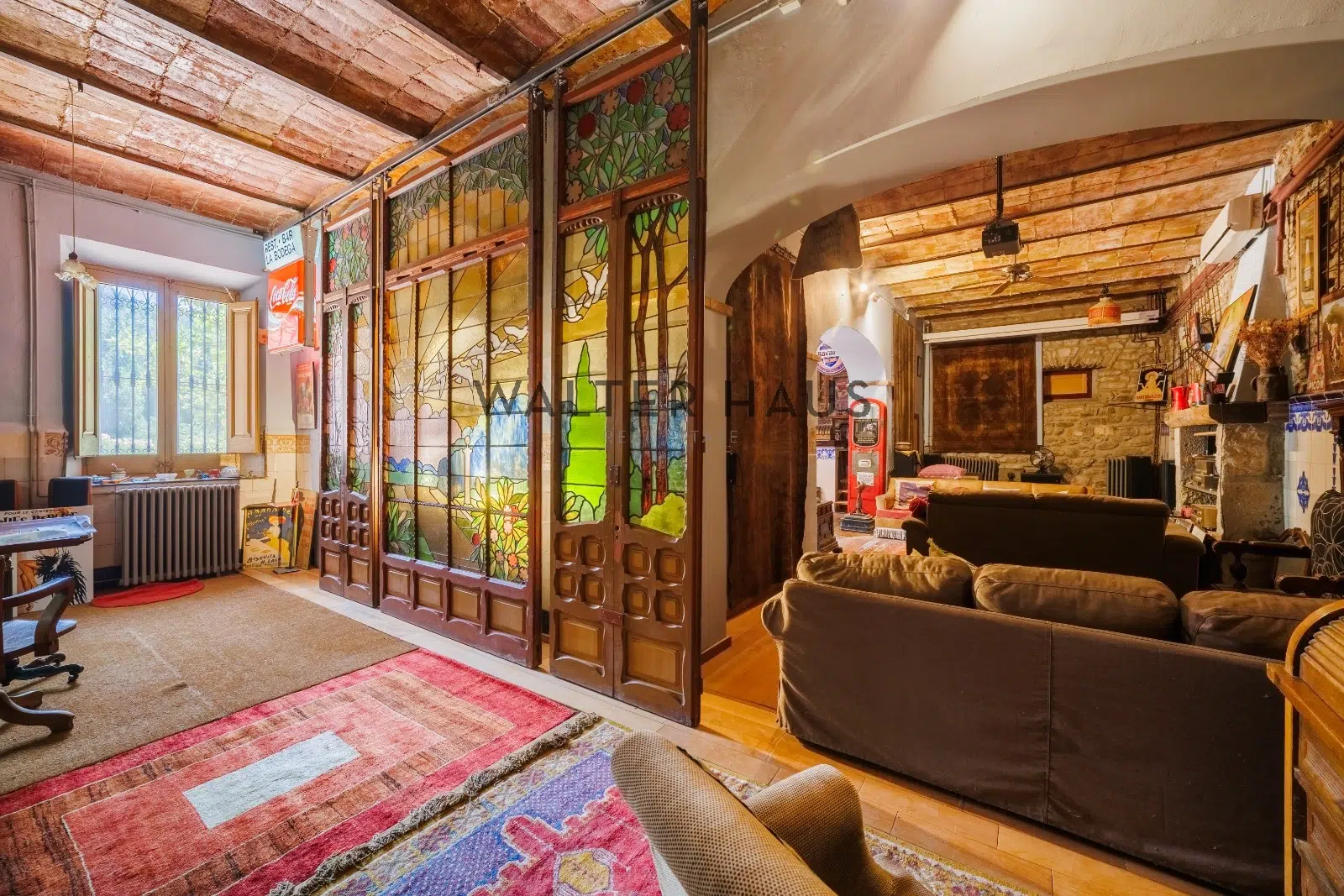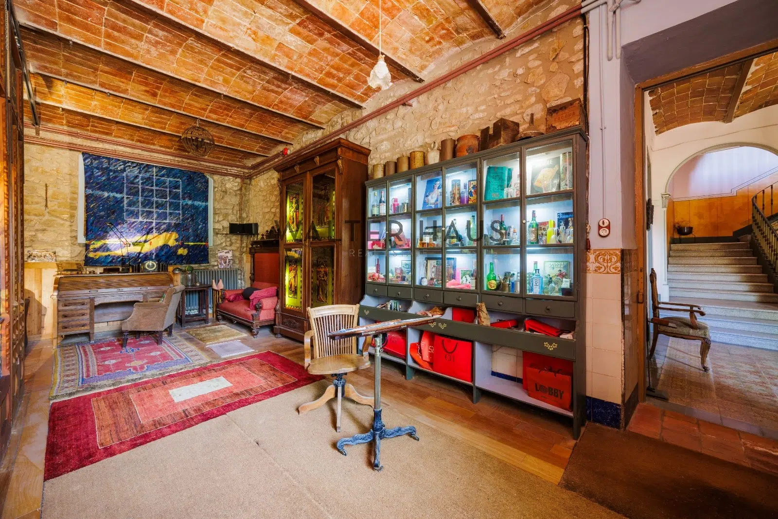 Les détails intérieurs se distinguent par leur caractère unique, comme les voûtes en pierre et en brique et les murs en pierre de l’ancien moulin du XVIIIe siècle sur lequel la propriété a été construite. La maison dispose d’une grande cuisine ancienne équipée d’une cheminée moderniste, reliée à un espace ouvert plus moderne offrant une vue sur le torrent et les montagnes. De plus, il dispose de plusieurs pièces, dont une chambre d’amis, une salle de musée, une salle de billard et un garage.