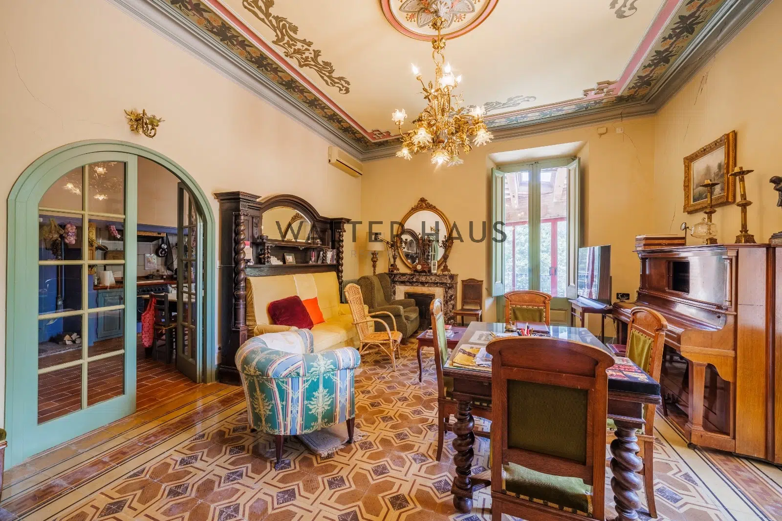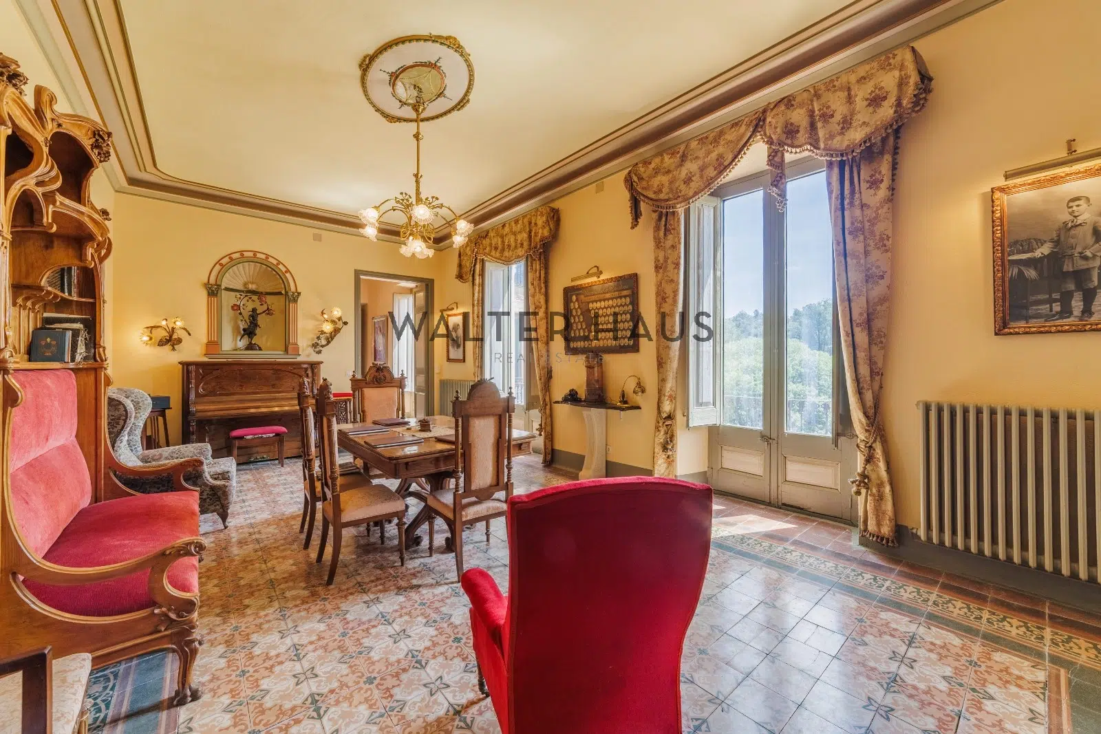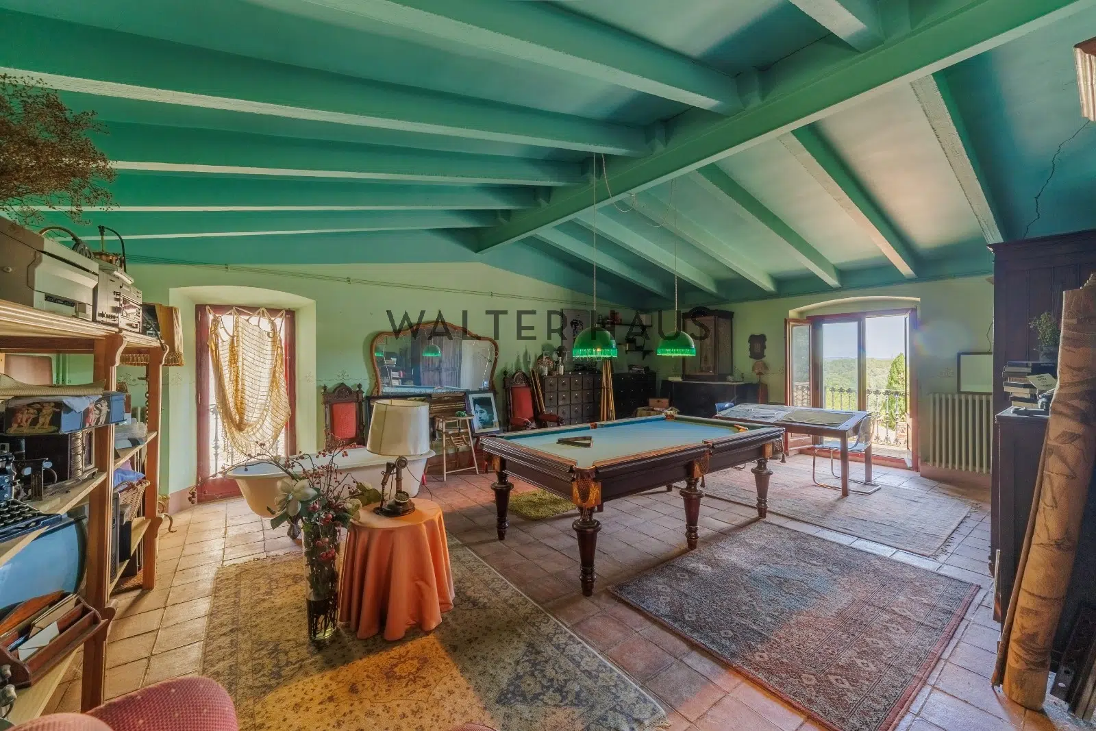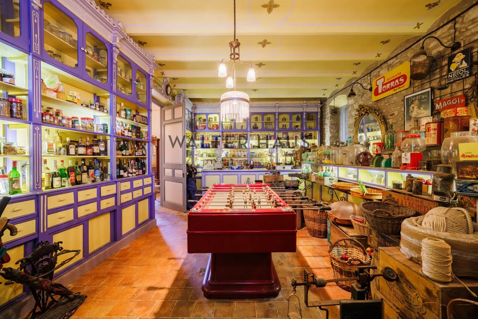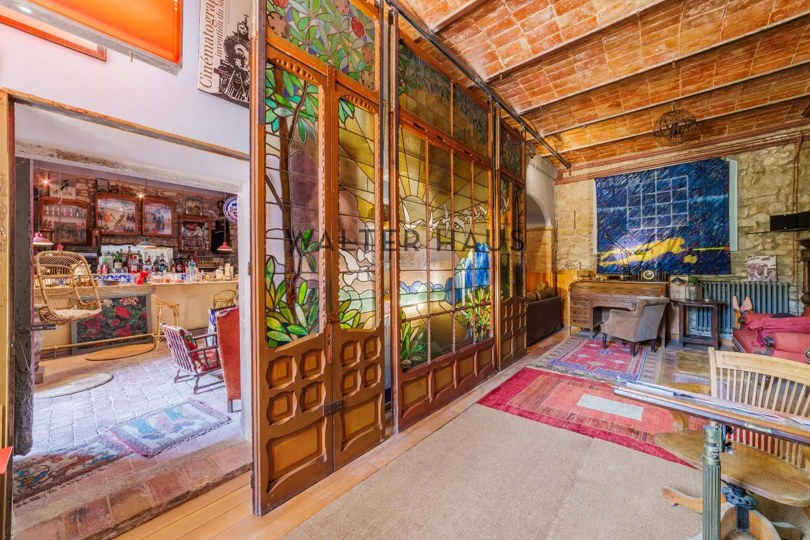 Les détails intérieurs se distinguent par leur caractère unique, comme les voûtes en pierre et en brique et les murs en pierre de l’ancien moulin du XVIIIe siècle sur lequel la propriété a été construite. La maison dispose d’une grande cuisine ancienne équipée d’une cheminée moderniste, reliée à un espace ouvert plus moderne offrant une vue sur le torrent et les montagnes. De plus, il dispose de plusieurs pièces, dont une chambre d’amis, une salle de musée, une salle de billard et un garage.
