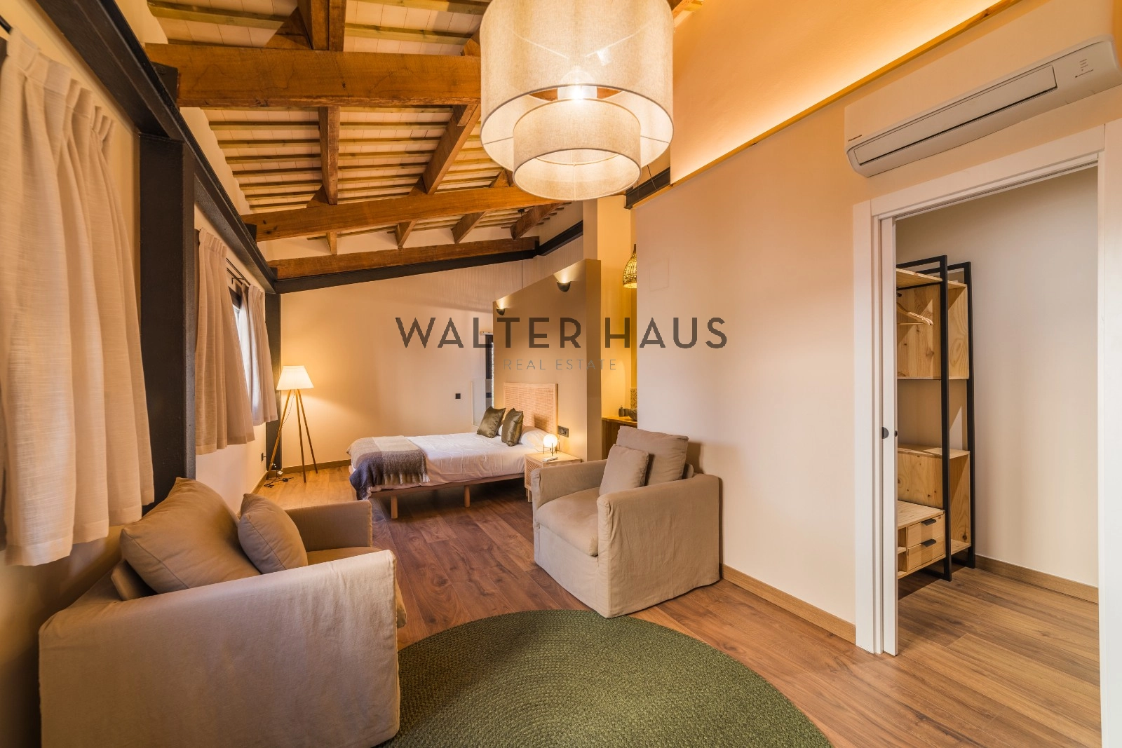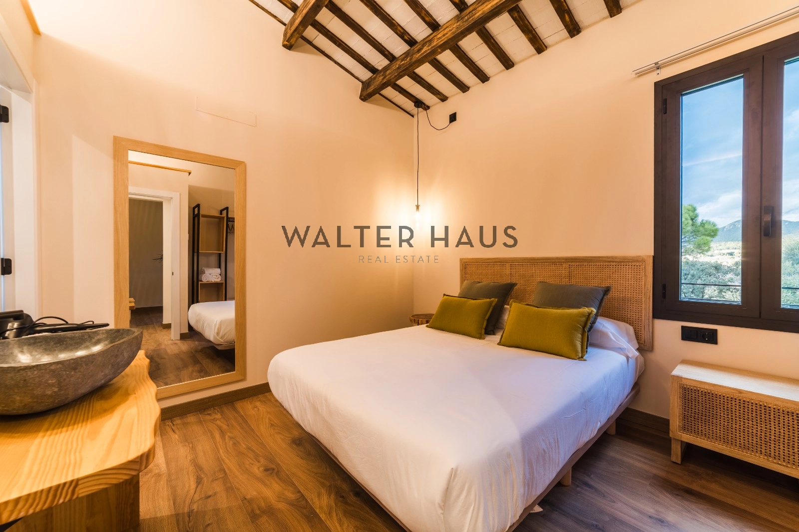 Le cœur du domaine est constitué de trois maisons aux caractéristiques distinctes. La maison principale a été soigneusement restaurée et offre des pièces spacieuses, fonctionnelles et esthétiques, conçues pour une vie de famille confortable. Elle comprend une cuisine ouverte sur le séjour/salle à manger, une buanderie, des toilettes invités et un accès à une terrasse avec barbecue ou au jardin avec piscine, jouxtant l’ancien moulin. L’espace nuit comprend quatre chambres avec salle de bains privative au premier étage et, au deuxième étage, une chambre mansardée avec baignoire offrant une vue imprenable sur les couchers de soleil. L’ancienne écurie, désormais transformée en maison individuelle avec cuisine entièrement équipée, séjour/salle à manger offrant une vue imprenable, une suite parentale au rez-de-chaussée et deux autres suites parentales à l’étage, dont une avec baignoire balnéo et poutres apparentes, a su conserver son charme rustique d’antan tout en intégrant des équipements modernes, notamment une piscine privée. Le troisième bâtiment, en attente de rénovation, offre un potentiel de personnalisation, que ce soit comme extension de la résidence principale ou comme maison d’hôtes. Les deux maisons restaurées sont entièrement équipées et adaptées à la location saisonnière haut de gamme. Le jardin abrite également un ancien moulin d’intérêt historique.
