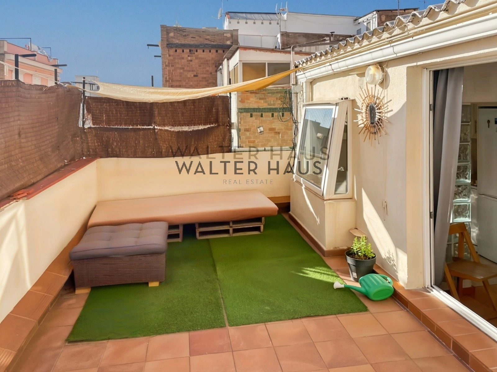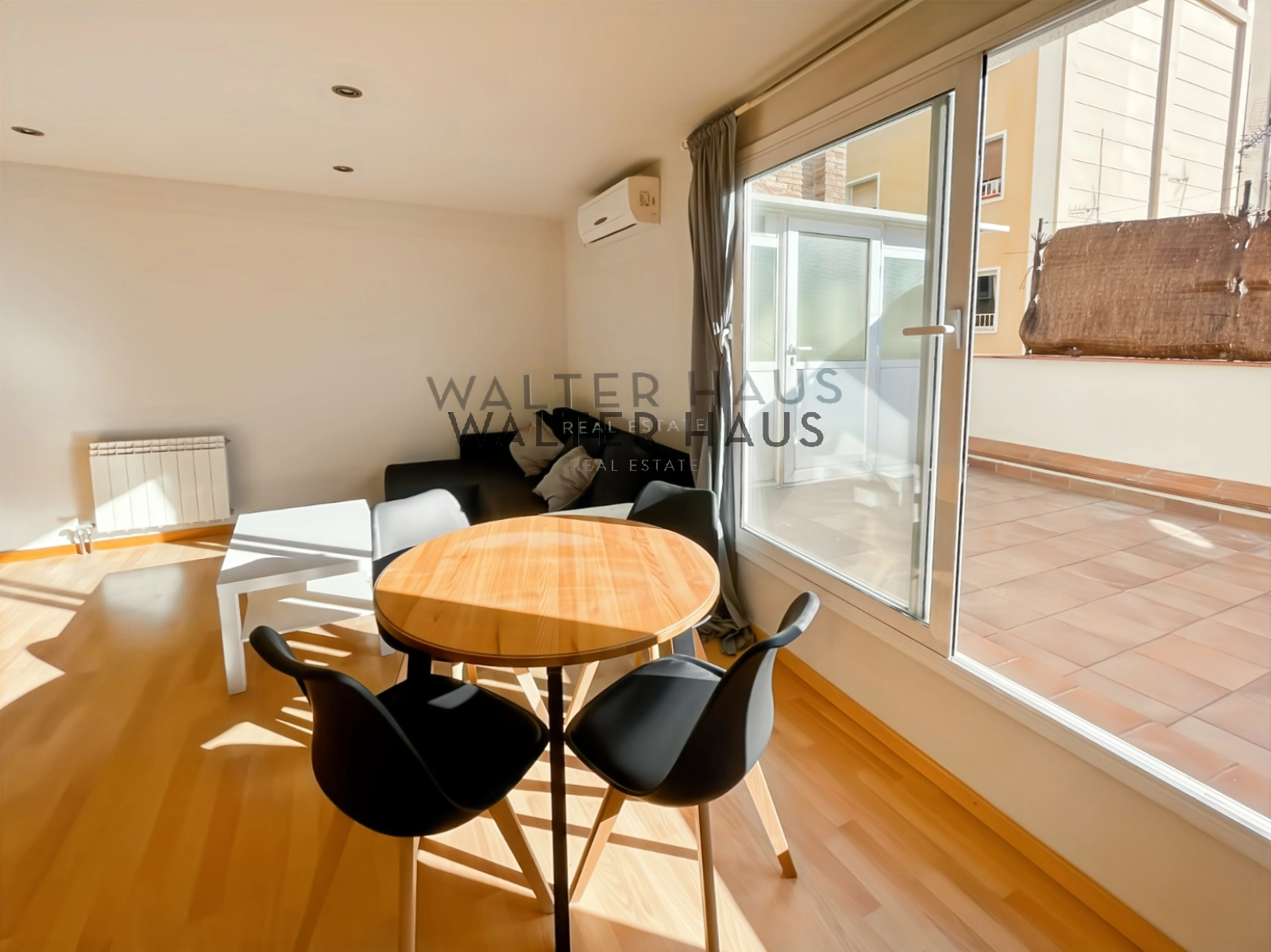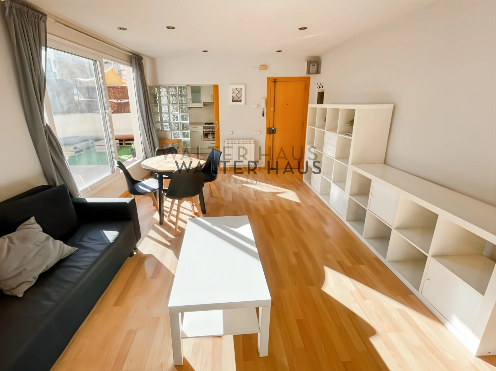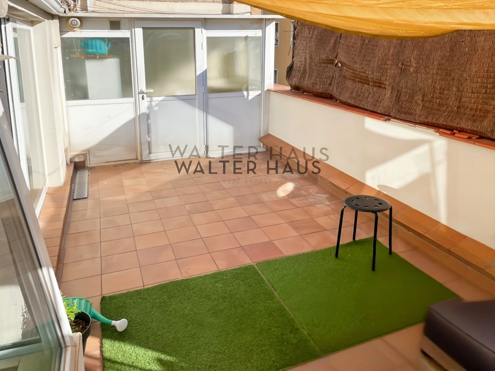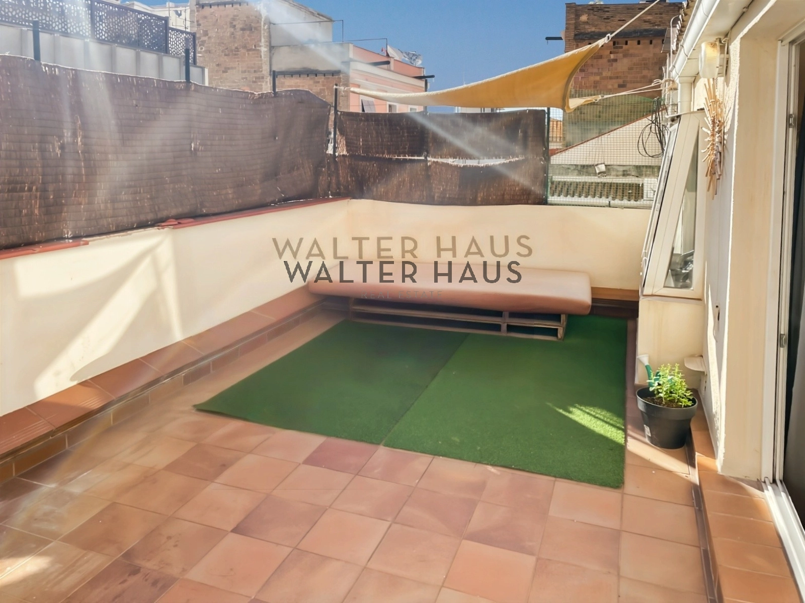 Lumineux appartement-terrasse entièrement rénové de 50 m² habitables et 20 m² de terrasse, dans un immeuble rénové SANS ASCENSEUR, à deux pas de la Plaça Joanic, dans le quartier historique de Vila de Gràcia à Barcelone.