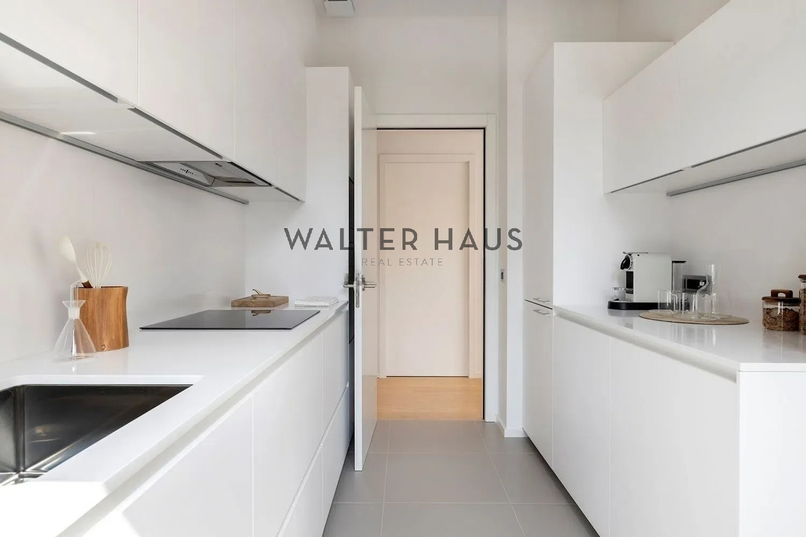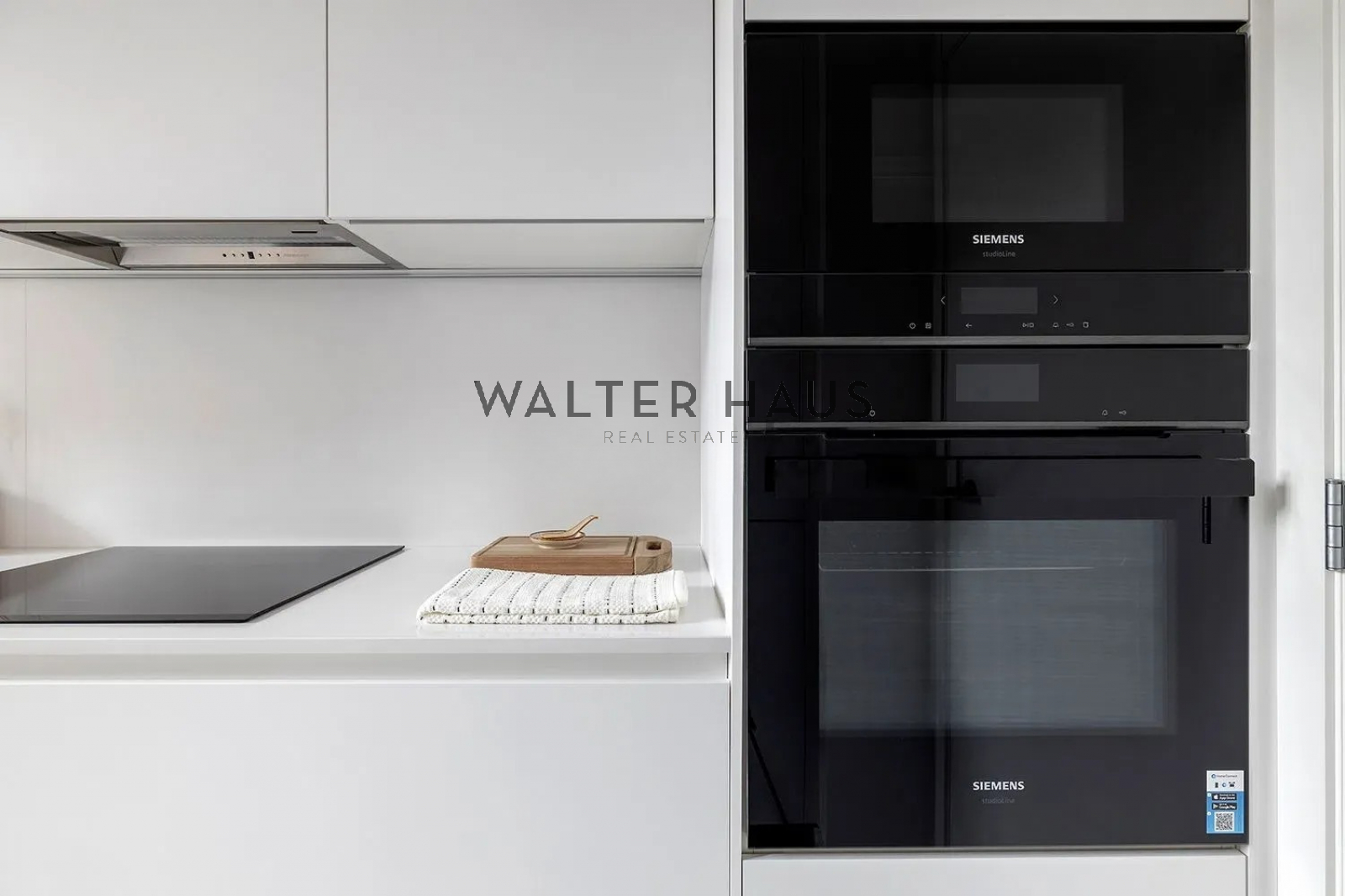 L’espace de vie comprend un lumineux séjour-salle à manger donnant sur deux balcons et une cuisine séparée entièrement équipée d’appareils électroménagers haut de gamme.