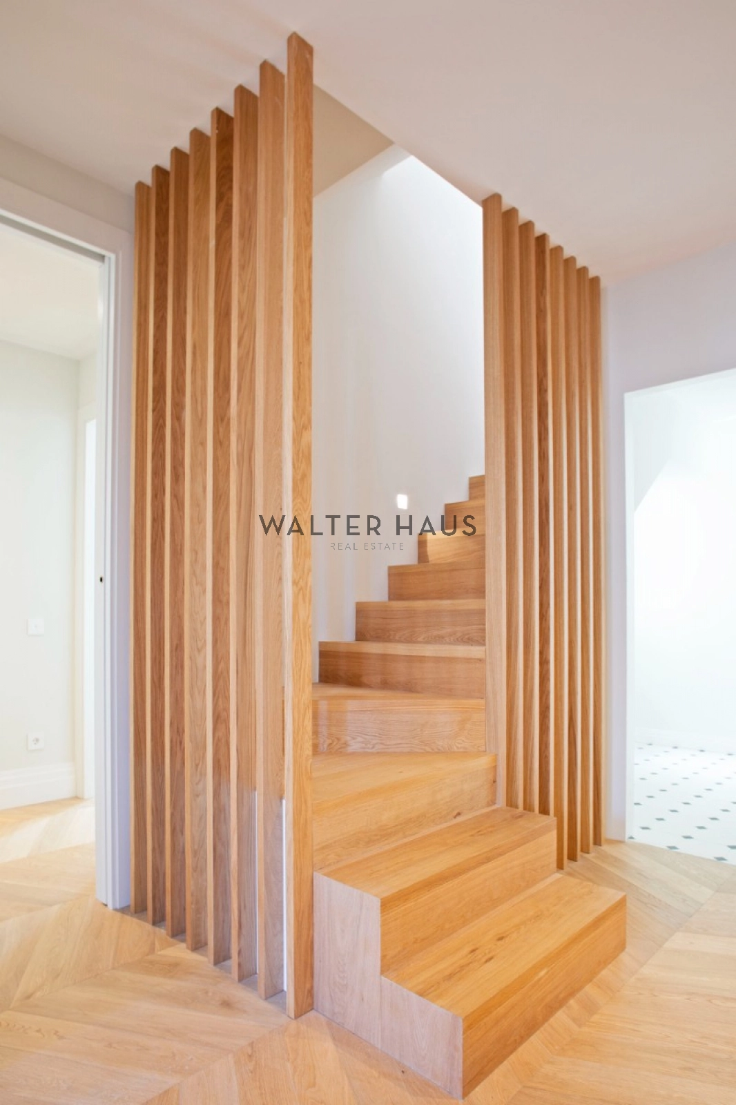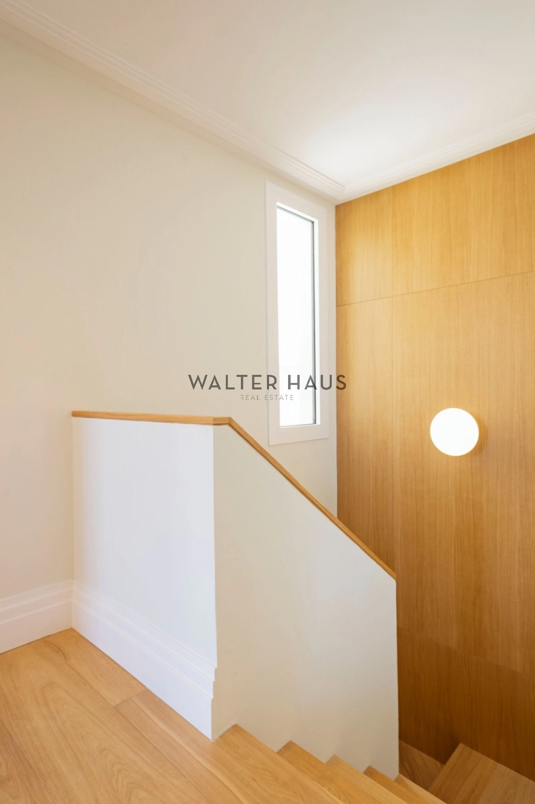 La planta superior alberga dos master suites con acceso directo a la terraza orientada al sureste, desde donde se pueden disfrutar vistas privilegiadas de Barcelona. Las habitaciones están equipadas con armarios empotrados de interior textil y acabados de primera calidad. Los cerramientos de triple vidrio, los electrodomésticos Liebherr y el suelo de parquet natural garantizan el máximo confort.