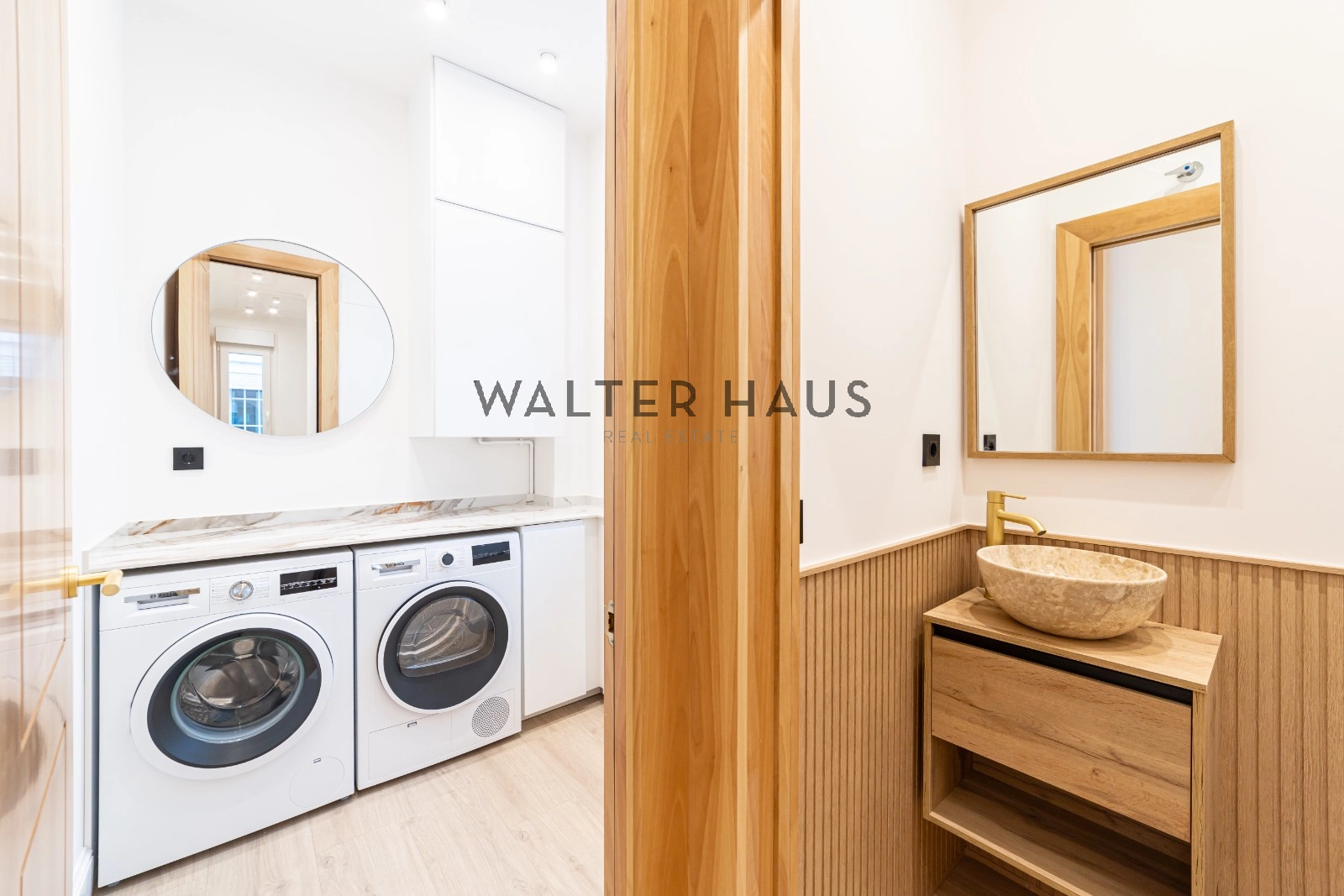 La cocina independiente ofrece gran capacidad de almacenamiento y cuenta con electrodomésticos de la marca Siemens empotrados, garantizando una estética limpia y moderna. Este espacio posee ventana propia, lo que asegura ventilación y luz natural. Anexa a la cocina se encuentra una espaciosa zona de lavandería equipada y con ventana exterior. En el área más íntima, la propiedad presenta dos dormitorios dobles en suite. La habitación principal incluye una zona de vestidor con armarios iluminados y un baño completo con doble lavabo. El segundo dormitorio también dispone de armarios revestidos con iluminación integrada y baño privado completo.