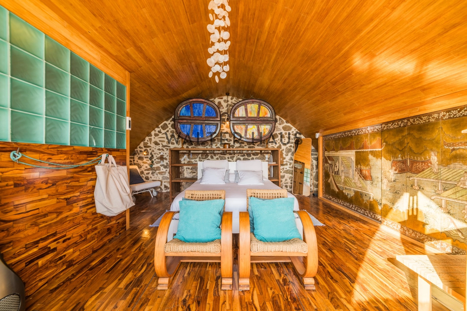 La vivienda se distribuye en un espacio diáfano que integra cocina equipada, comedor y salón, junto con un baño con ducha. En la planta superior, accesible mediante escaleras de madera, se encuentra un dormitorio con techo de madera redondeado y cama orientada hacia el mar, además de un baño completo con bañera. La propiedad incluye también una mina de agua natural, asegurando suministro constante, un detalle singular que aporta valor y autonomía.