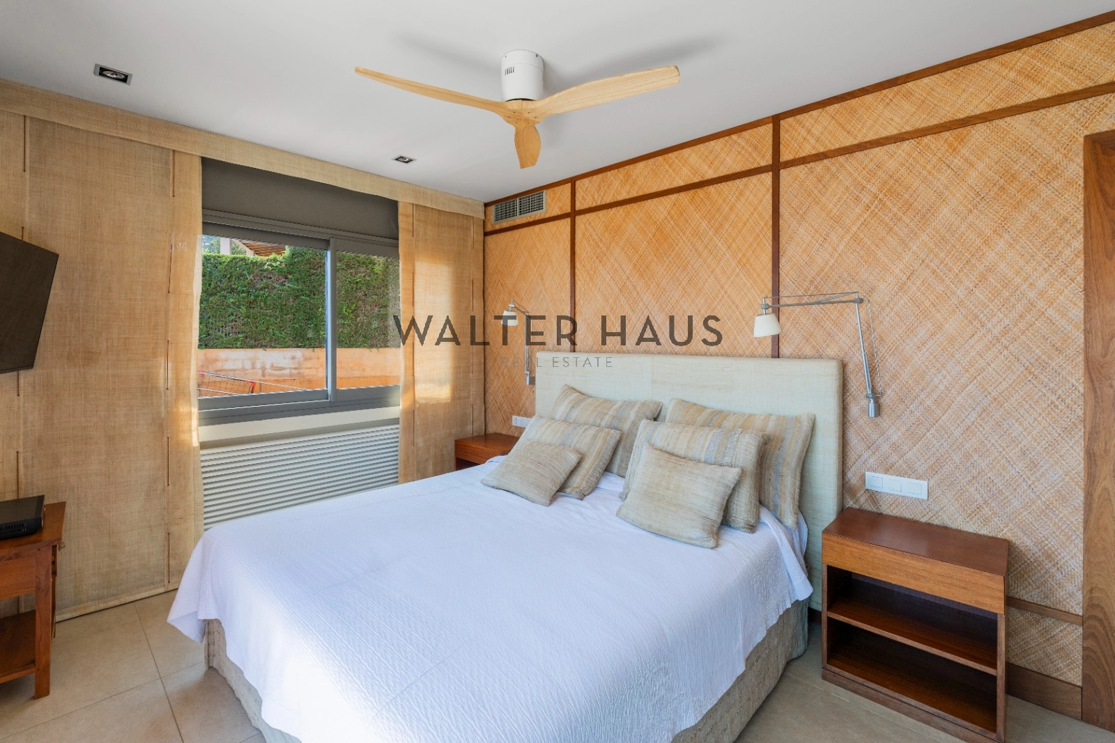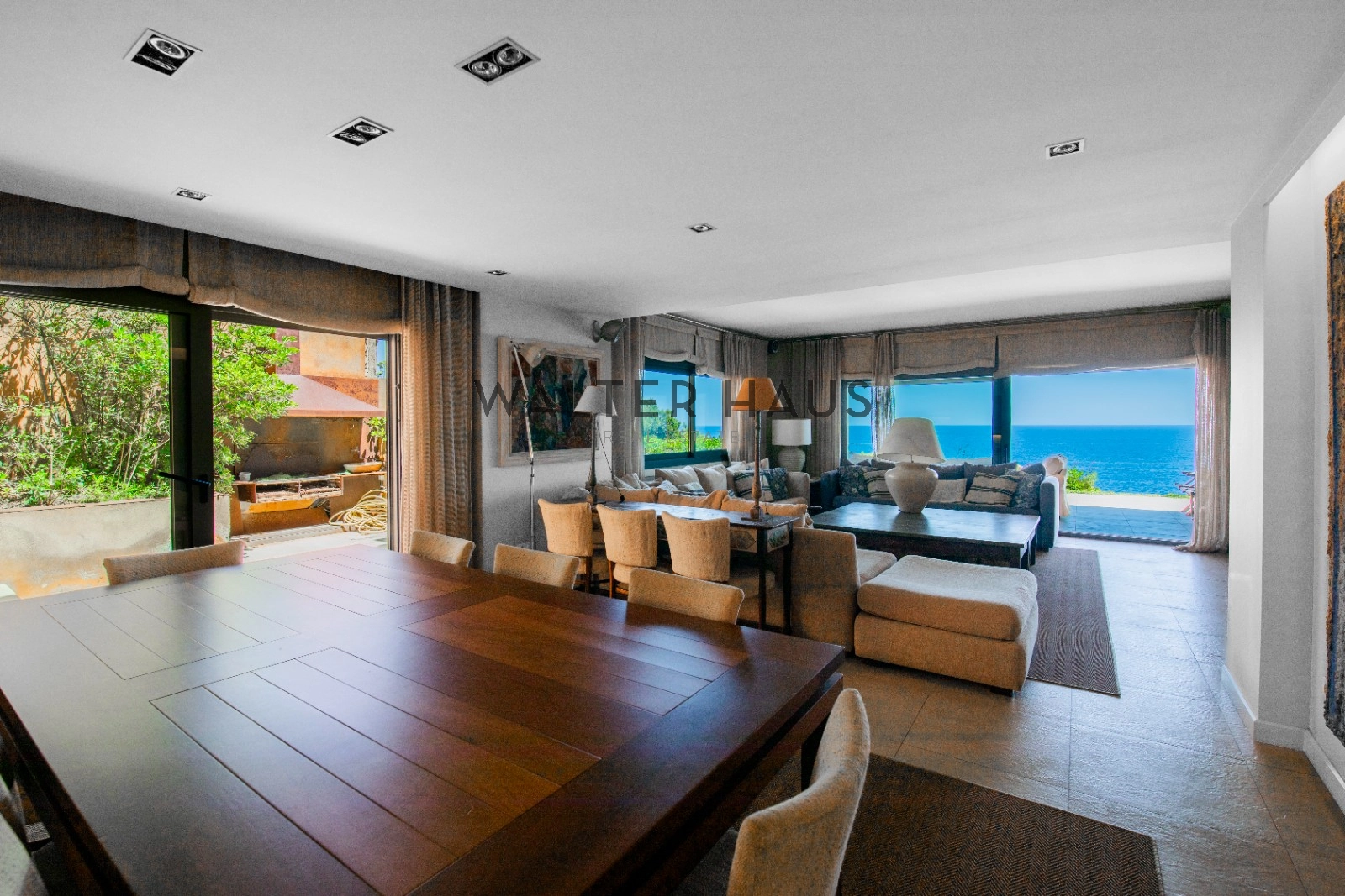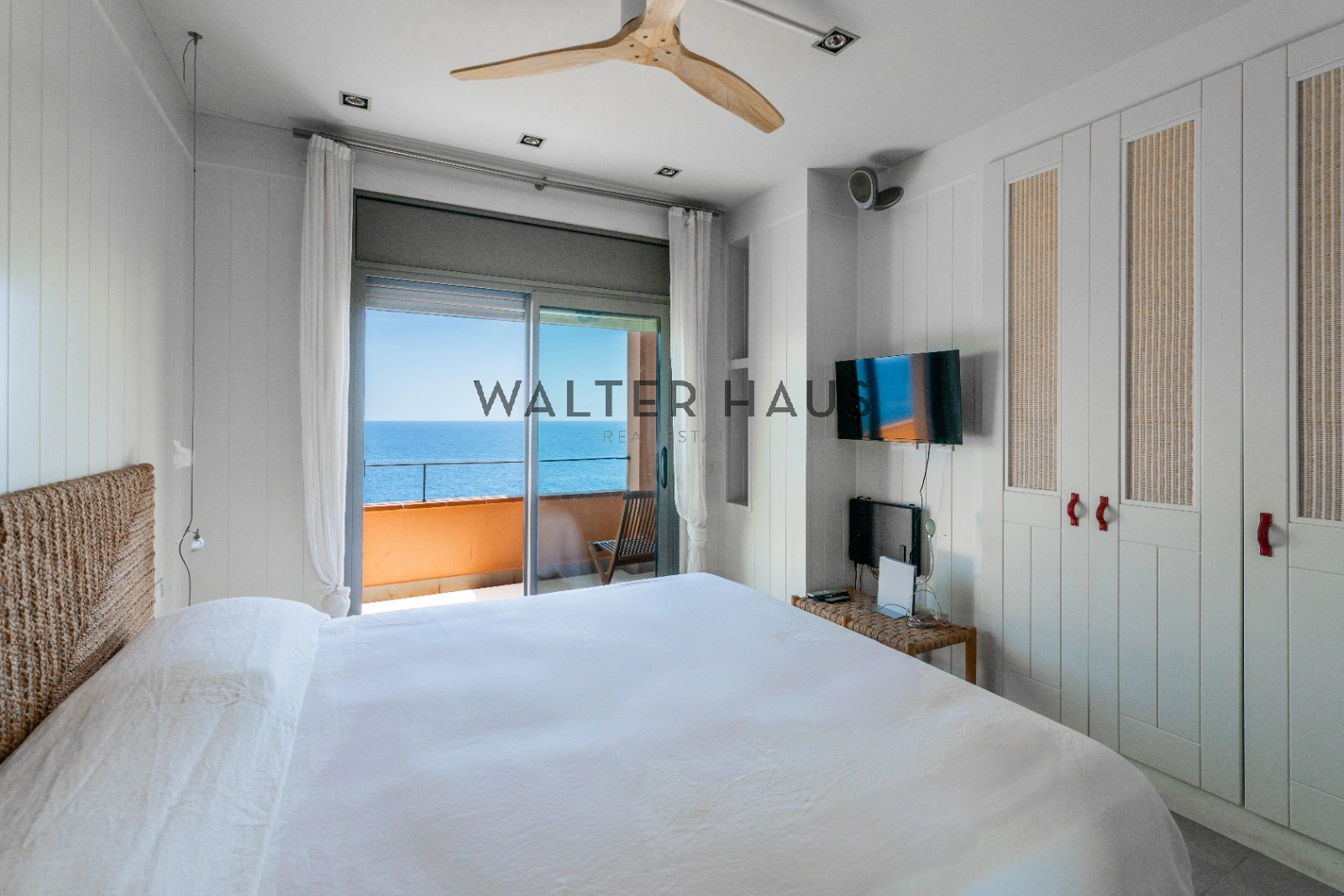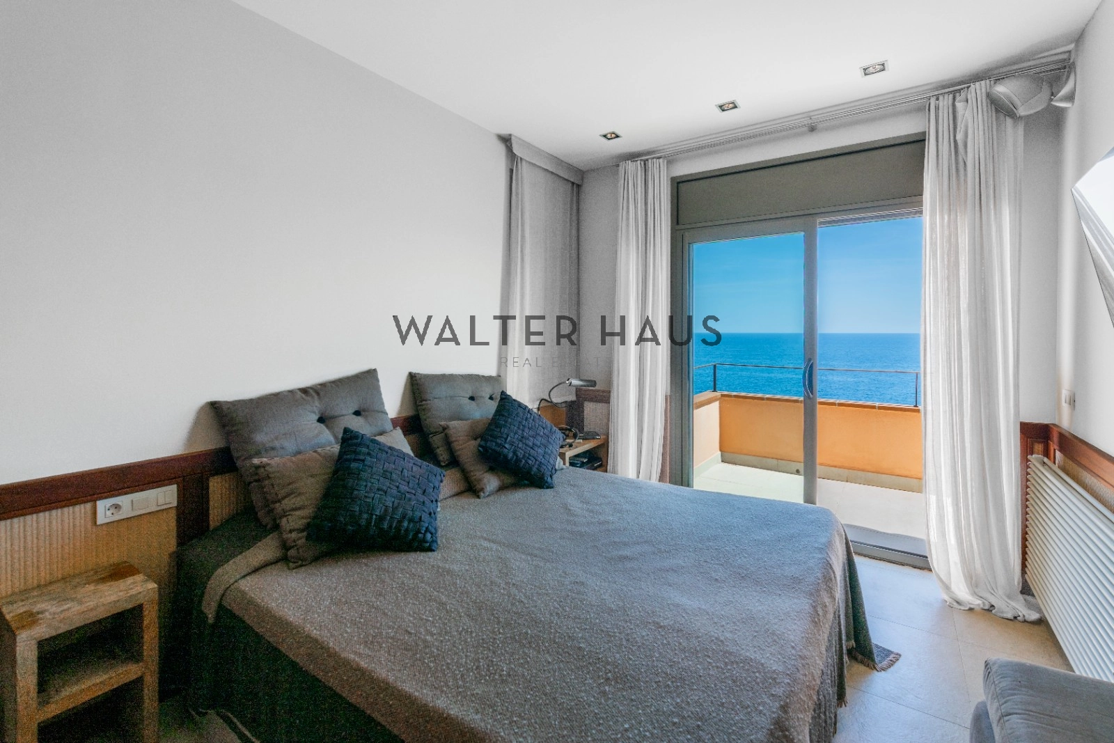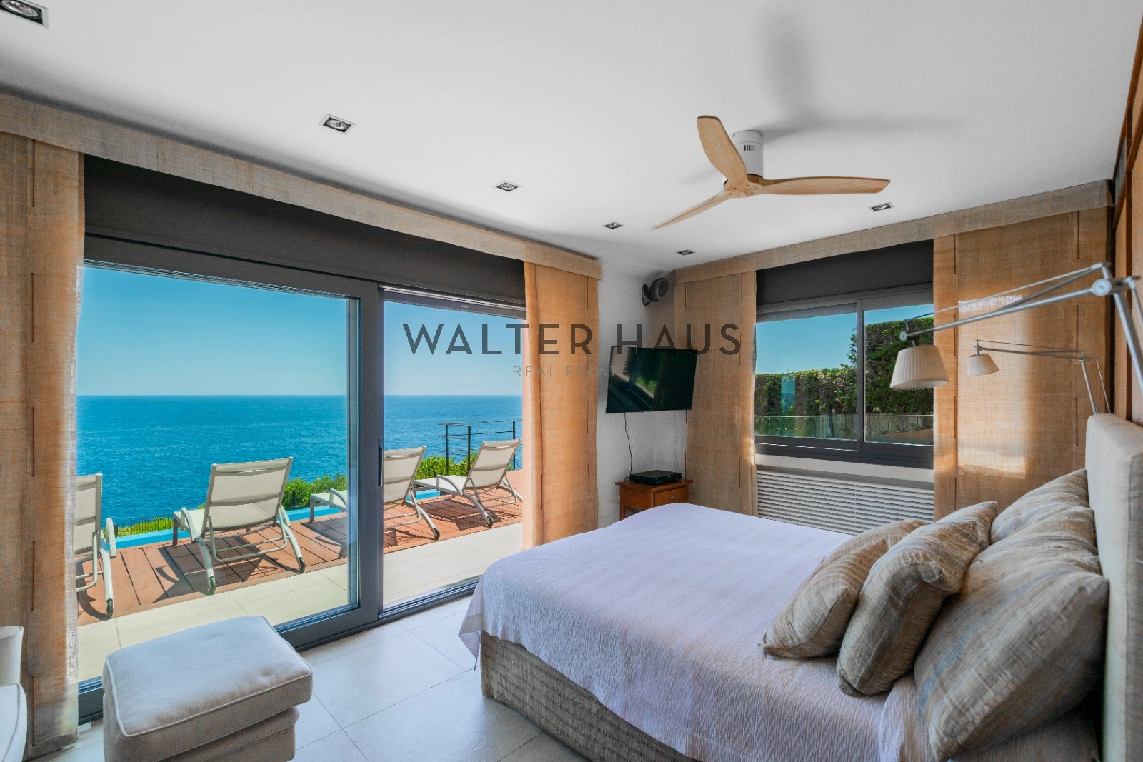 En la planta principal se encuentra un acogedor recibidor, un salón-comedor diáfano con acceso directo al jardín, porche cubierto y zona de barbacoa junto a la piscina de agua salada. También dispone de una cocina independiente totalmente equipada, aseo de cortesía y una suite principal con vistas despejadas al mar. La planta superior acoge cinco dormitorios dobles, tres de ellos con baño en suite y terrazas privadas, y dos que comparten un baño completo.
