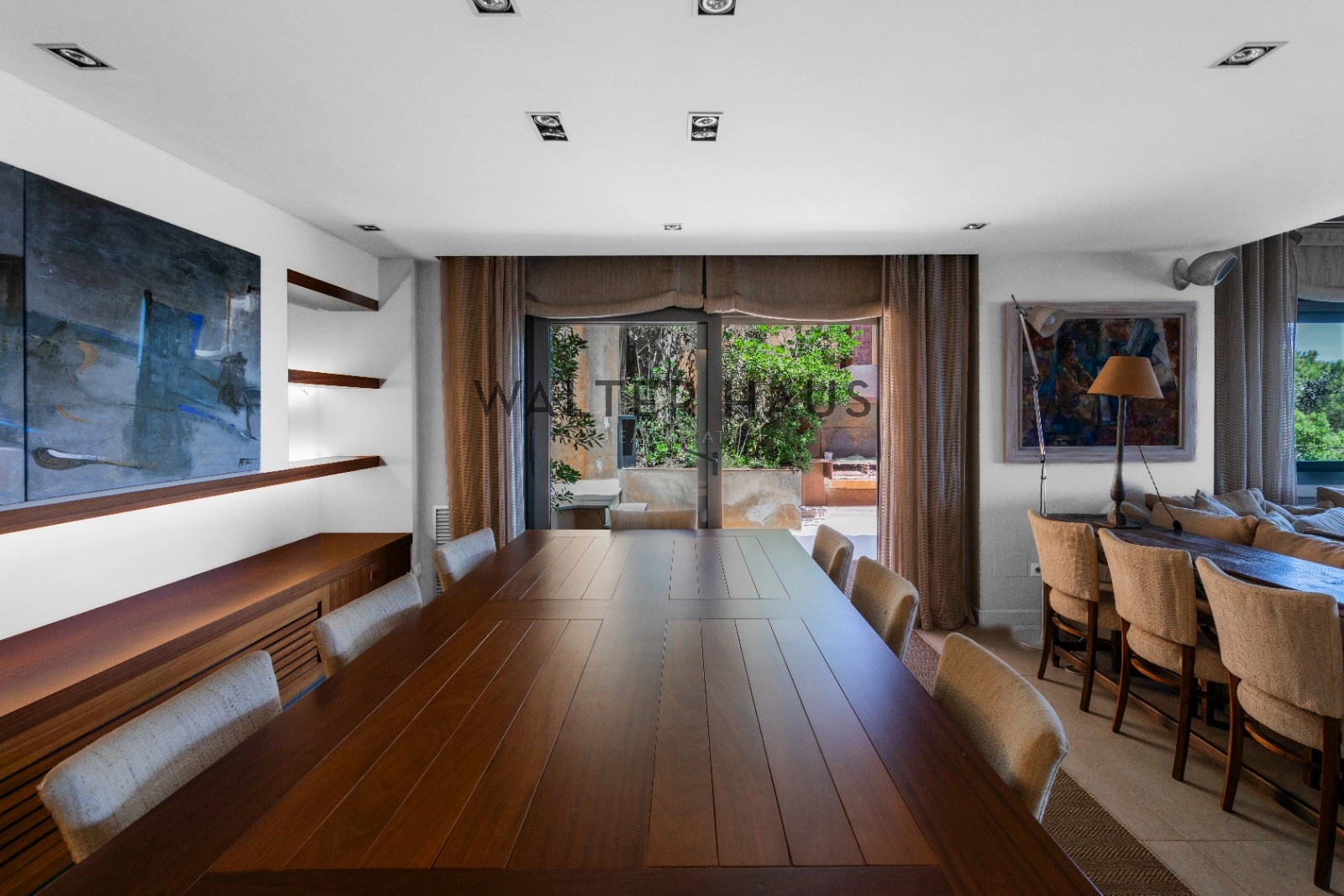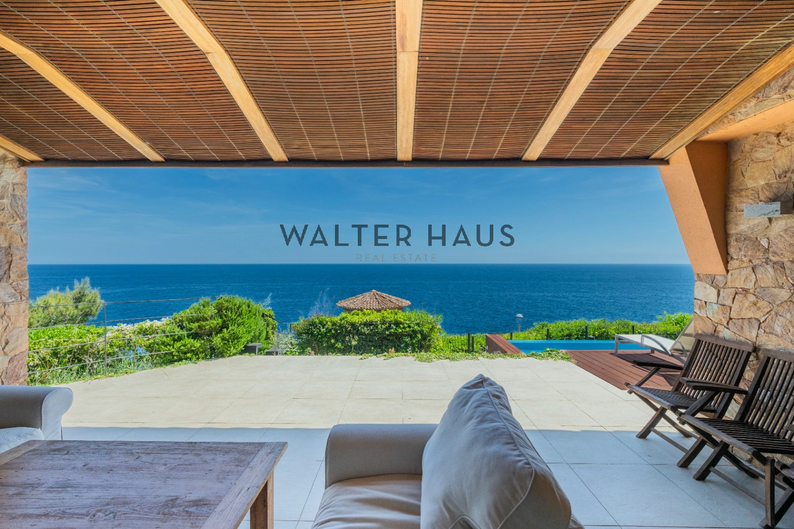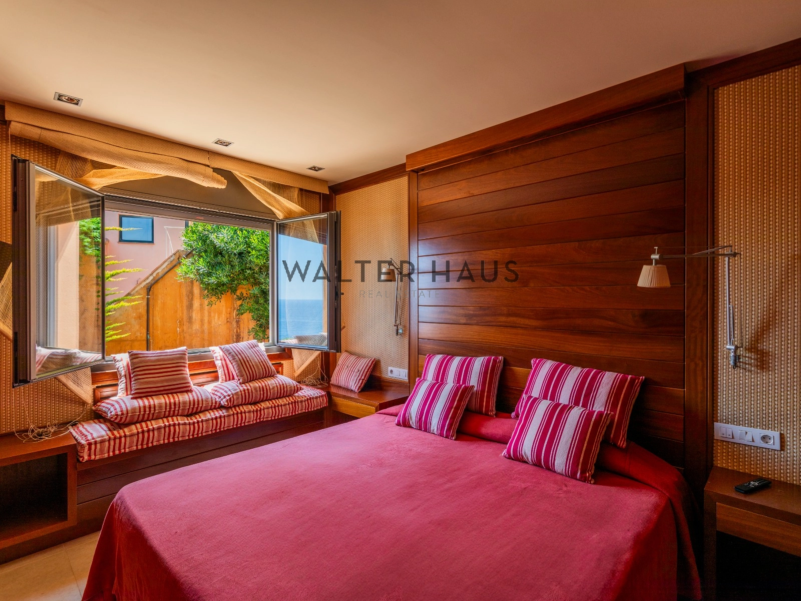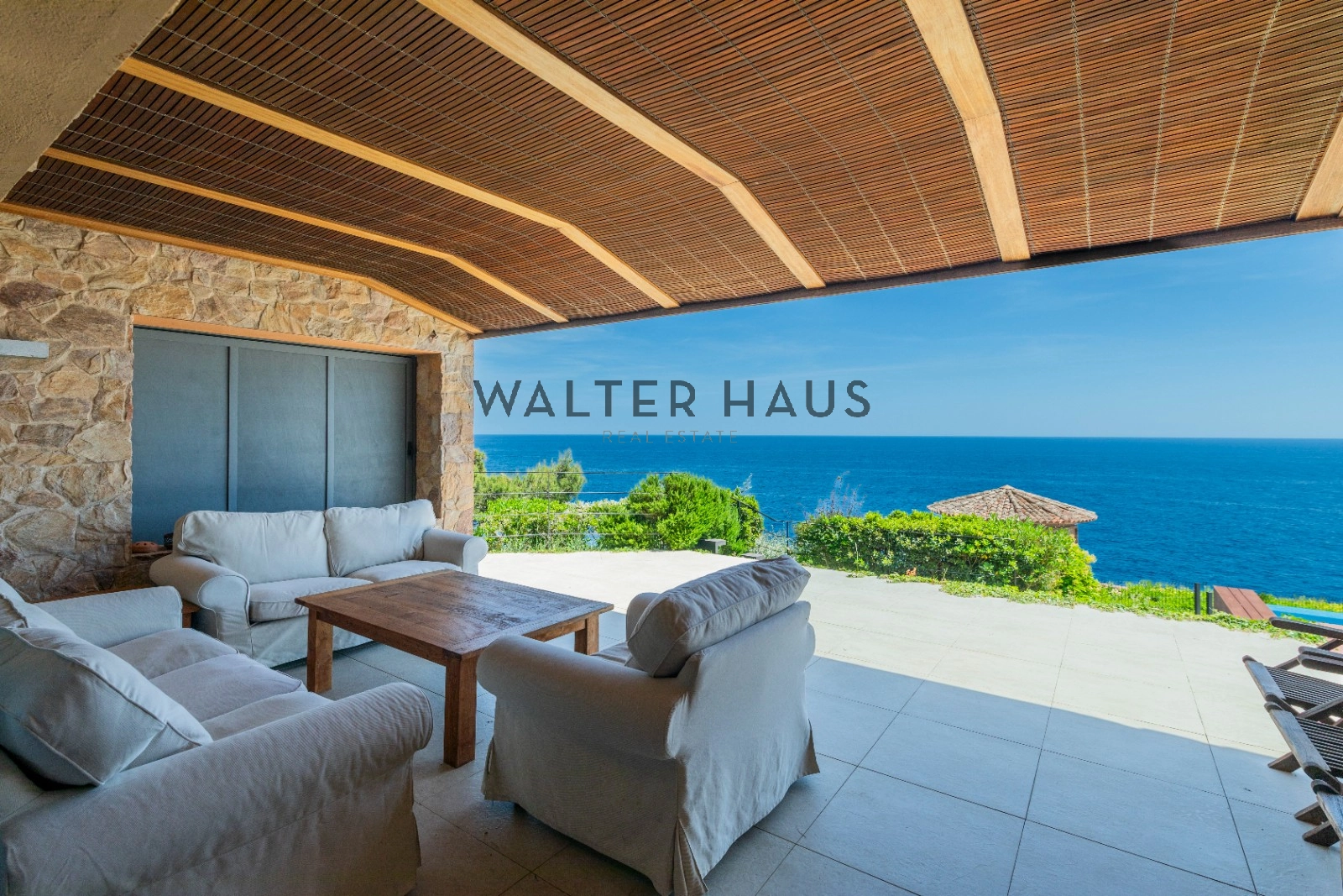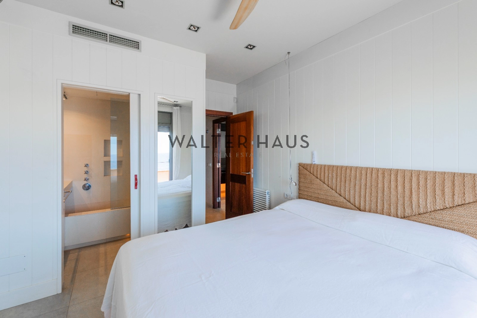 En la planta principal se encuentra un acogedor recibidor, un salón-comedor diáfano con acceso directo al jardín, porche cubierto y zona de barbacoa junto a la piscina de agua salada. También dispone de una cocina independiente totalmente equipada, aseo de cortesía y una suite principal con vistas despejadas al mar. La planta superior acoge cinco dormitorios dobles, tres de ellos con baño en suite y terrazas privadas, y dos que comparten un baño completo.