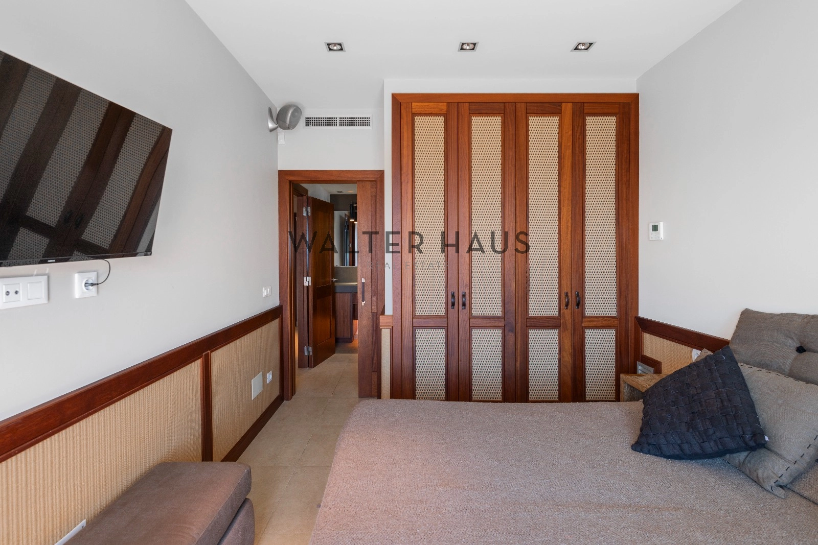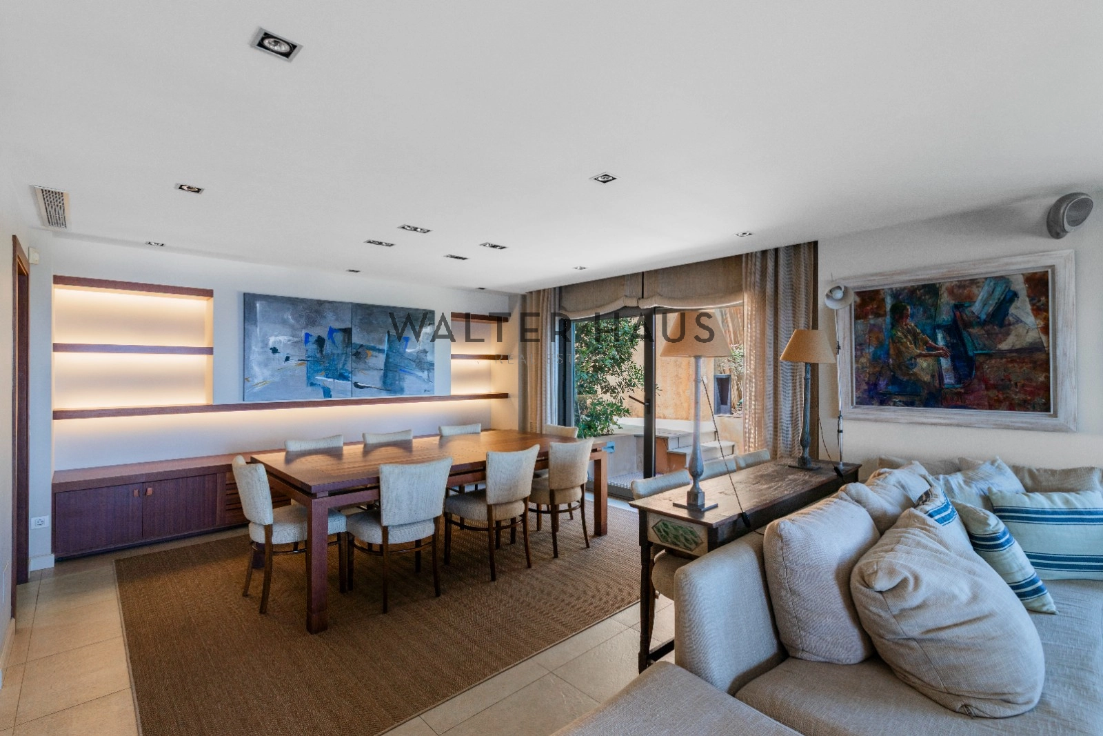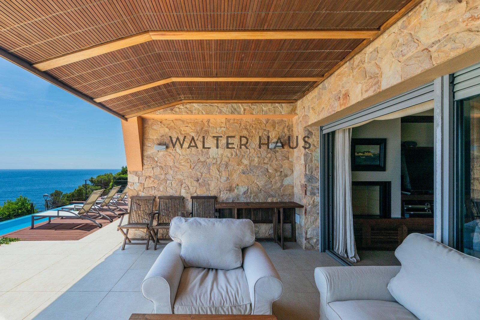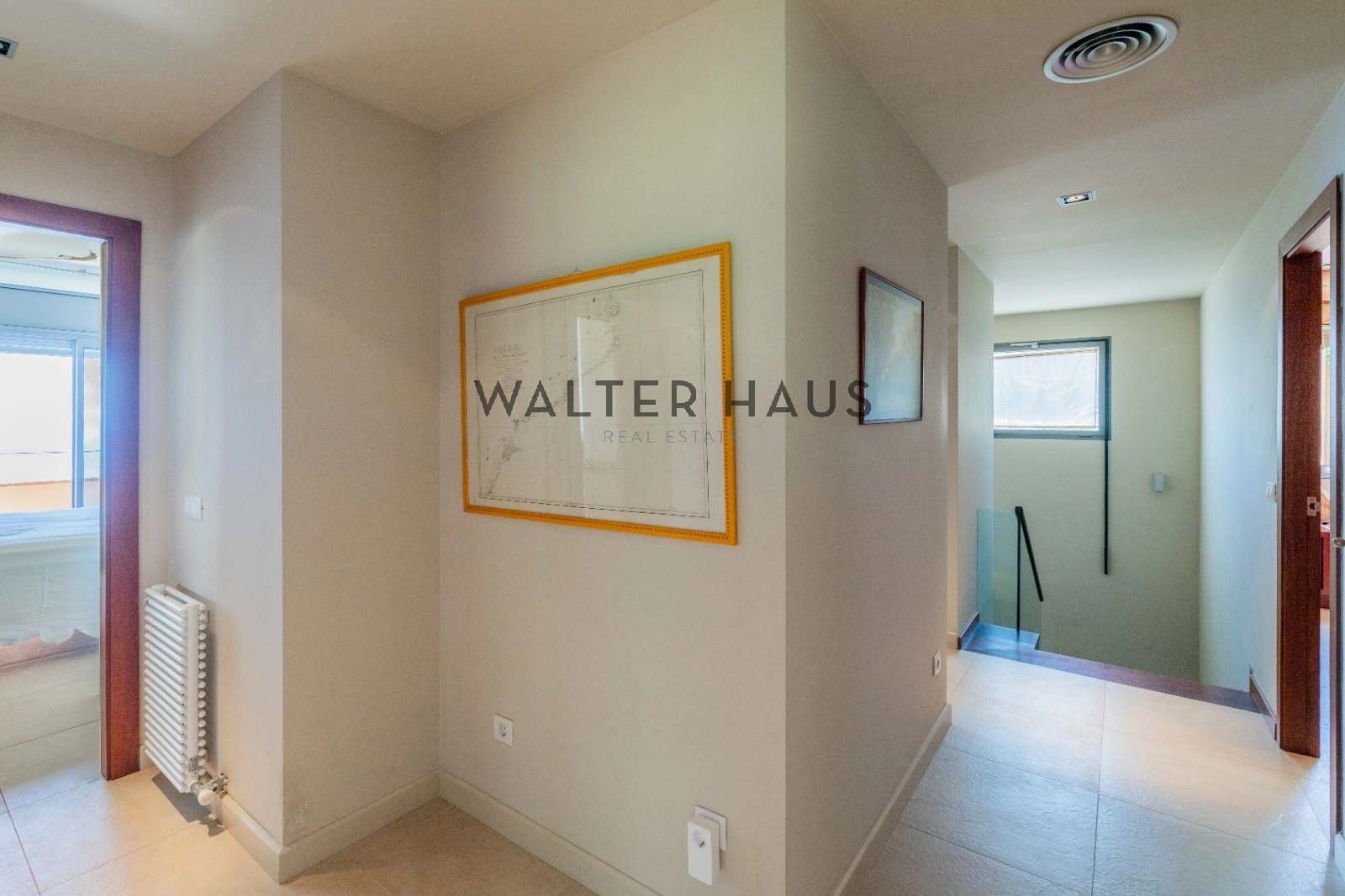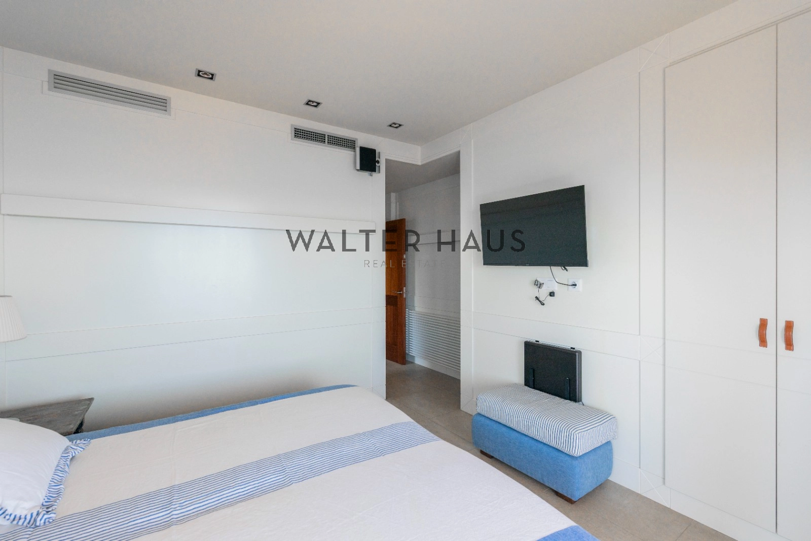 En la planta principal se encuentra un acogedor recibidor, un salón-comedor diáfano con acceso directo al jardín, porche cubierto y zona de barbacoa junto a la piscina de agua salada. También dispone de una cocina independiente totalmente equipada, aseo de cortesía y una suite principal con vistas despejadas al mar. La planta superior acoge cinco dormitorios dobles, tres de ellos con baño en suite y terrazas privadas, y dos que comparten un baño completo.