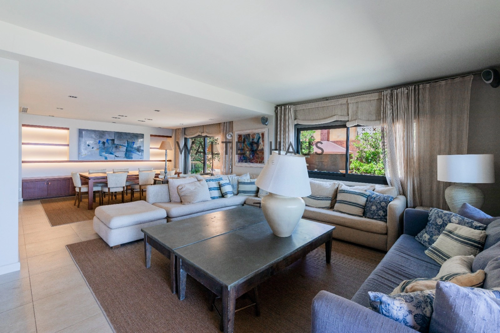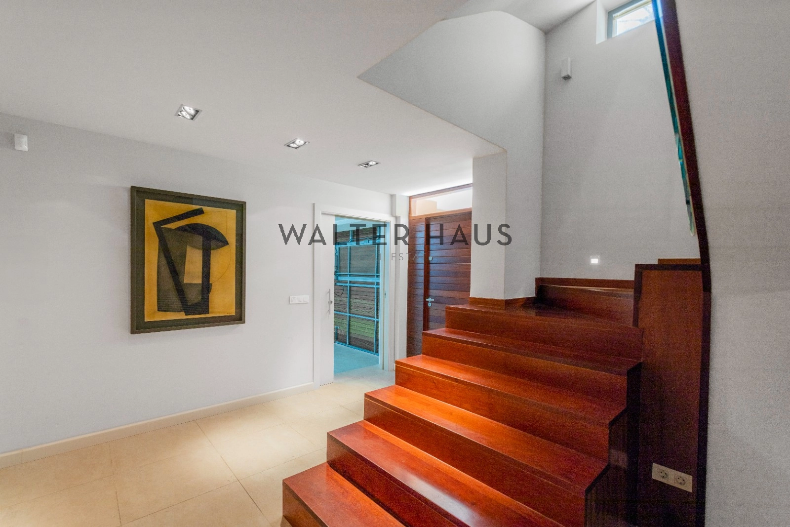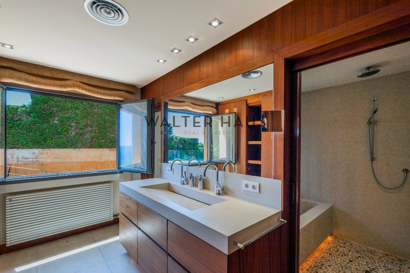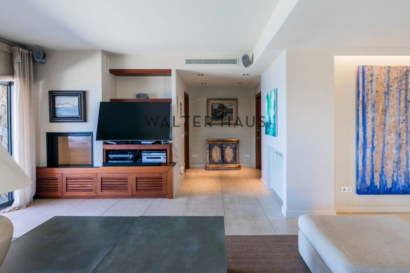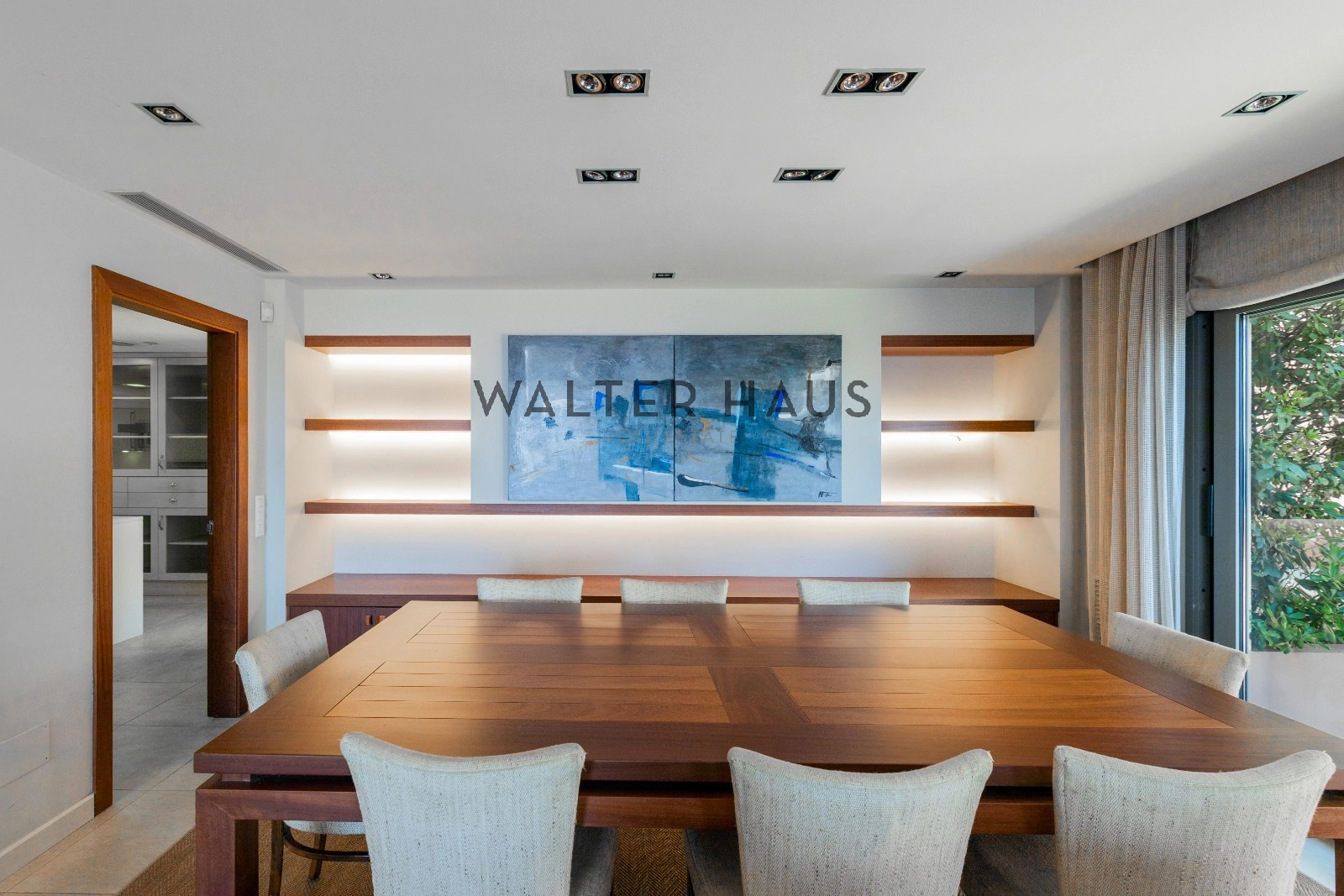 En la planta principal se encuentra un acogedor recibidor, un salón-comedor diáfano con acceso directo al jardín, porche cubierto y zona de barbacoa junto a la piscina de agua salada. También dispone de una cocina independiente totalmente equipada, aseo de cortesía y una suite principal con vistas despejadas al mar. La planta superior acoge cinco dormitorios dobles, tres de ellos con baño en suite y terrazas privadas, y dos que comparten un baño completo.