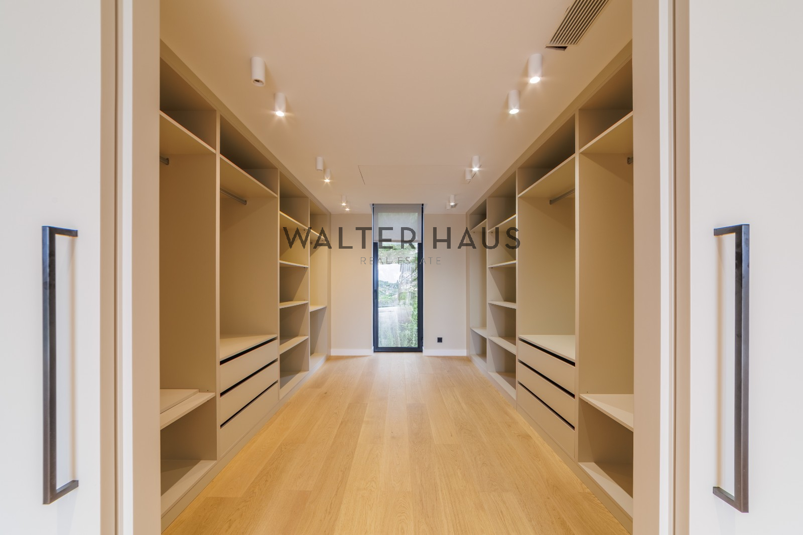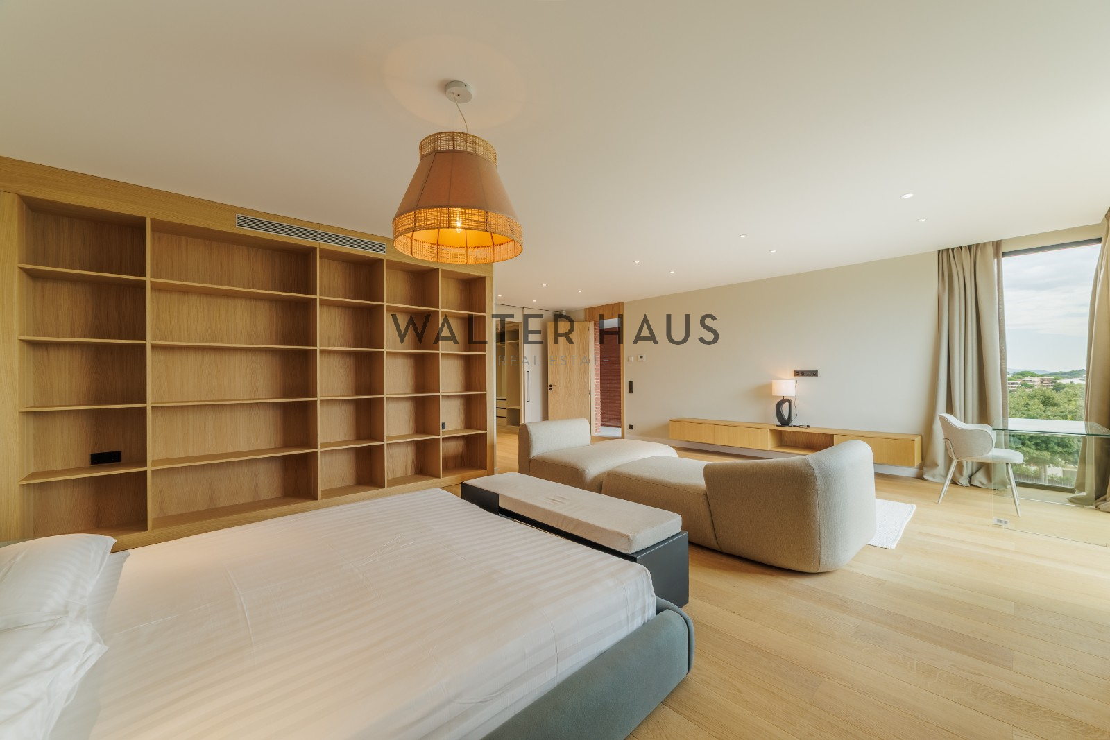 En la planta principal se encuentra un amplio salón-comedor con techos altos y chimenea de gas, conectado directamente con la terraza y la piscina infinity, lo que permite una integración fluida entre el interior y el exterior. La cocina, con isla de mármol y electrodomésticos de gama alta integrados, destaca por su diseño elegante y funcionalidad. Esta planta se completa con un baño de cortesía. En las plantas superiores se distribuyen cinco habitaciones en suite, todas con vestidor, algunas con vistas a la playa de Sant Pol y otras orientadas al jardín, así como una zona polivalente ideal como espacio de trabajo o descanso. En la planta superior, la master suite incluye un dormitorio doble, vestidor doble tipo closet y bañera con vistas, creando un ambiente único y privado. En la planta inferior se sitúan el garaje con capacidad para varios vehículos, el cuarto técnico y una habitación de servicio.
