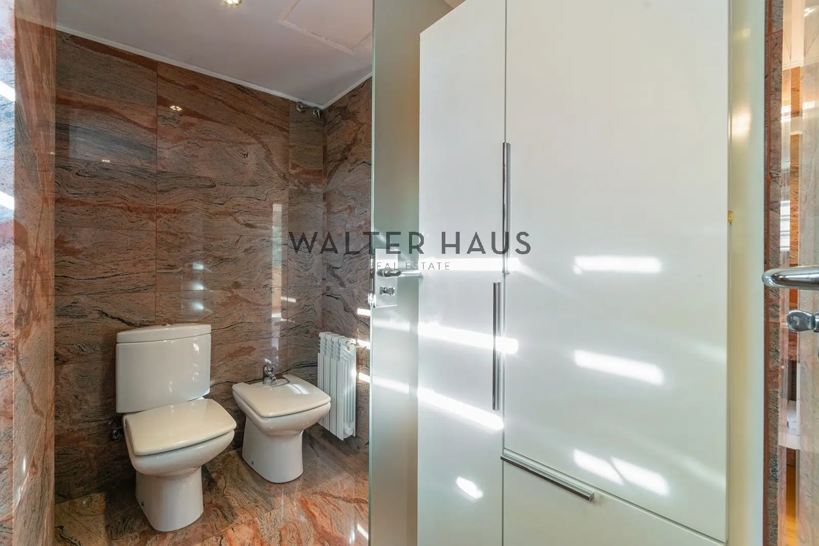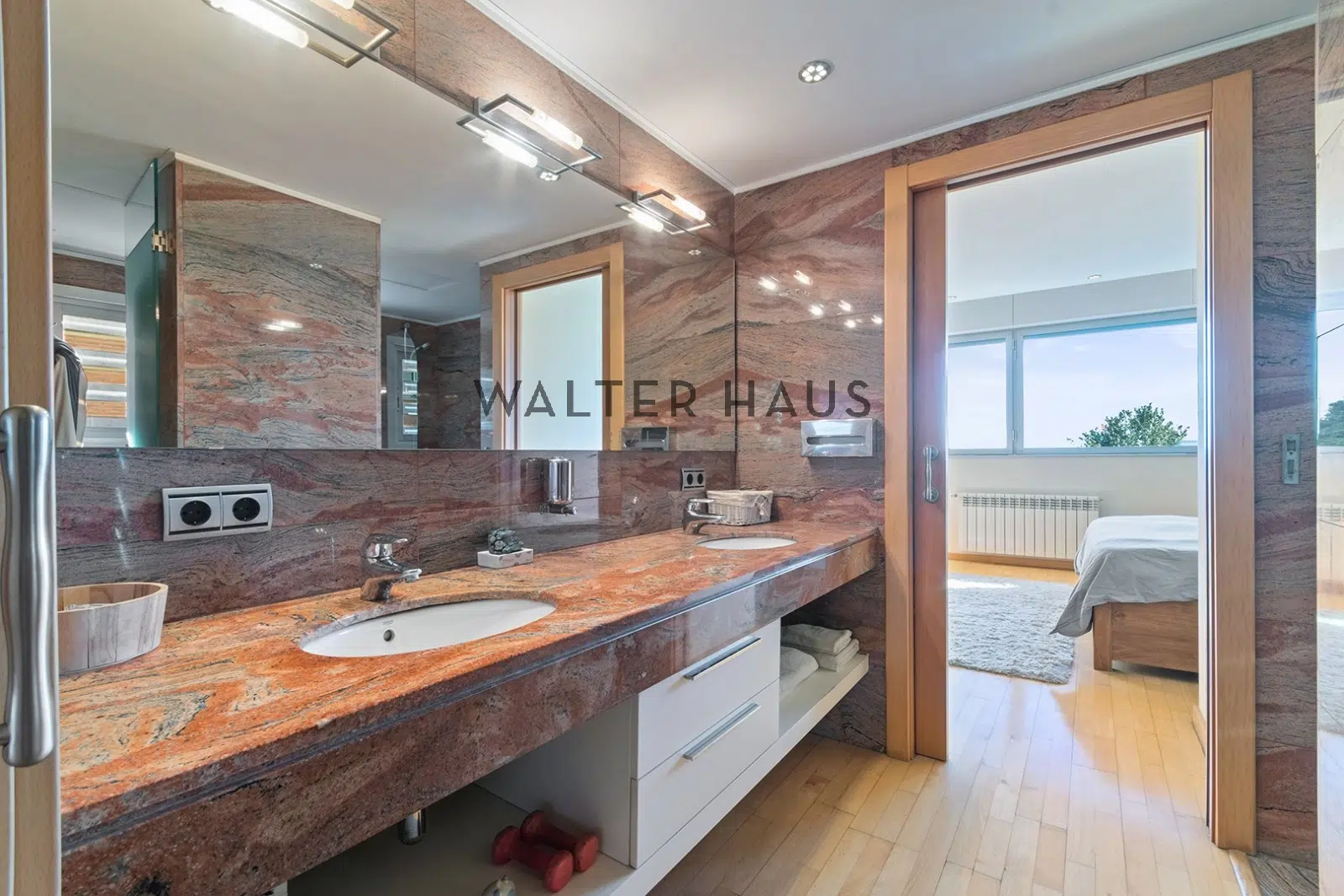 En su interior, la vivienda ofrece espacios cuidadosamente diseñados. La planta baja dispone de dos dormitorios dobles con armarios empotrados y dos baños. La planta superior incluye un dormitorio principal con baño en suite, vestidor y vistas al jardín, además de otro dormitorio doble ideal para oficina o descanso. La planta inferior presenta una elegante cocina con isla y comedor, conectados al salón y a una terraza exterior de 90 m². Además, el sótano ofrece 77 m² para almacenamiento y un amplio garaje de 113 m². Consta de ascensor.